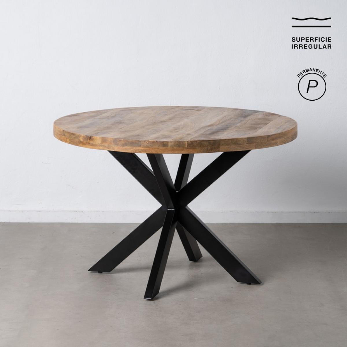 MESA COMEDOR NATURAL-NEGRO MADERA-HIERRO 120 X 120 X 79 CM Material: madera de mango, hierro. Grosor del sobre: 6cm. Patas: 4x8cm. La superficie del sobre puede no ser totalmente lisa debido a su fabricación manual con listones de madera maciza.