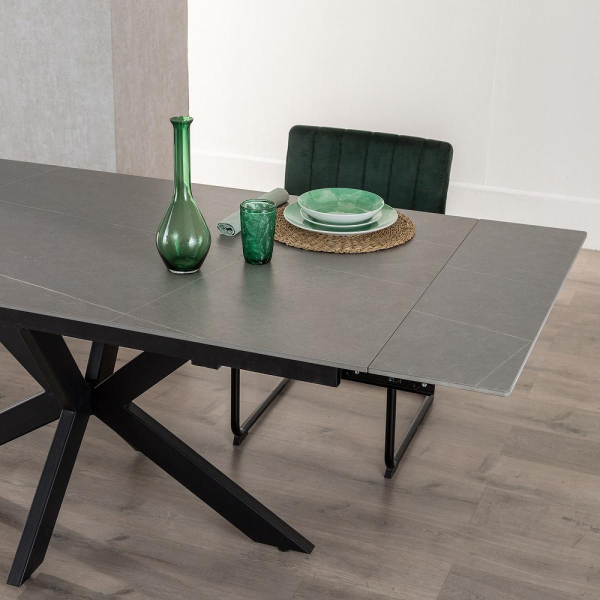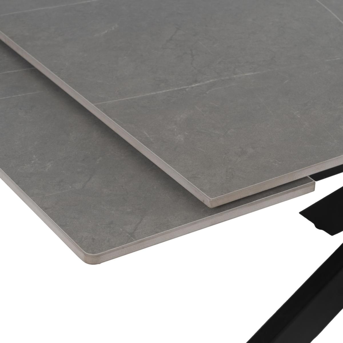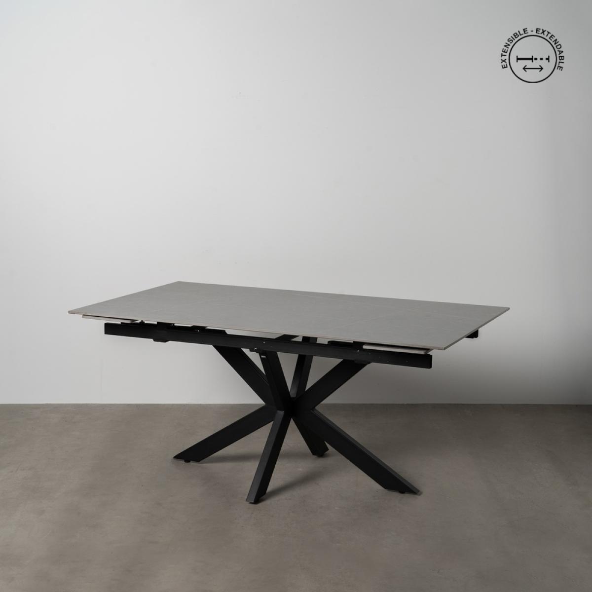 MESA EXTENSIBLE GRIS-NEGRO 170 X 90 X 76 CM Material: patas de metal (hierro) - top cerámico imitación mármol Mesa extensible, largo total 220cm. Grueso tablero: 1cm. Para montar.