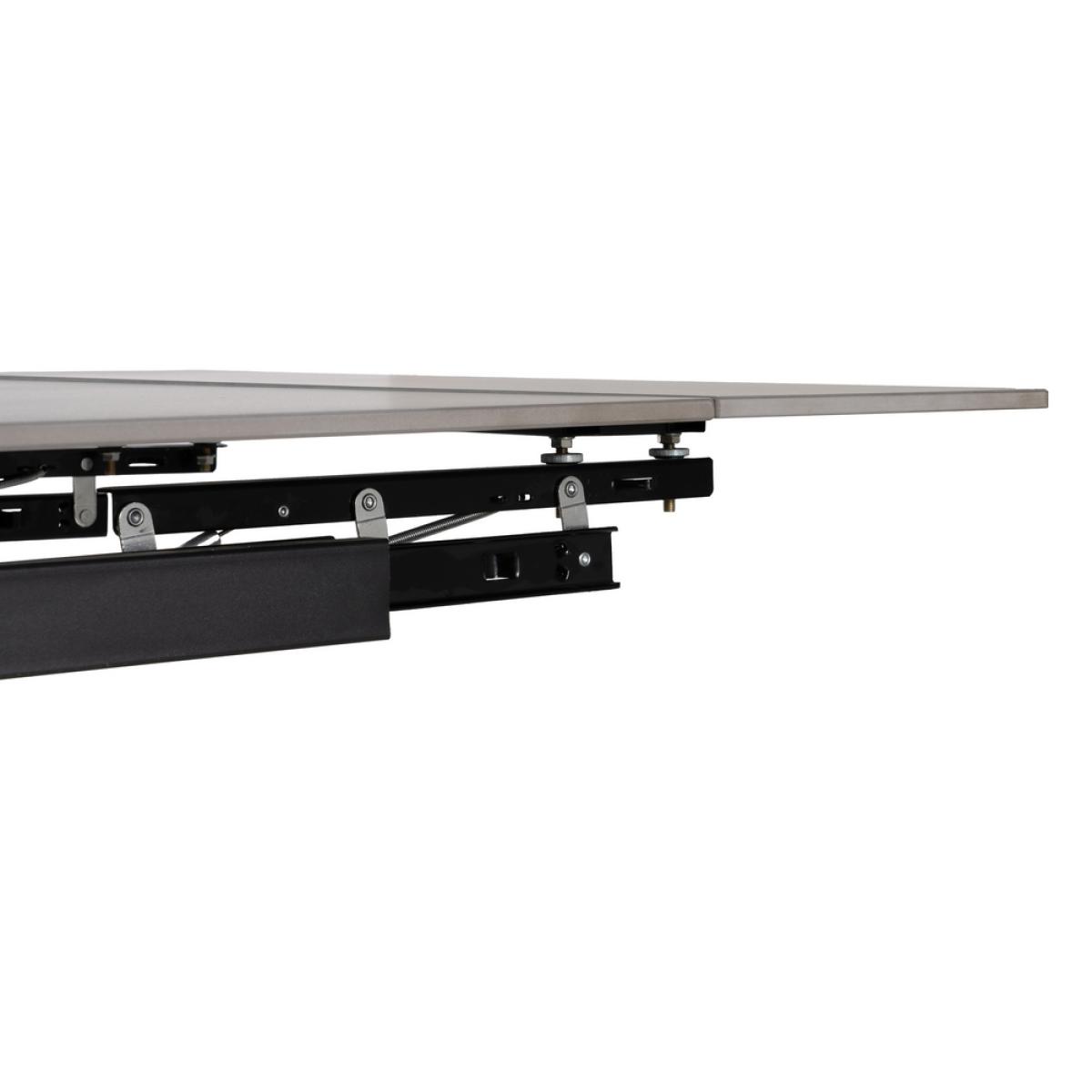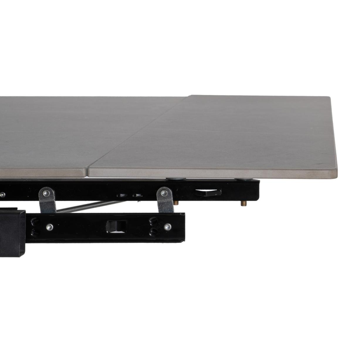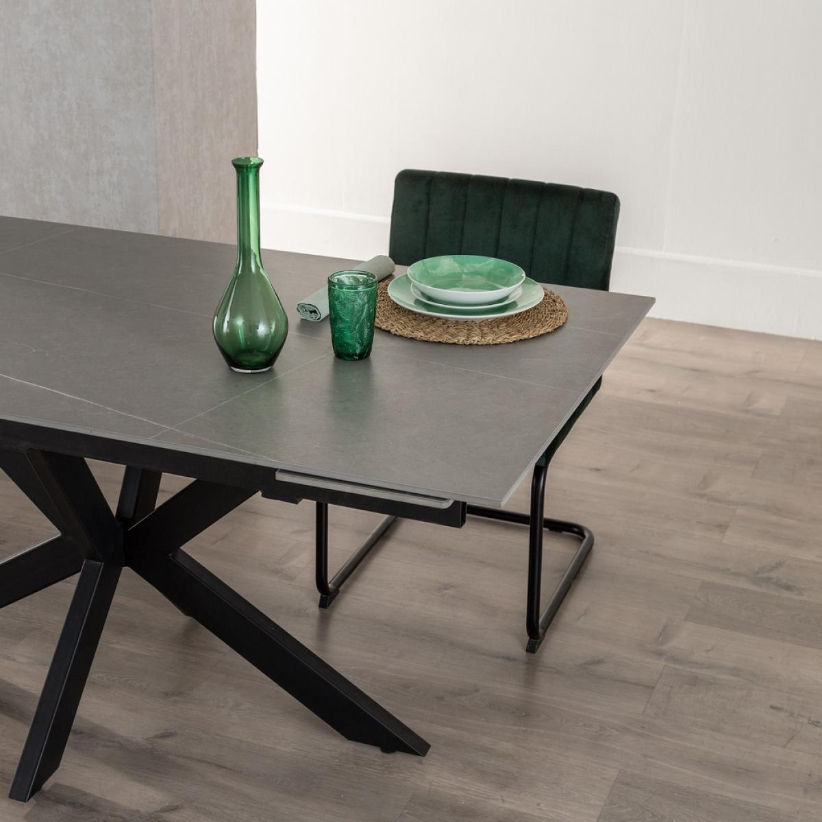 MESA EXTENSIBLE GRIS-NEGRO 170 X 90 X 76 CM Material: patas de metal (hierro) - top cerámico imitación mármol Mesa extensible, largo total 220cm. Grueso tablero: 1cm. Para montar.
