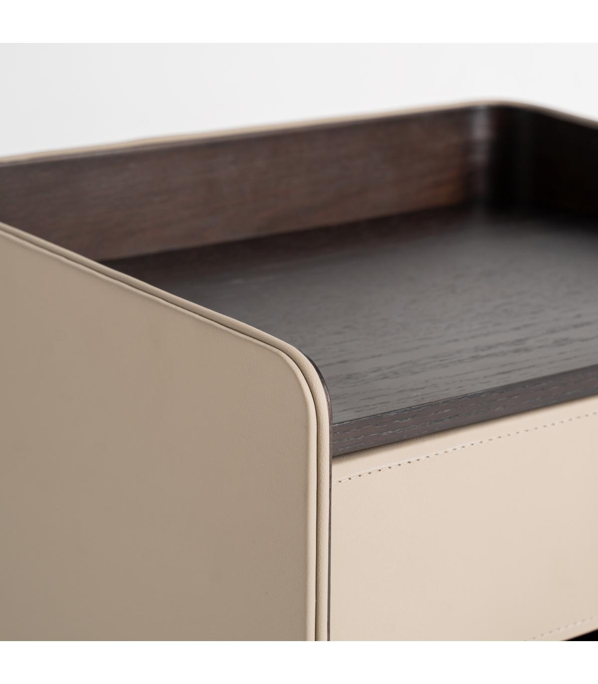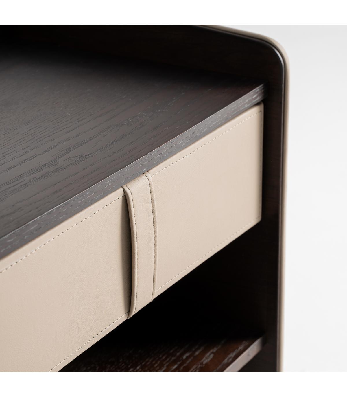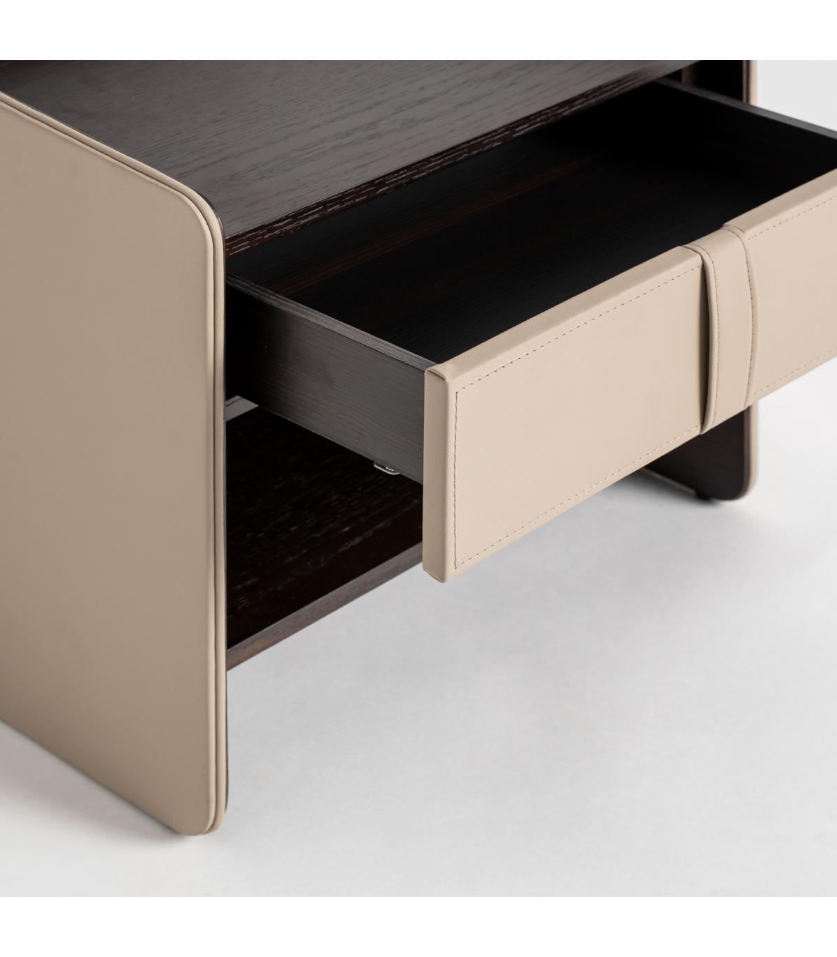 Mesita de noche Tahua de estilo contemporáneo fabricado en madera contrachapada en color marrón combinado con chapa de roble en color marrón y polipiel en color beige.