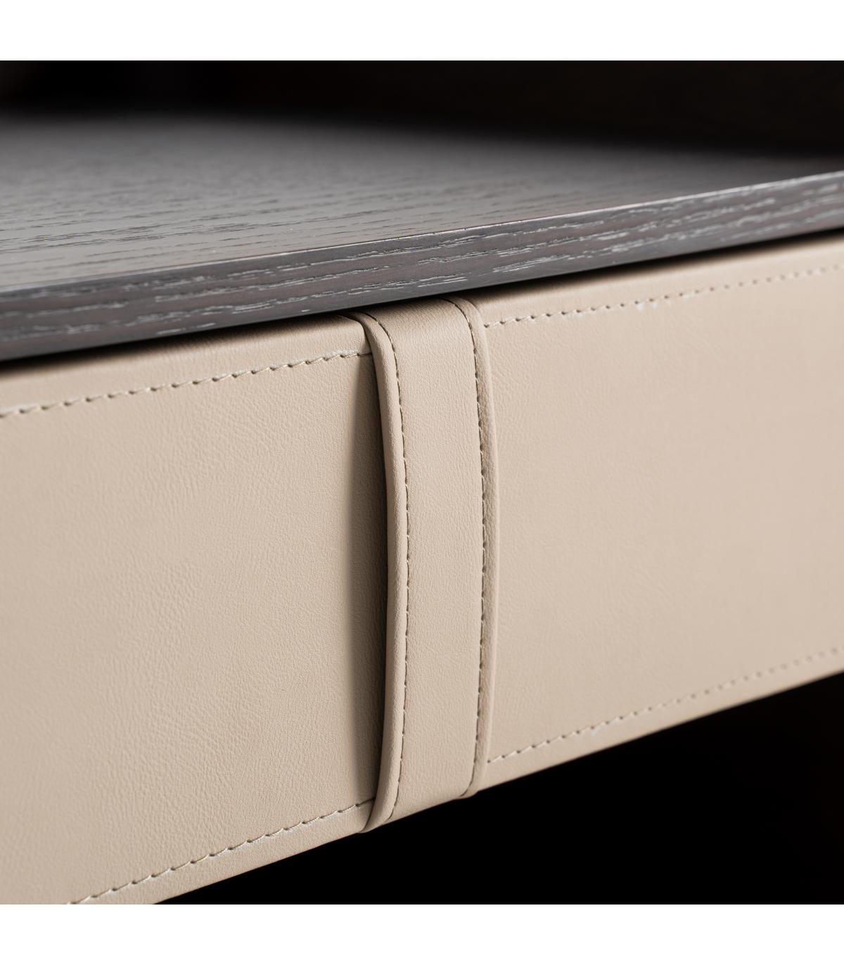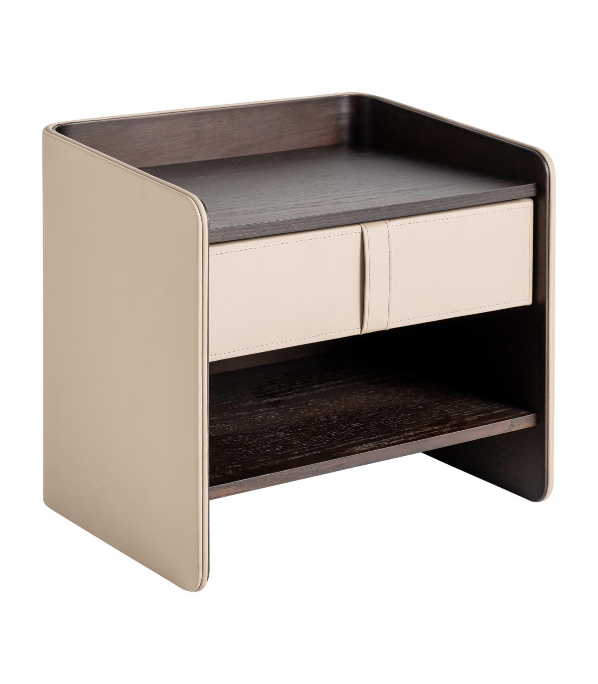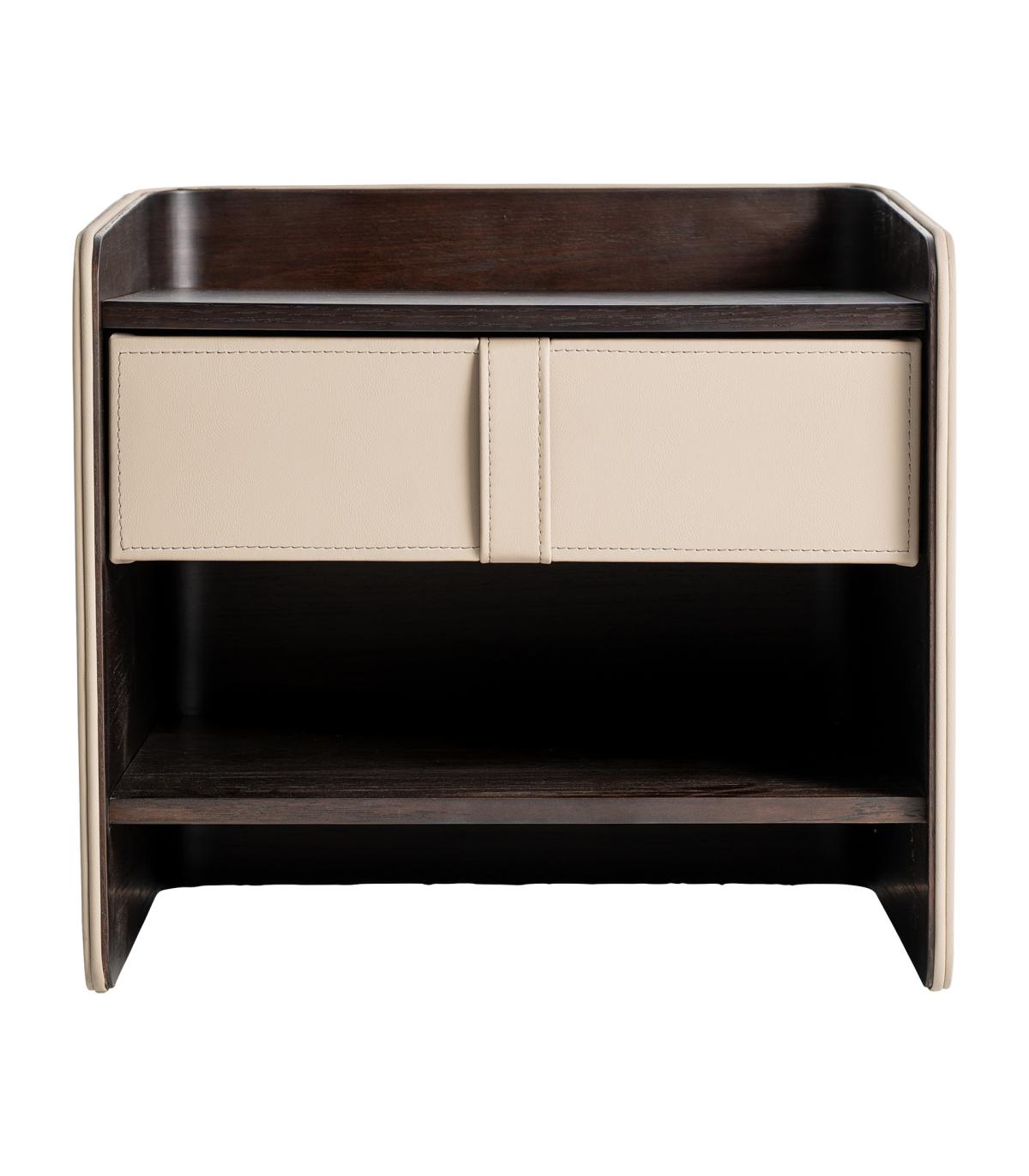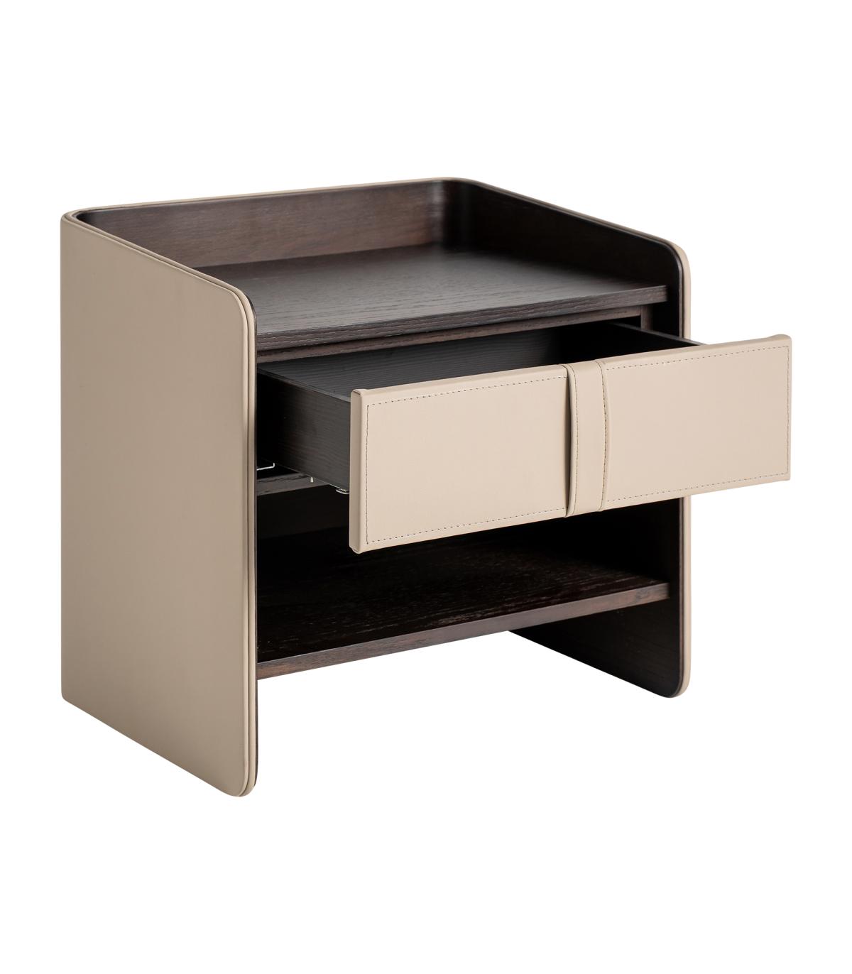 Mesita de noche Tahua de estilo contemporáneo fabricado en madera contrachapada en color marrón combinado con chapa de roble en color marrón y polipiel en color beige.