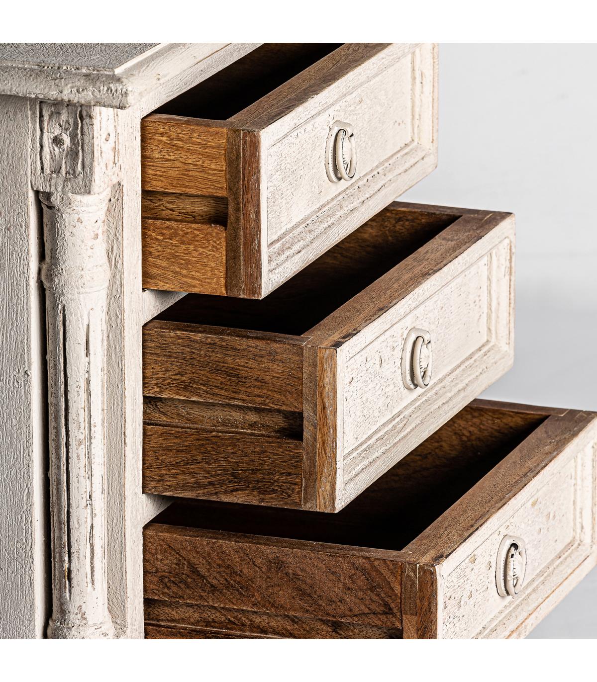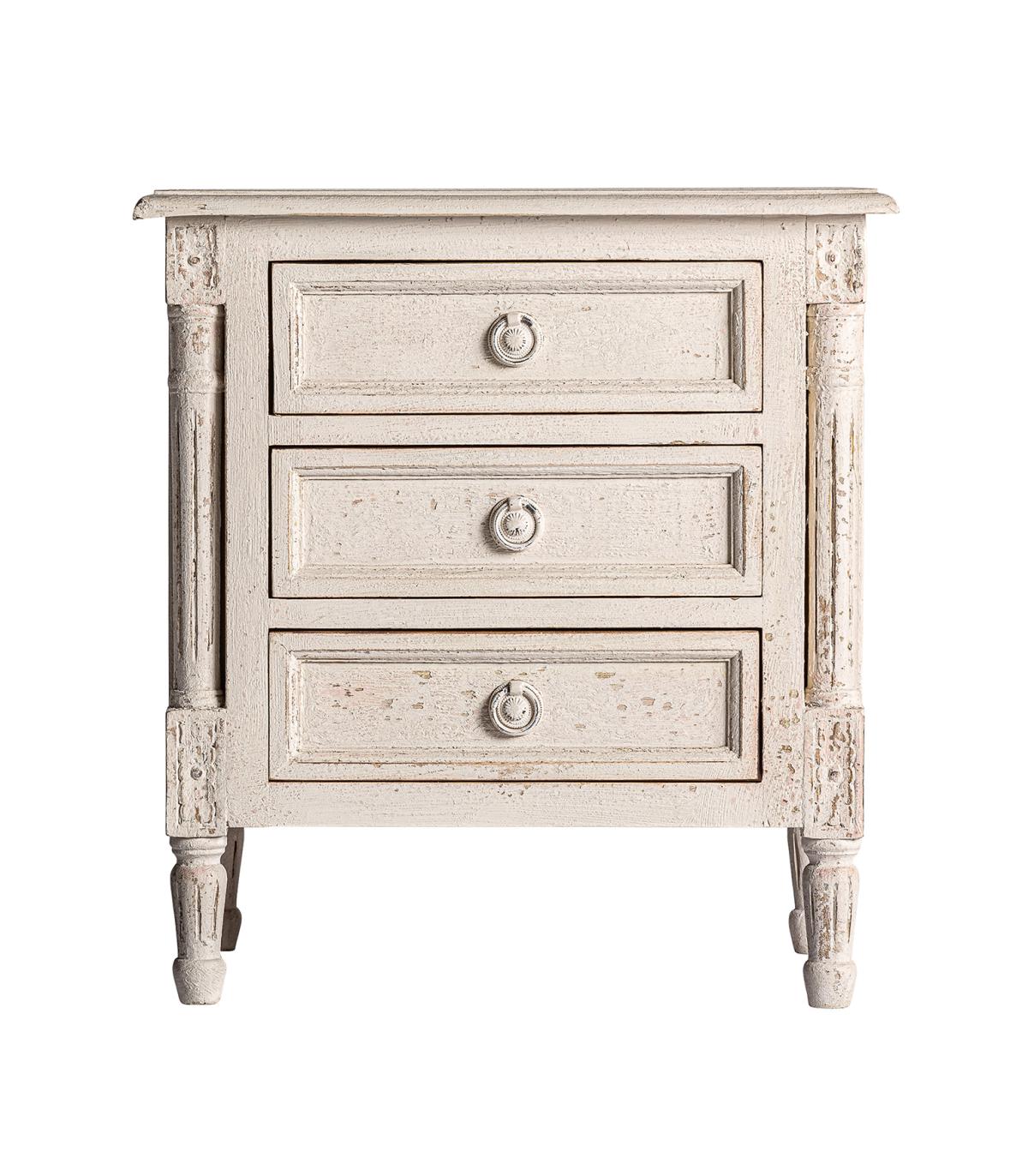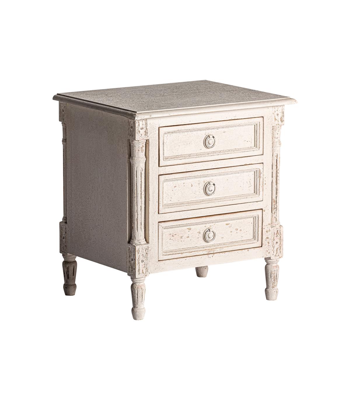Mesita de noche pisek de estilo provenzal fabricado en madera de mango en color blanco roto.
