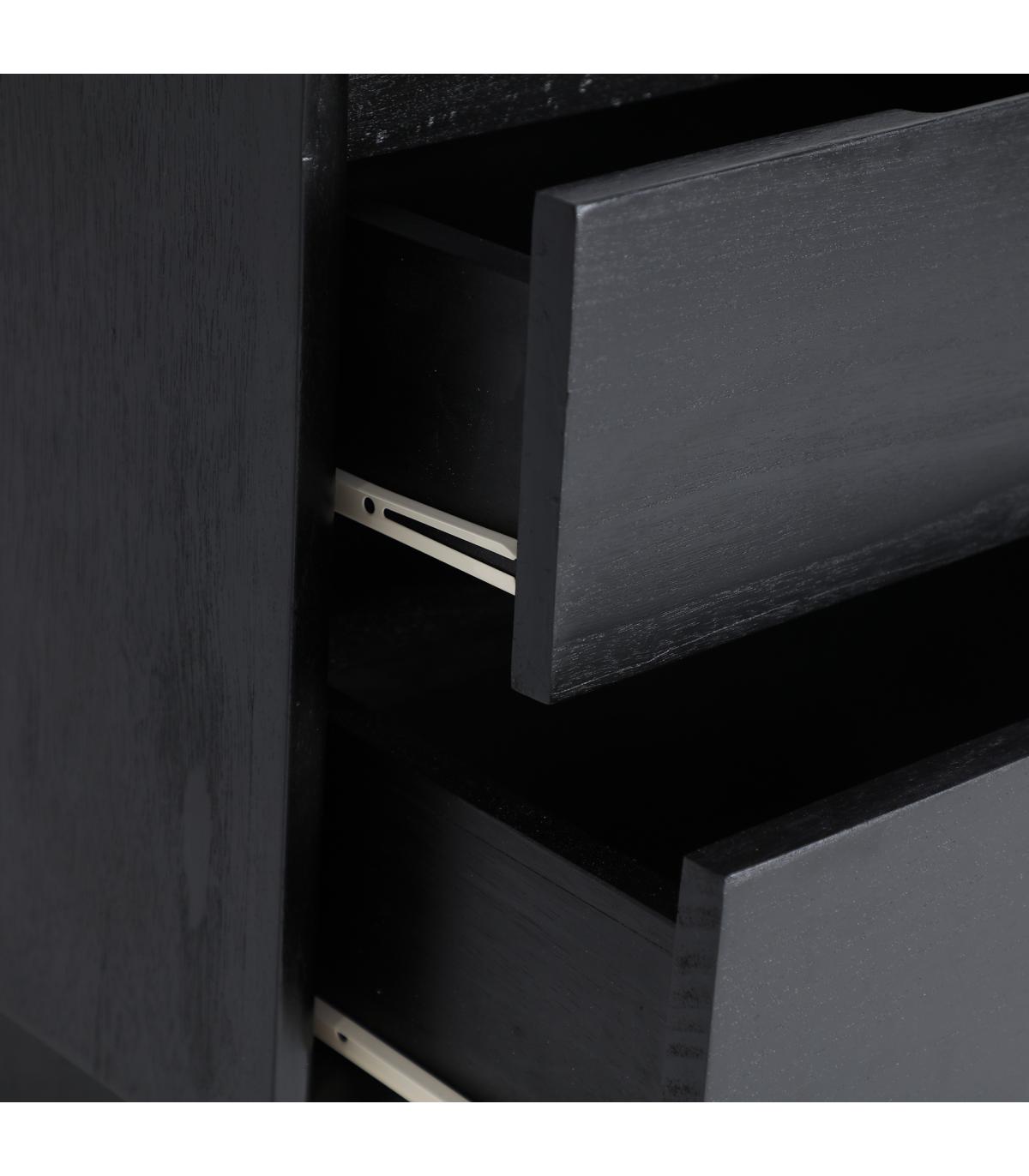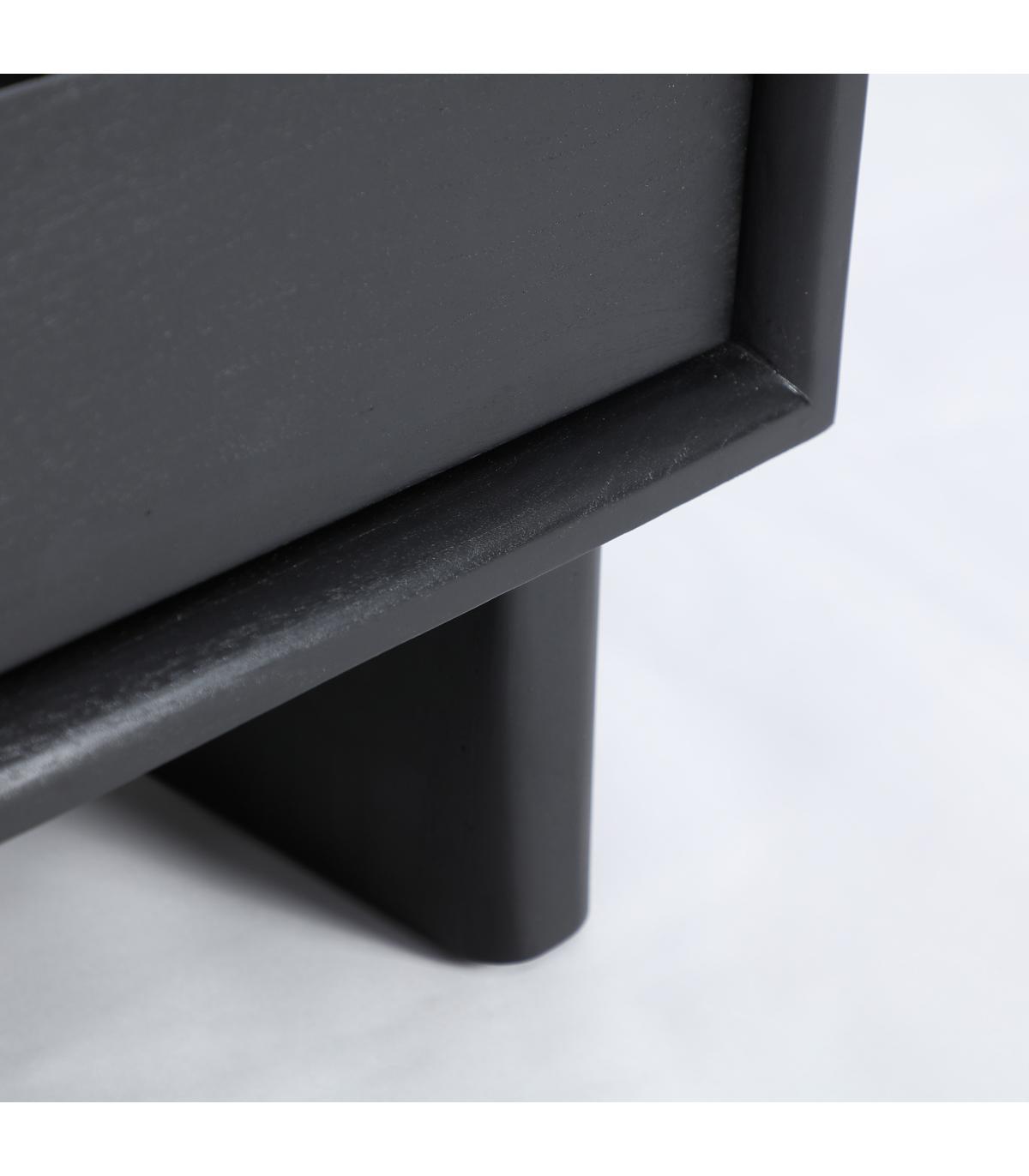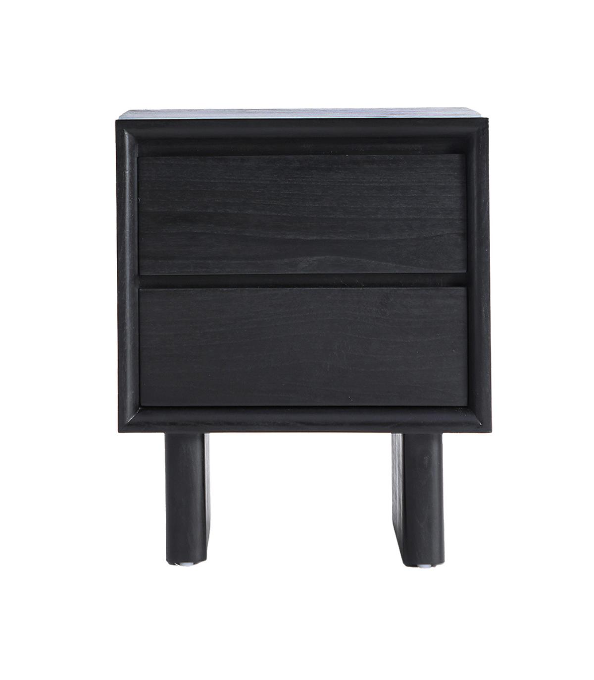 Mesita de noche Demmin de estilo contemporáneo, fabricado en madera mindi en color negro. Producto desmontable.