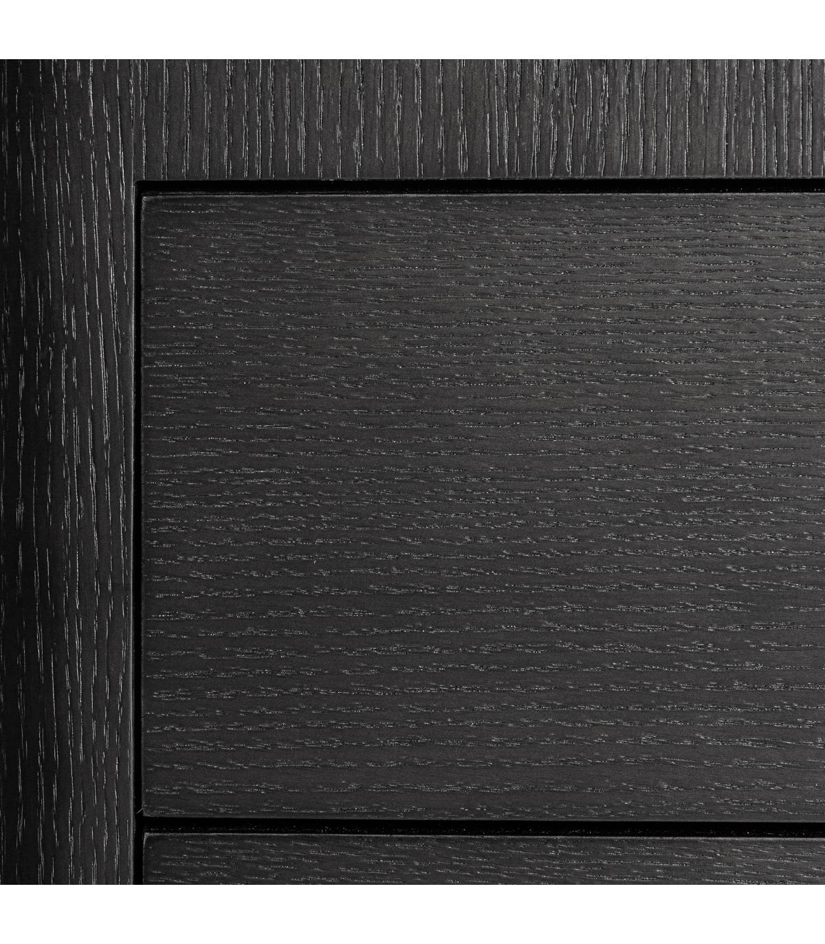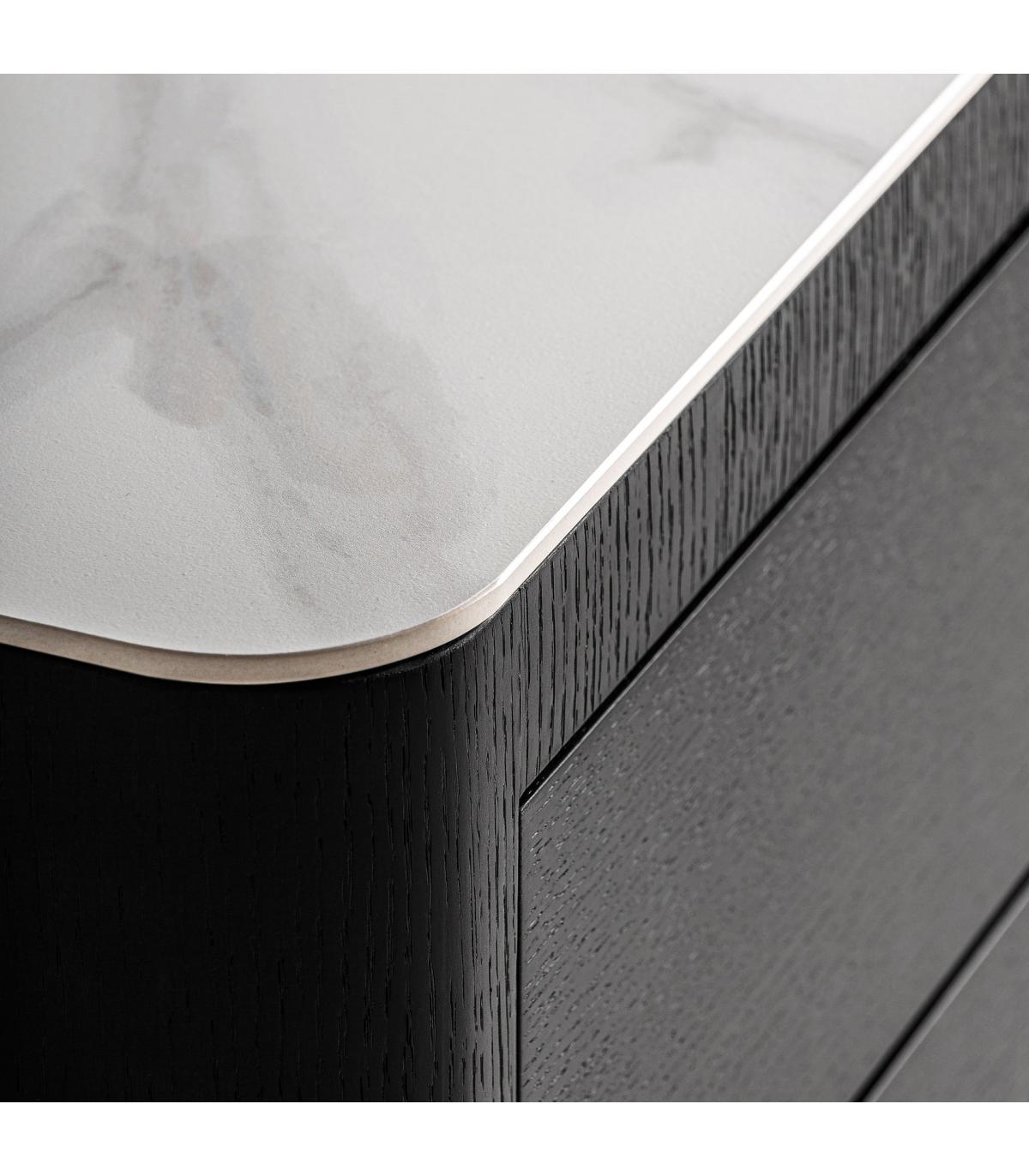Mesita de noche Wholen de estilo art deco fabricado en madera dm en color negro combinado con chapa de roble en color gris y piedra sinterizada en color blanco.