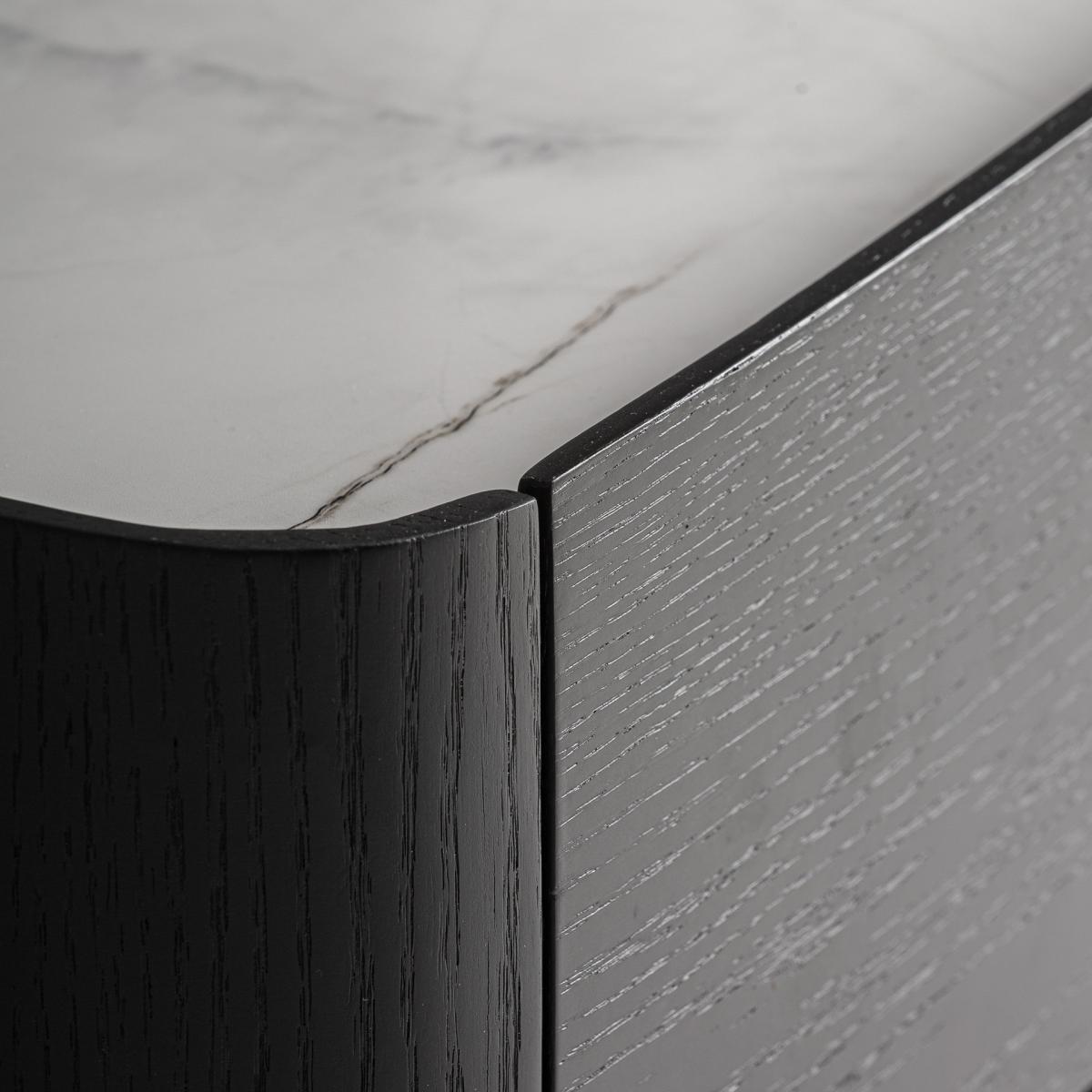 Mesita de noche Haesa de estilo contemporáneo fabricado en madera contrachapada en color negro combinado con chapa de roble en color negro y piedra sinterizada en color negro.