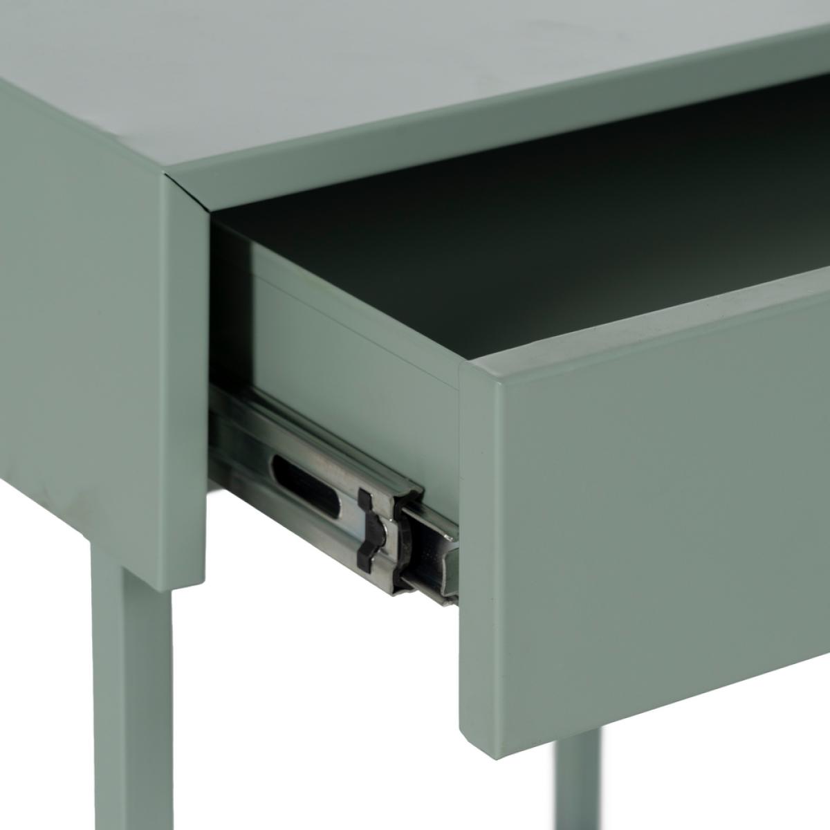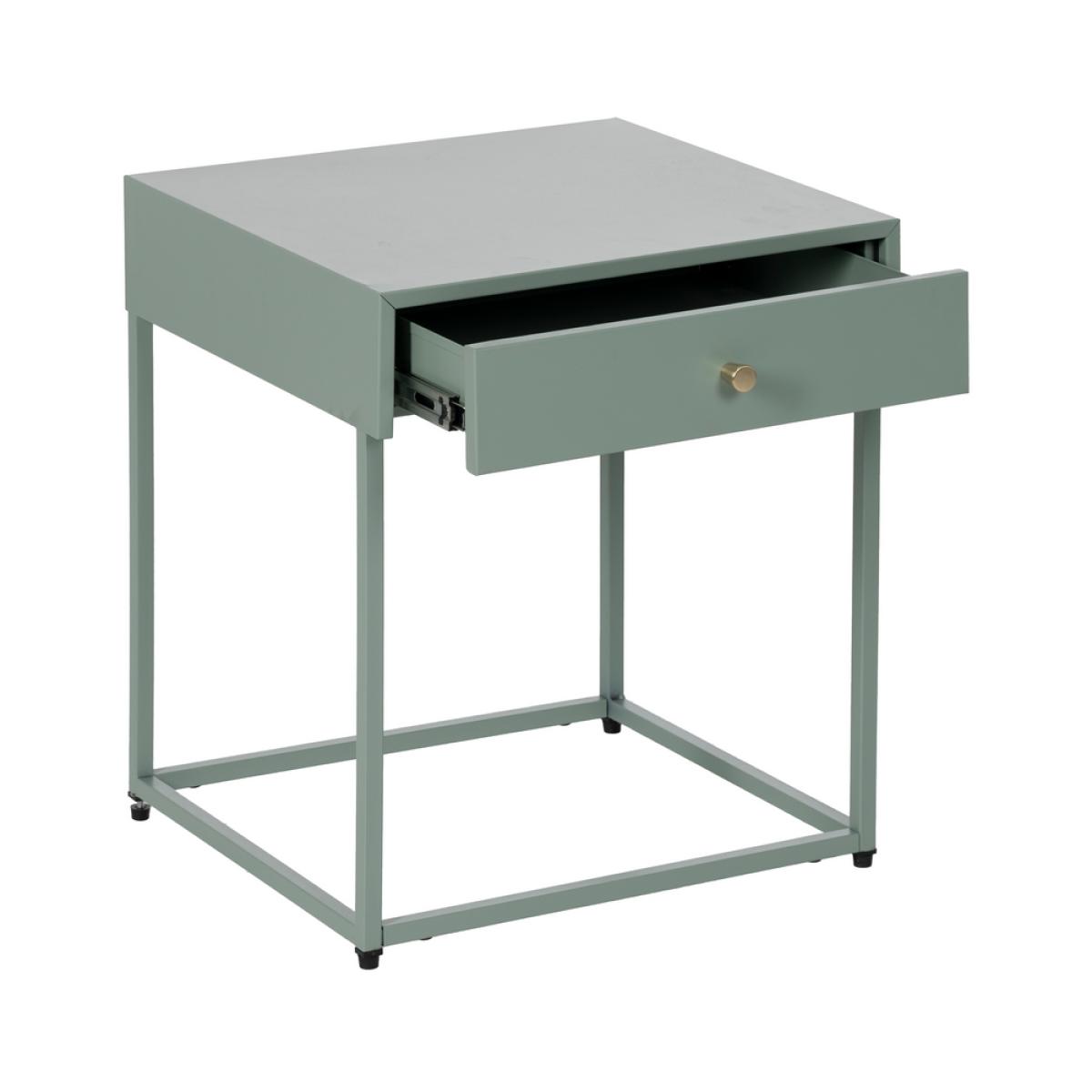 MESITA VERDE ACERO 43 X 41 X 50 CM REQUIERE MONTAJE. Altura patas:39,4cm. Cajón:36,5x35x6cm. Tirador dorado:1,8x1,8cm. Acabado mate.