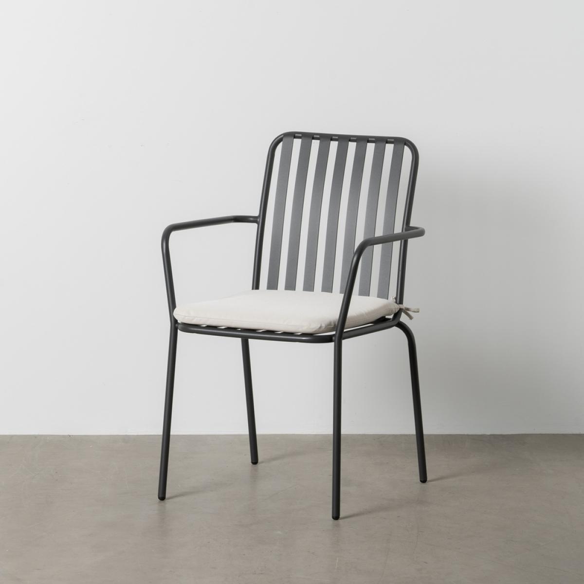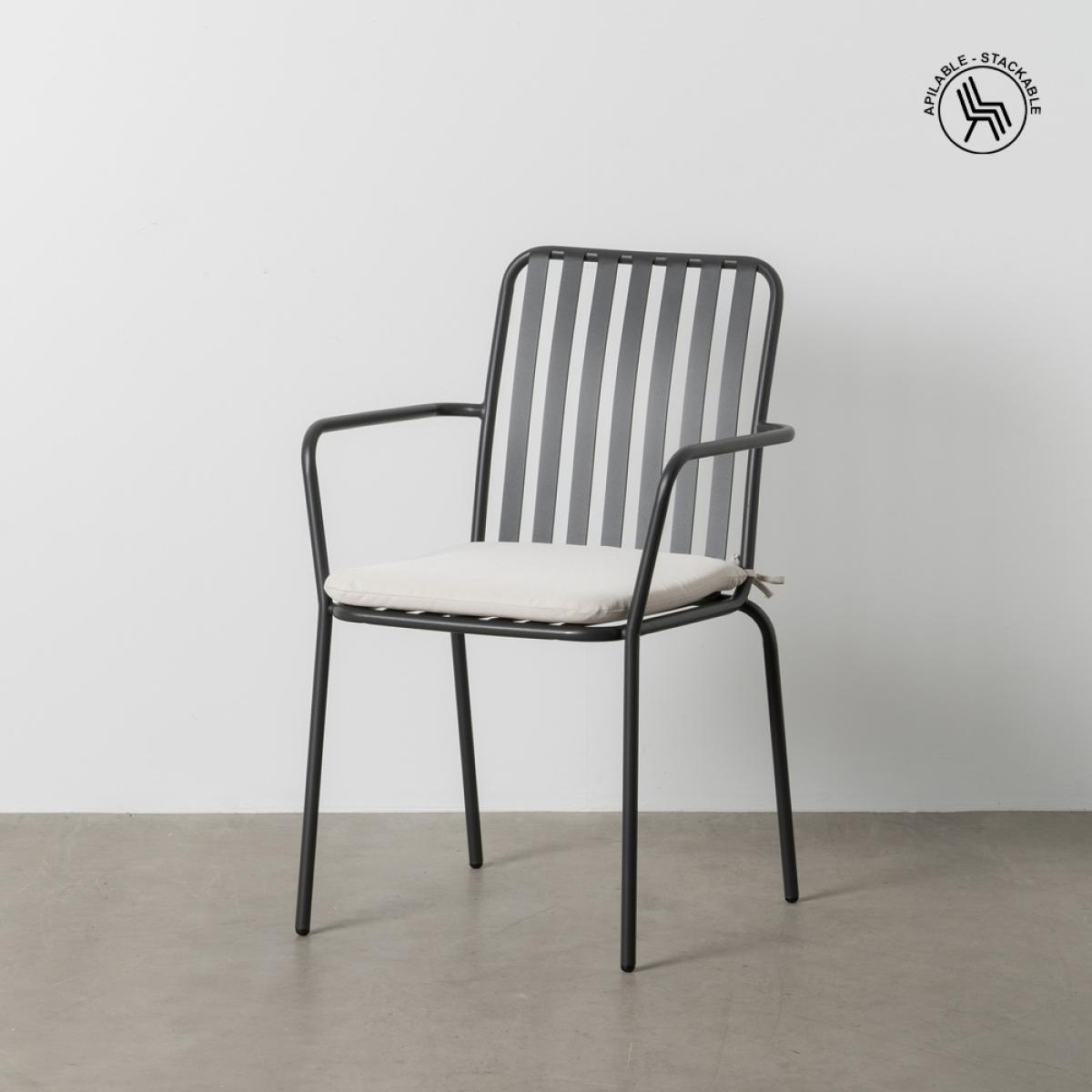 SILLA ANTRACITA ACERO EXTERIOR 56 X 57 X 87 CM Material: acero. Altura asiento: 44cm. Ancho asiento: 41,5cm. Profundidad asiento: 45cm. Altura respaldo: 42,5cm. Altura reposabrazos: 20cm. Apilable.