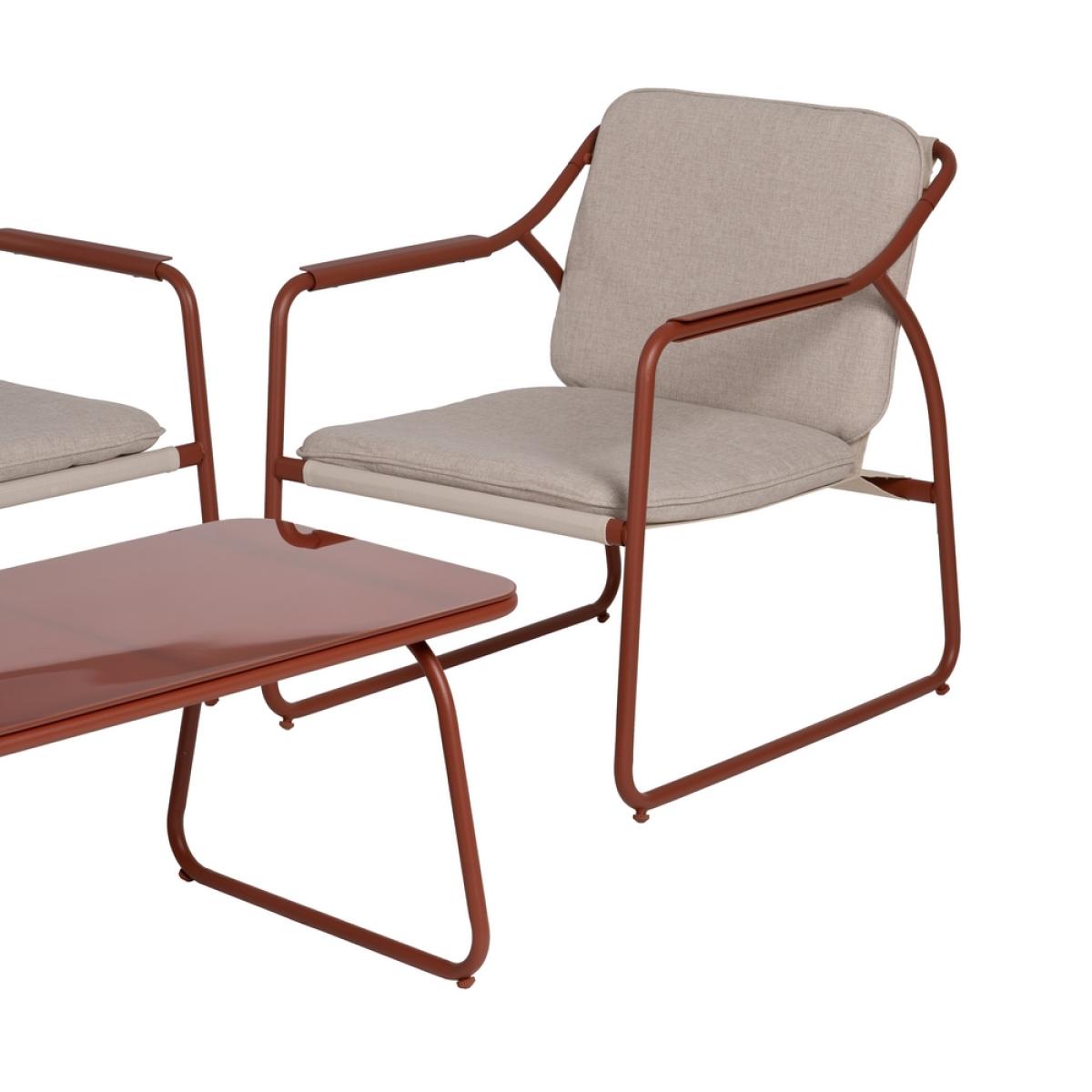 CONJUNTO JARDÍN ACERO EXTERIOR 1 CM Incluye 1 sofá (118x72,5x75cm), 2 sillones (60x72,5x75cm) y 1 mesa de centro (85x45x41cm). Estructura de acero, tablero de la mesa de cristal templado. Base de los asientos de textileno (70% PVC, 30% poliéster). Tejido de los cojines 100% olefina. Relleno de 5cm de algodón + foam densidad 22 + algodón (3 capas). Altura asientos: 42cm. Ancho asiento: 110cm (sofá), 57cm (sillones). Profundidad asiento: 53cm. Altura respaldo: 41cm. Altura reposabrazos: 21cm. Cumple la normativa EN581 (uso exterior). Los muebles y productos de exterior son aptos para permanecer a la intemperie durante la temporada, sin embargo se recomienda colocarlos bajo techado o protegerlos de la lluvia, ya que el tejido no es a prueba de agua. Una vez acabada la temporada, se recomienda guardar o proteger adecuadamente para asegurar su mantenimiento.