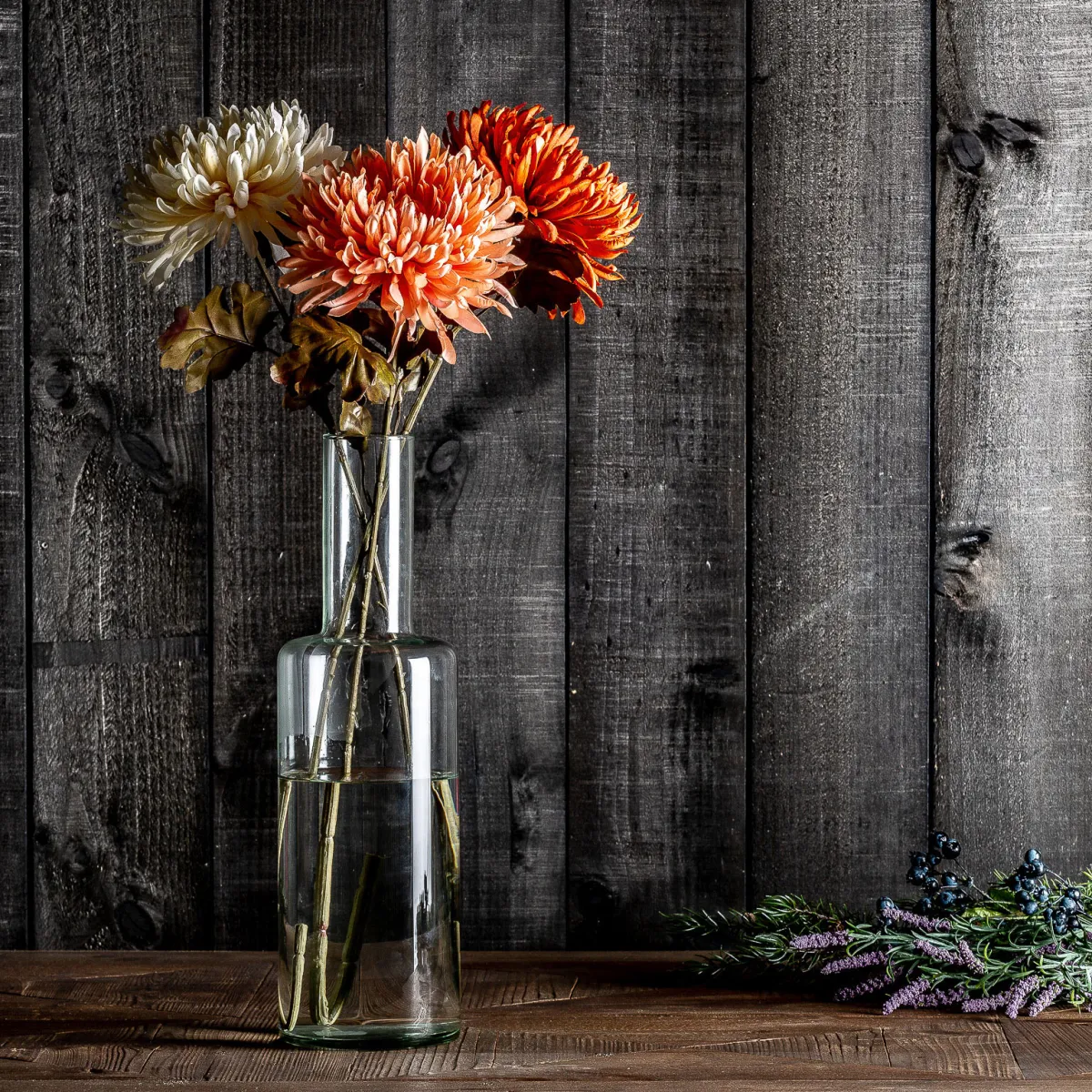 Flor Crisantema de estilo clásico fabricado en plástico en color coral combinado con poliéster.