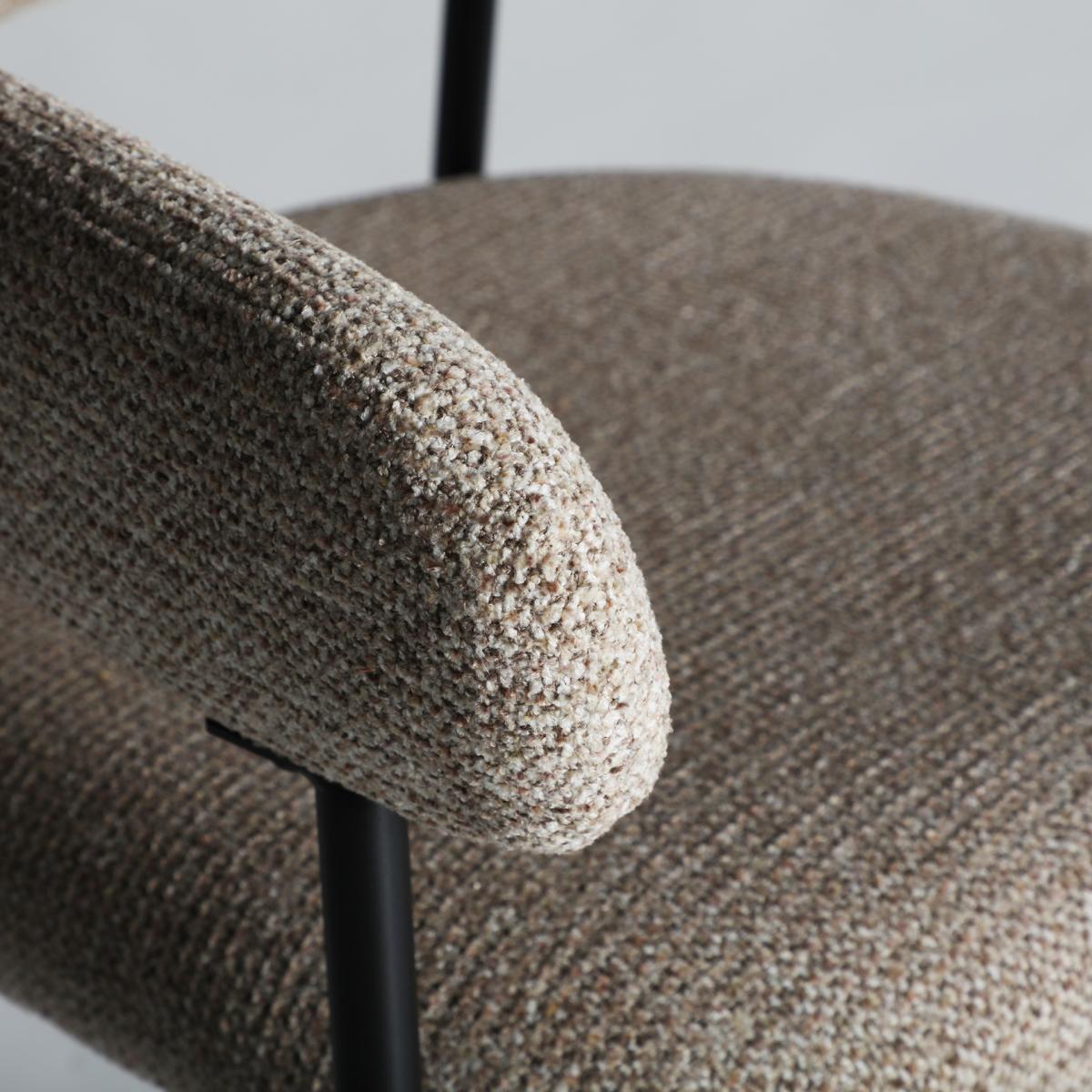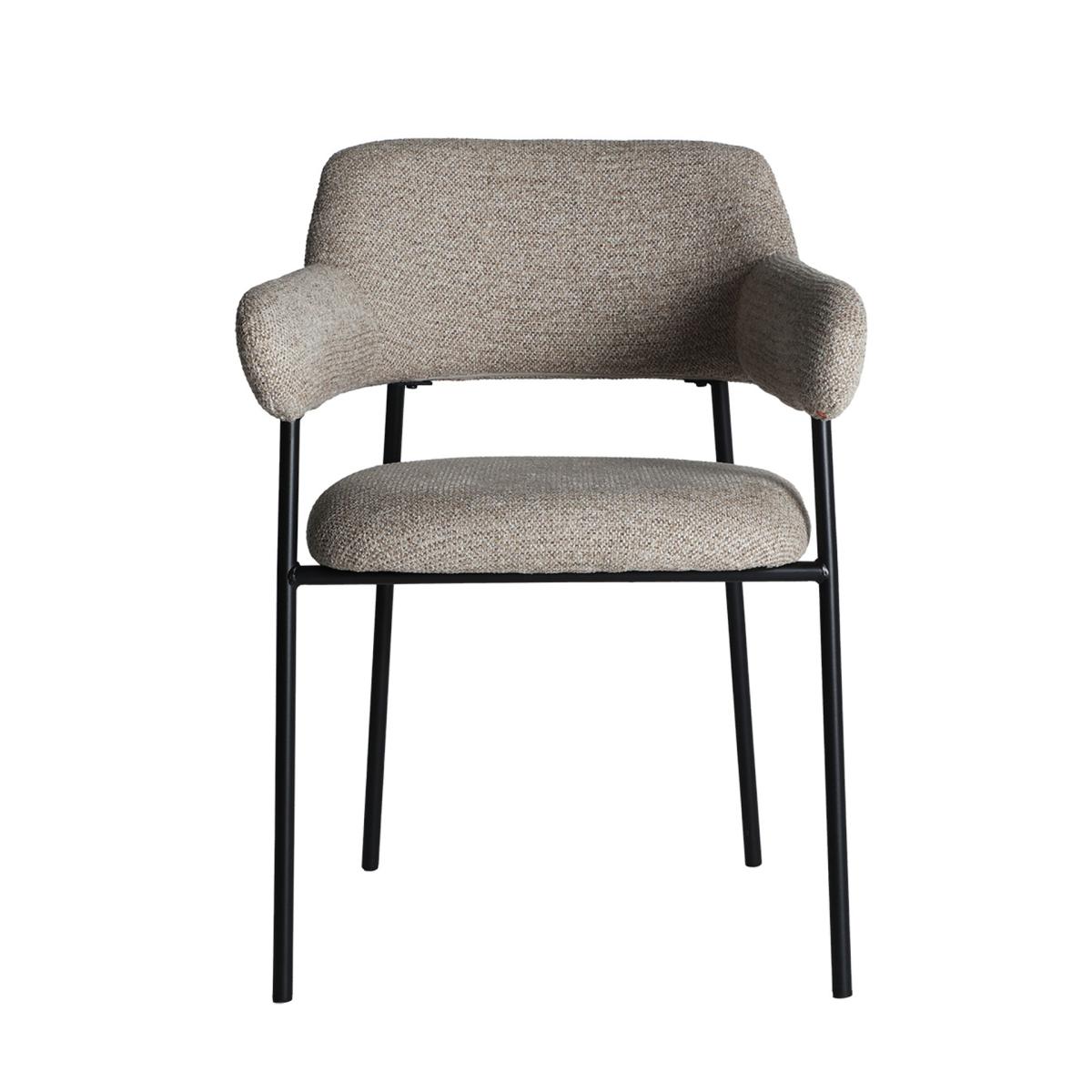 Silla Sarzay de estilo contemporáneo, fabricado en poliéster en color marrón claro con acabado jaspeado, combinado con hierro en color negro y madera dm. Producto desmontable.
