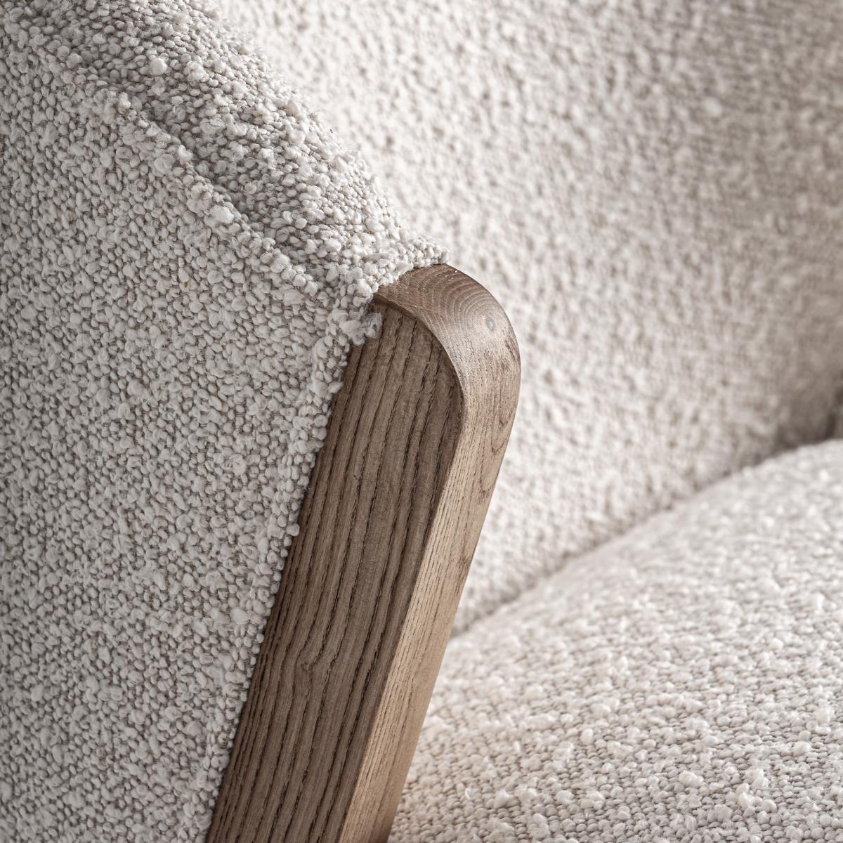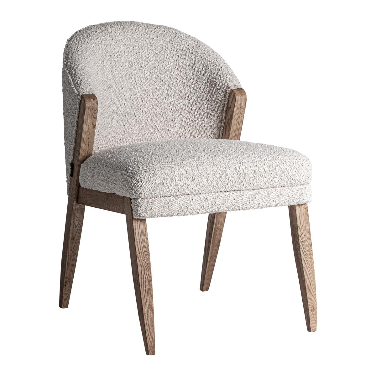 Silla Gueret de estilo contemporáneo fabricado en madera de pino en color marrón combinado con algodón bouclé en color blanco roto.