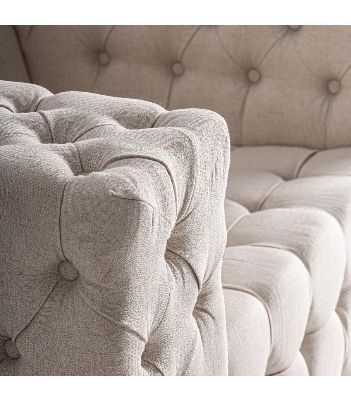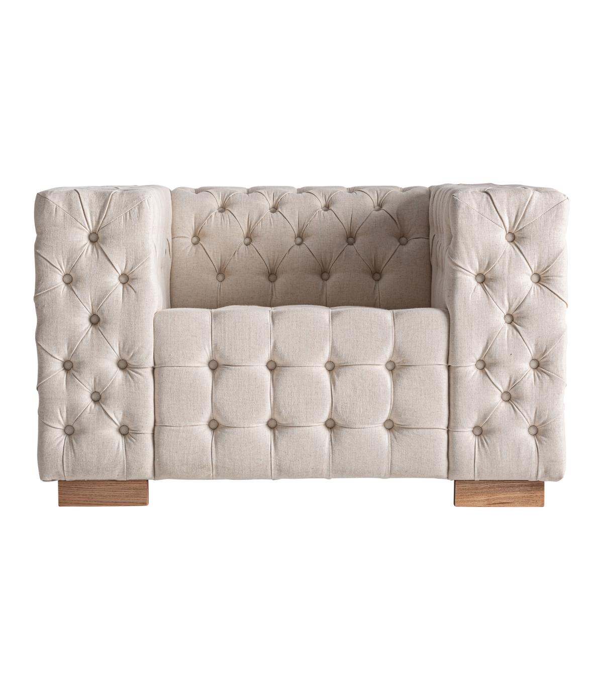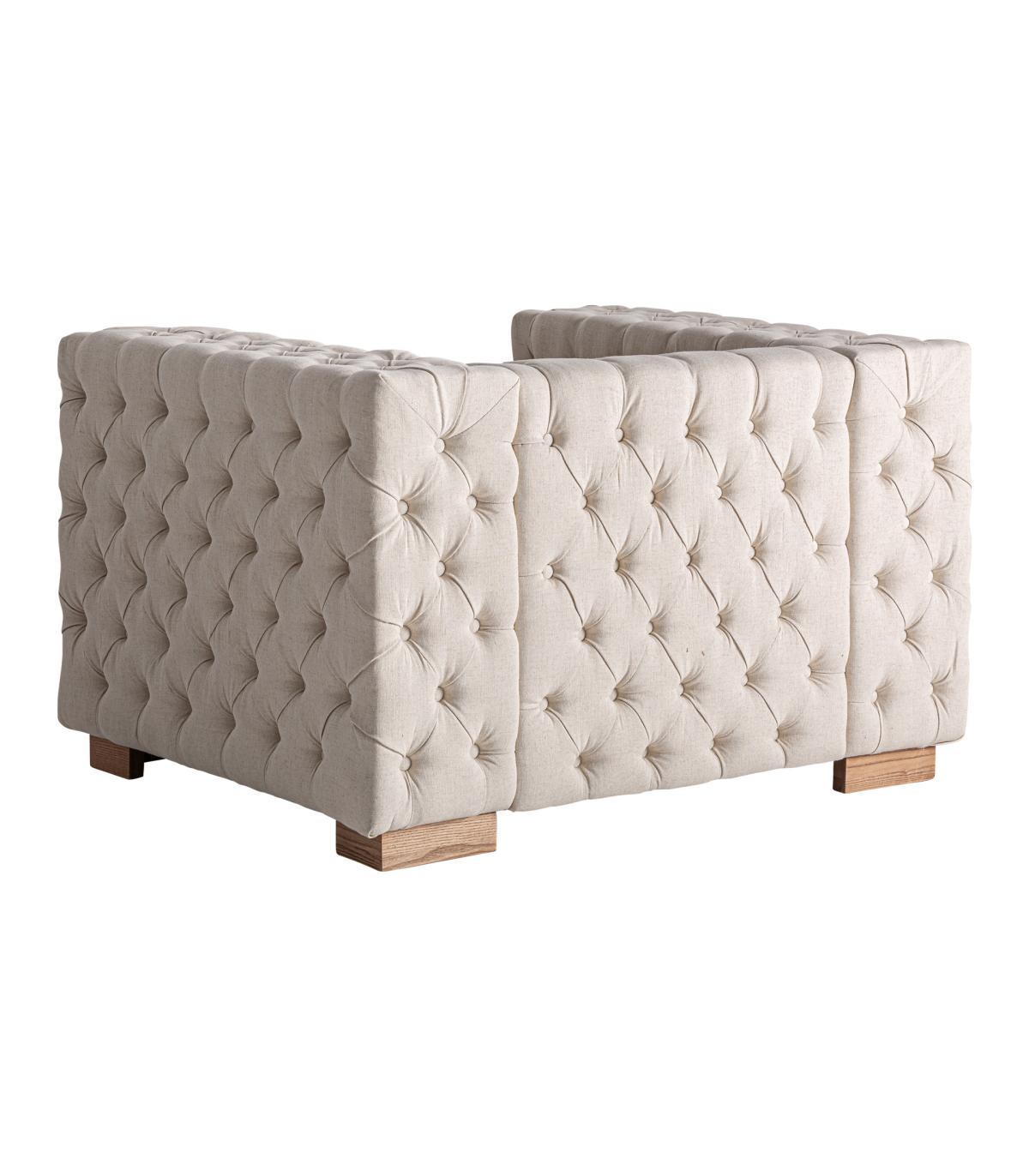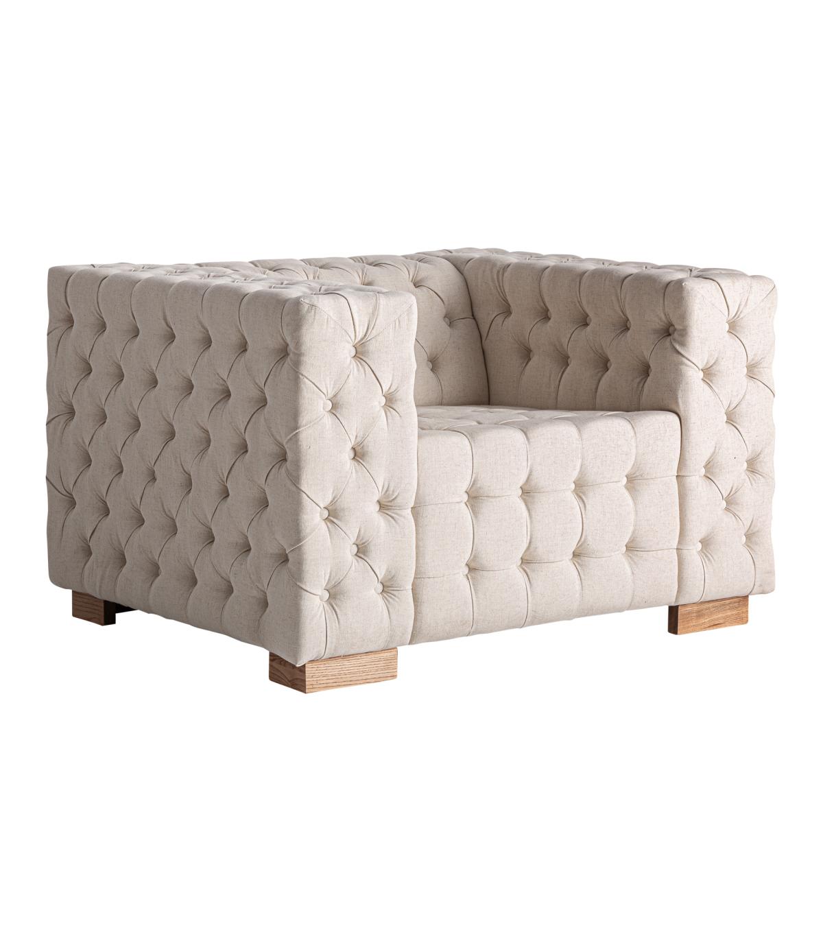 Sillón fabricado en madera de fresno en color marrón combinado con terciopelo en color beige.