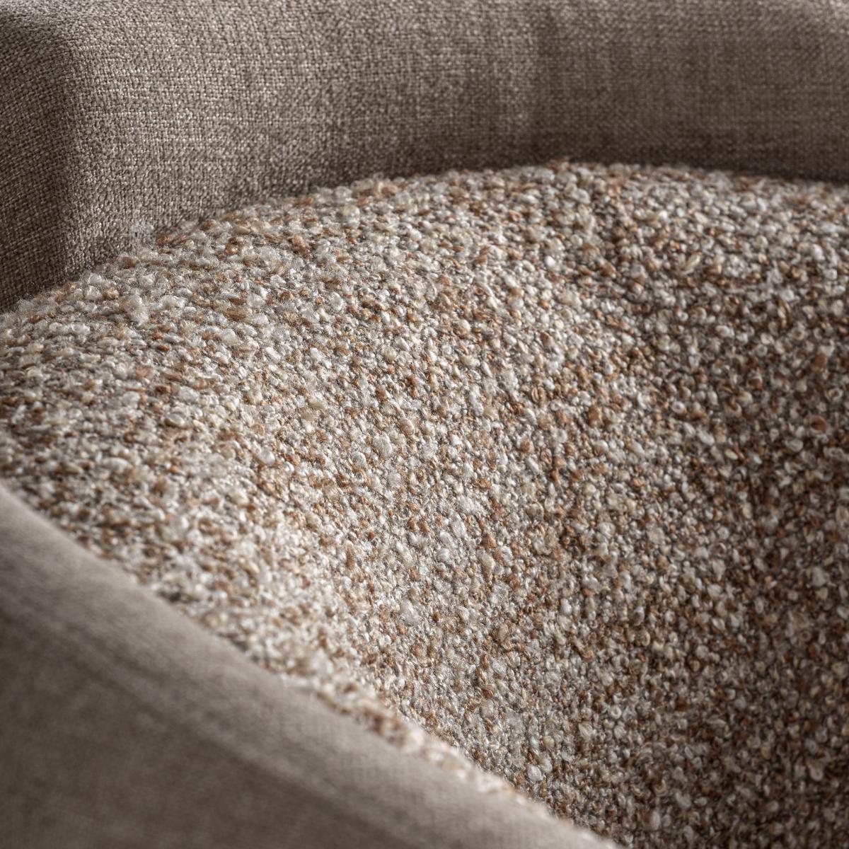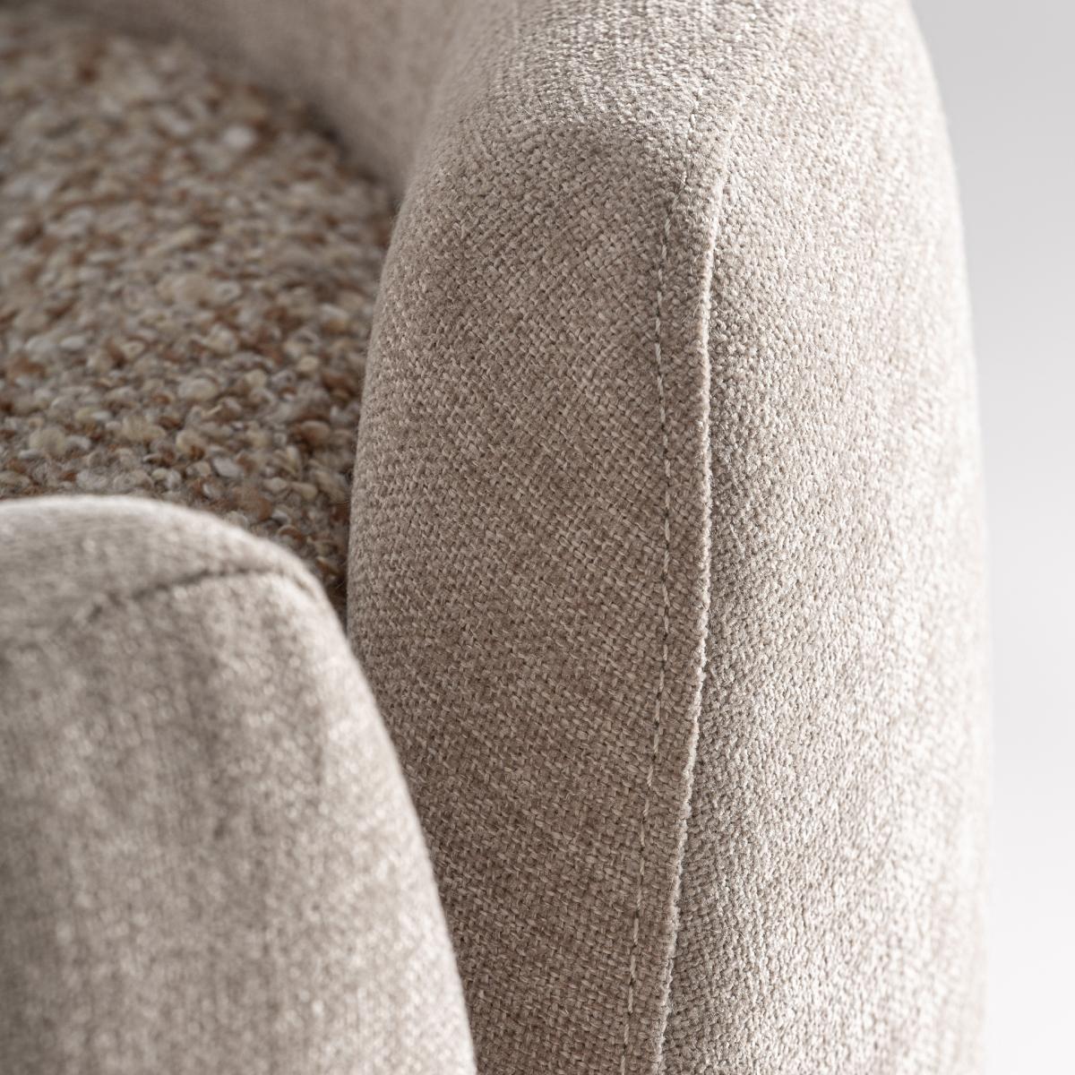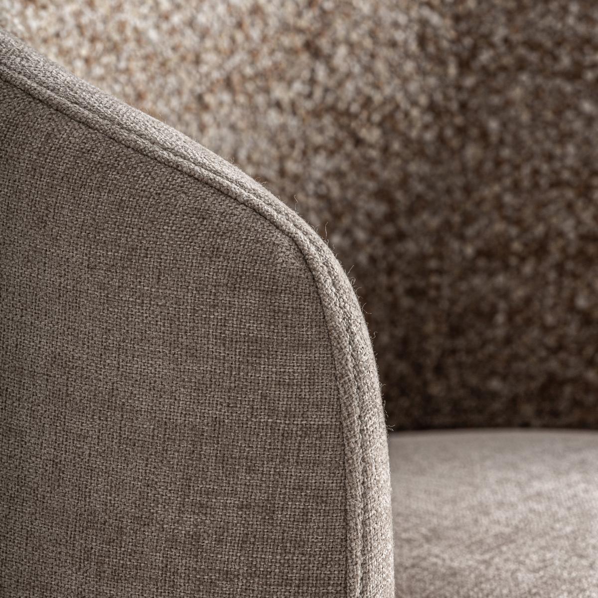 Sillón fabricado en poliéster en color beige con acabado chenilla combinado con madera de pino y hierro en color negro.