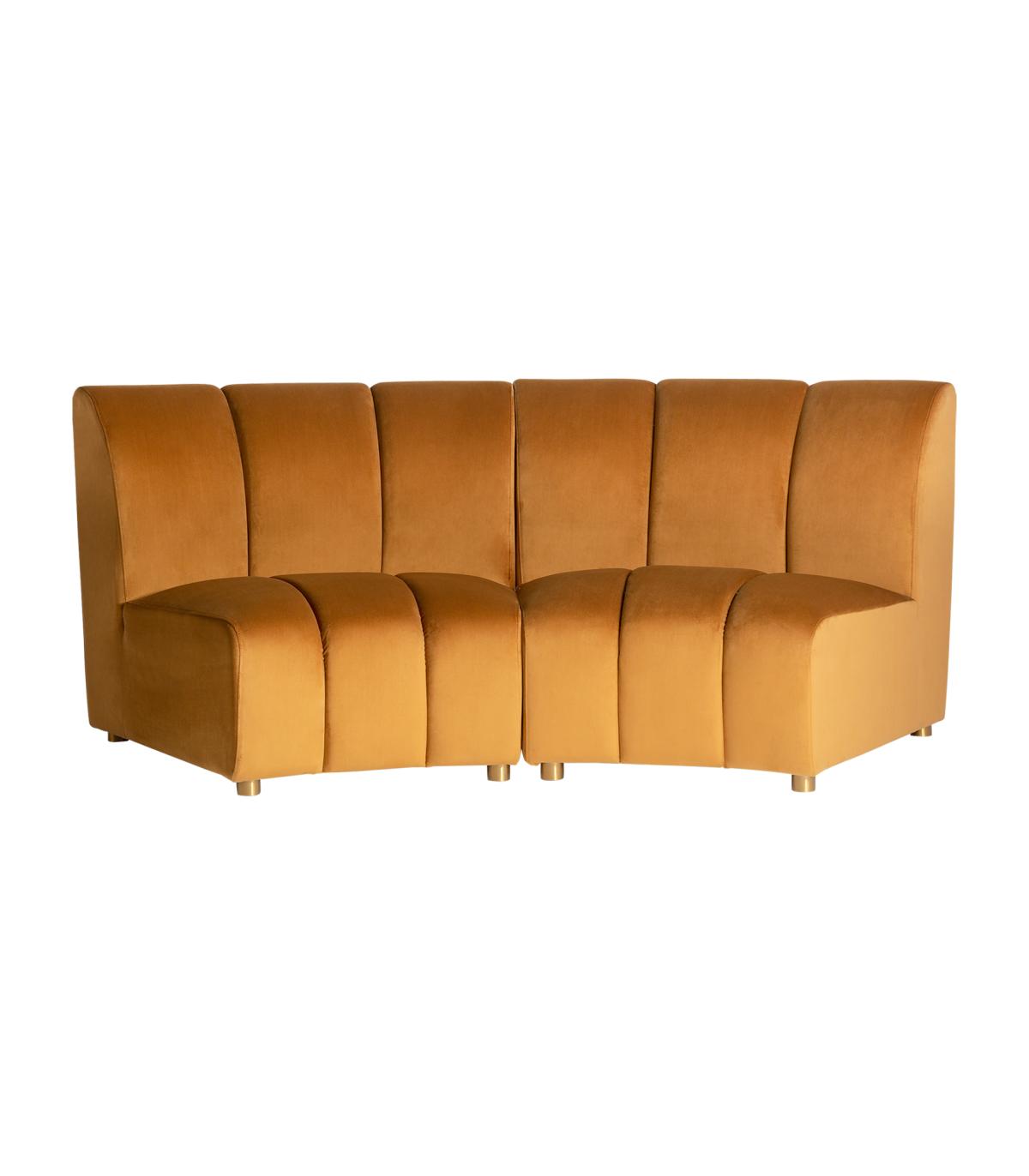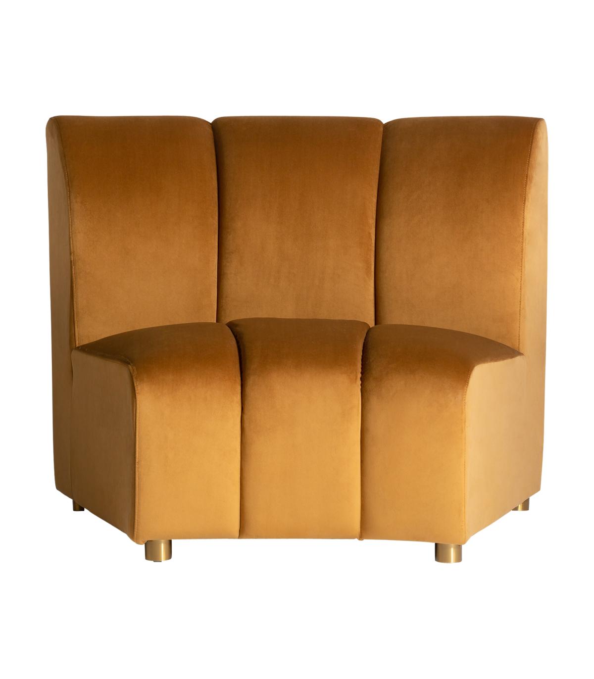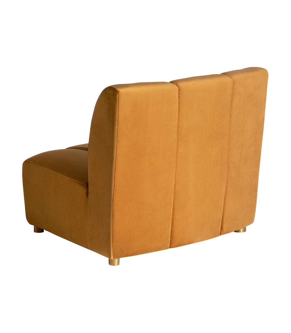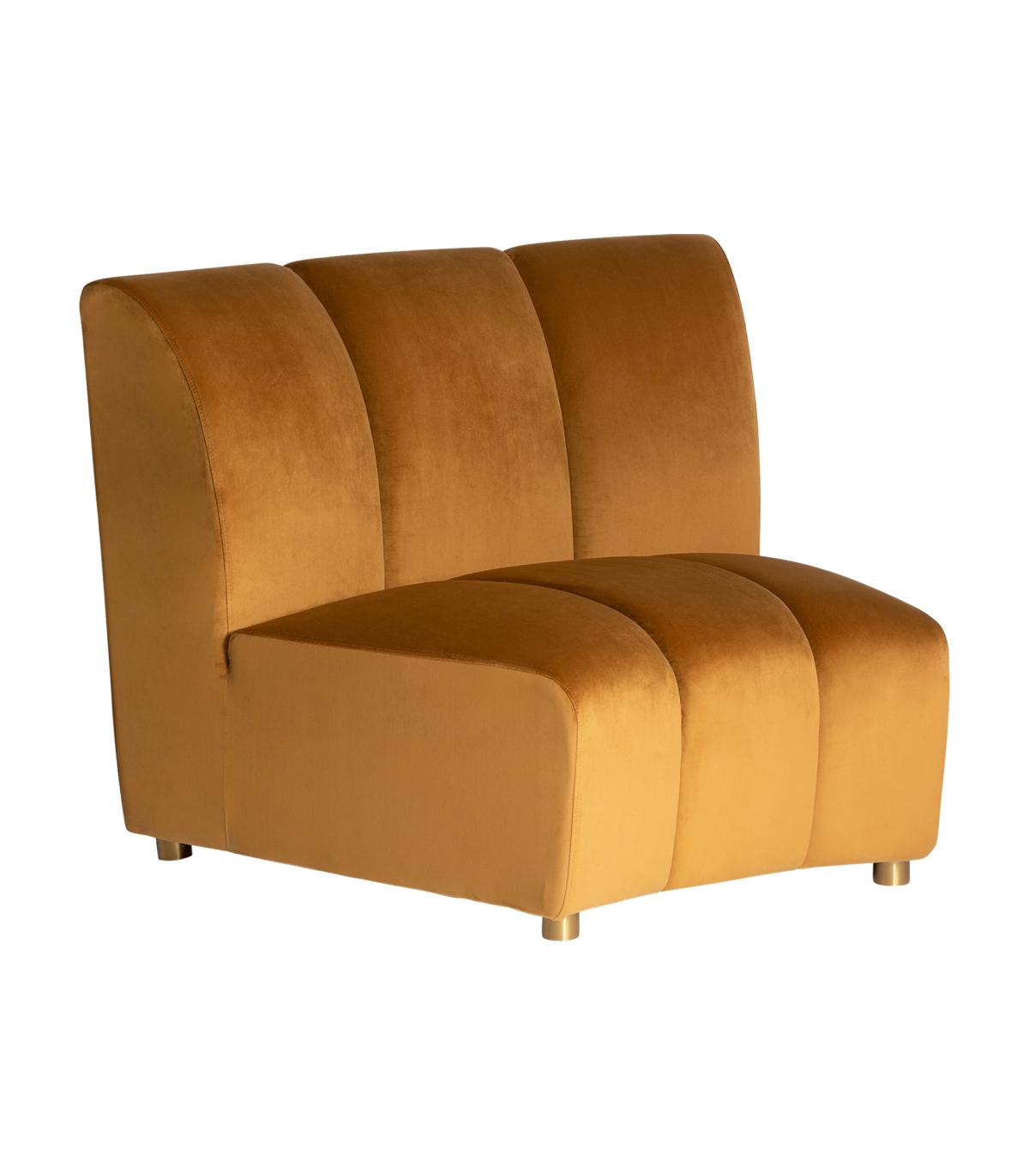 Módulo sofá central Shul de estilo art deco fabricado en terciopelo en color mostaza combinado con espuma y poliéster.