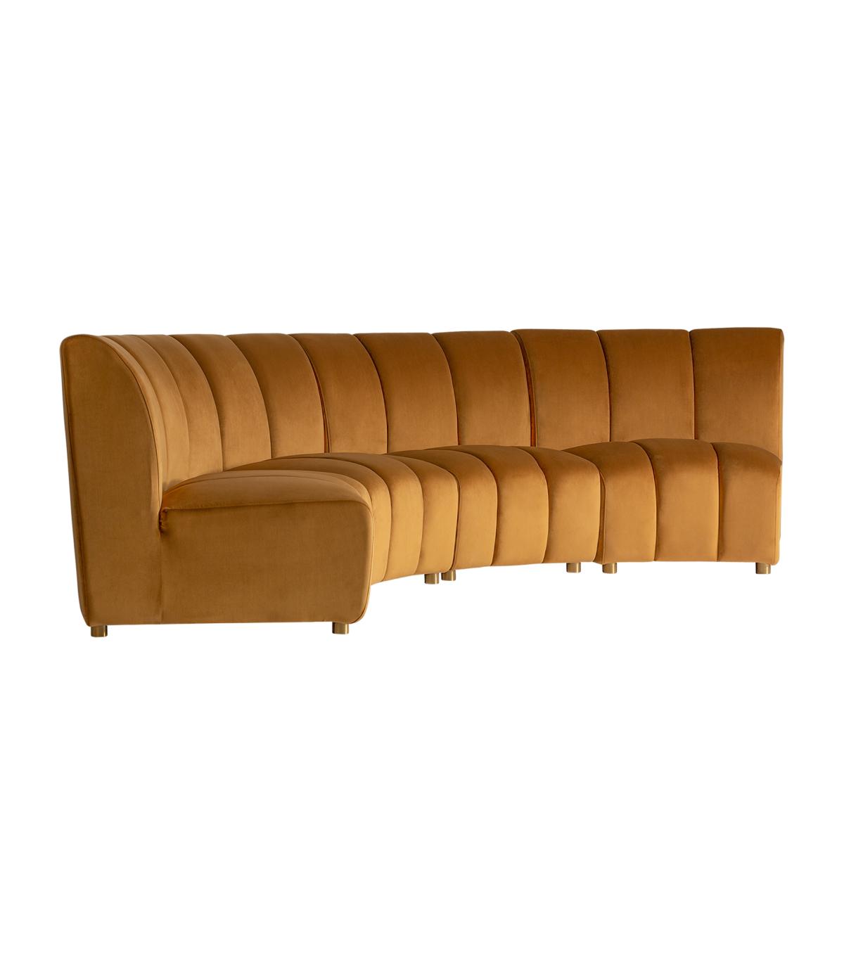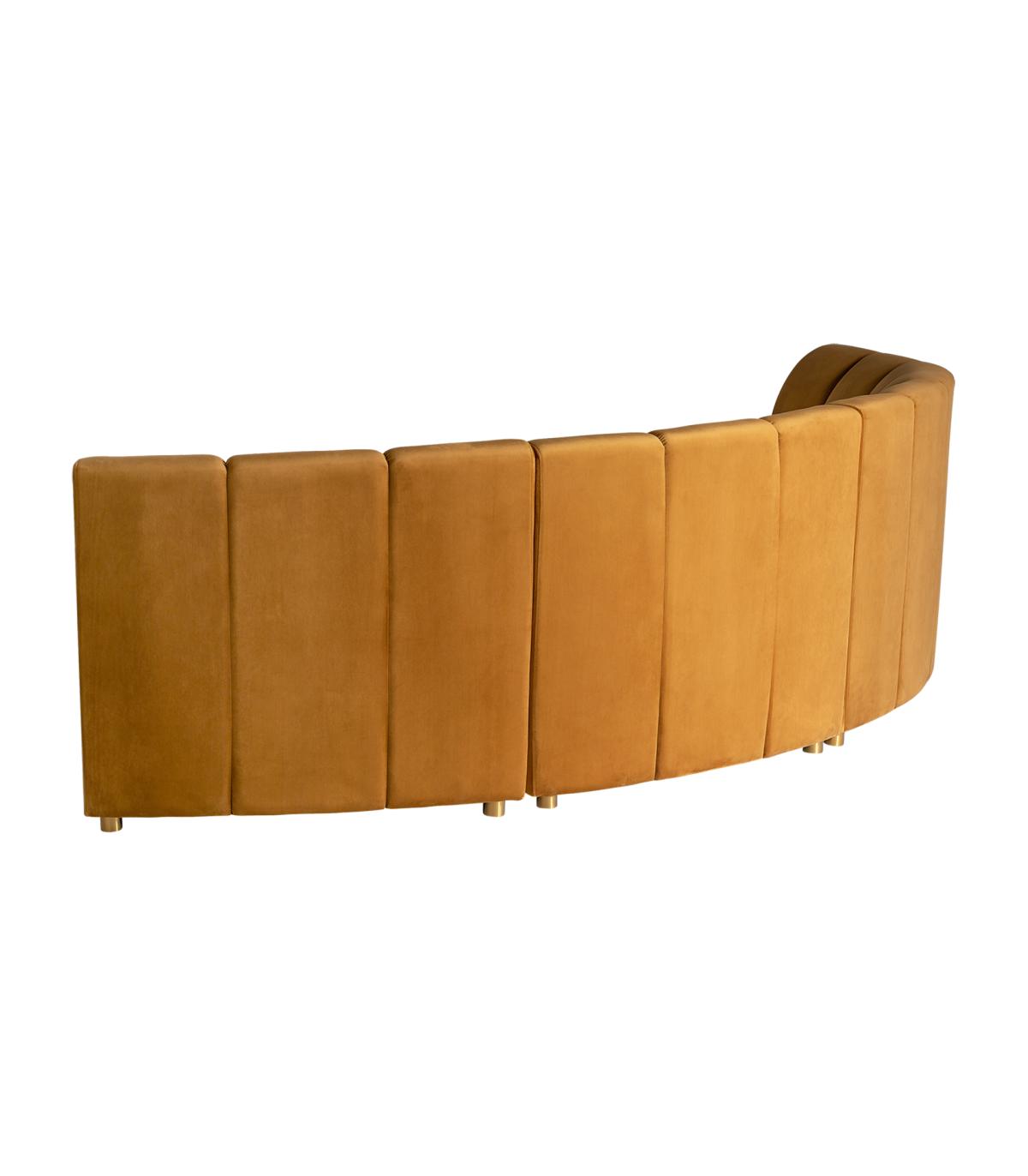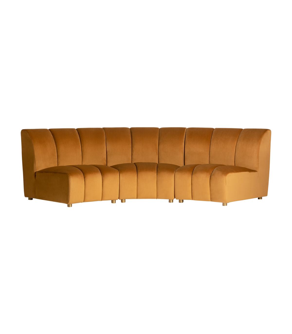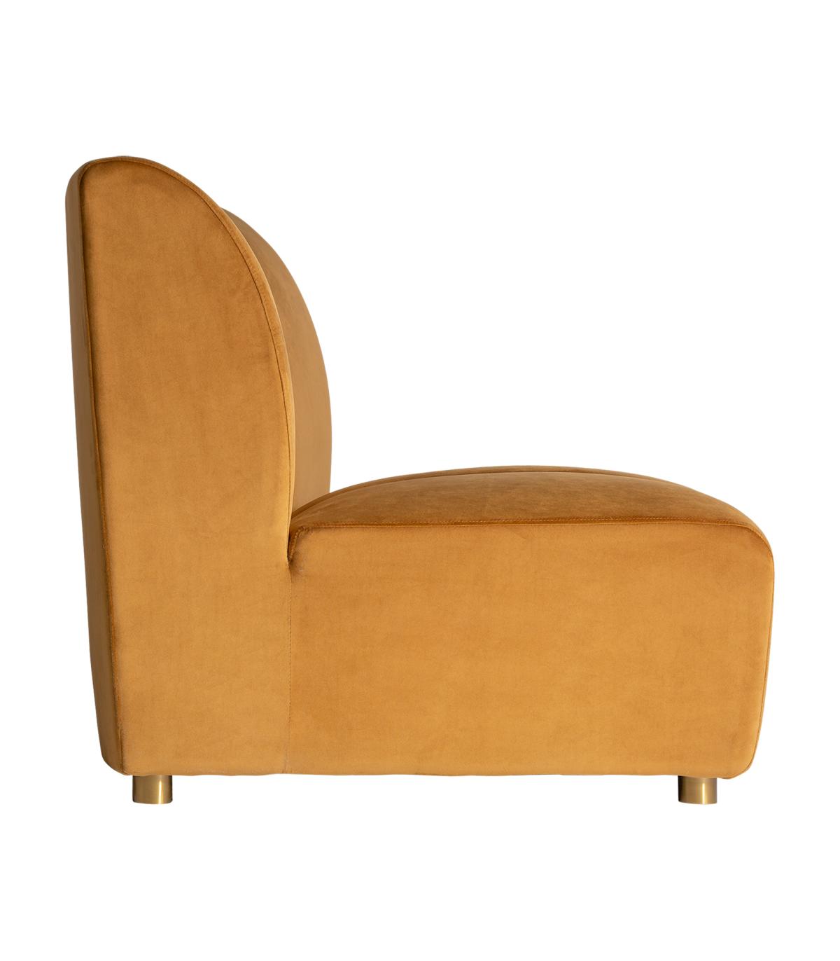 Módulo sofá central Shul de estilo art deco fabricado en terciopelo en color mostaza combinado con espuma y poliéster.