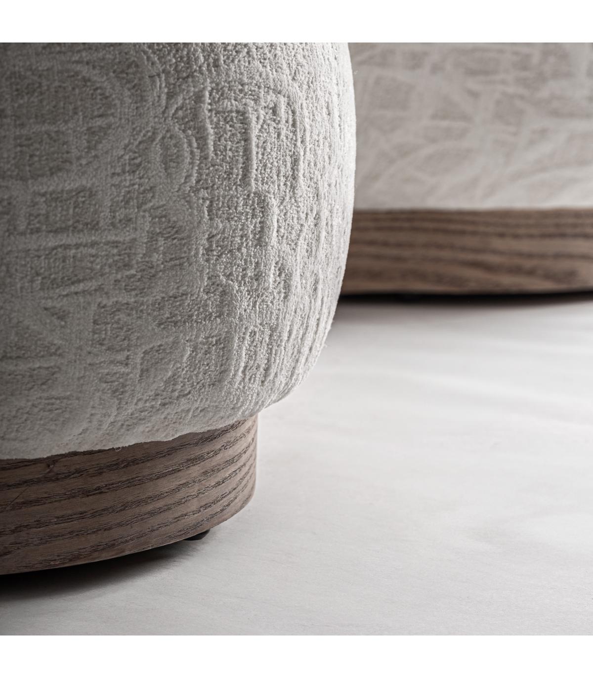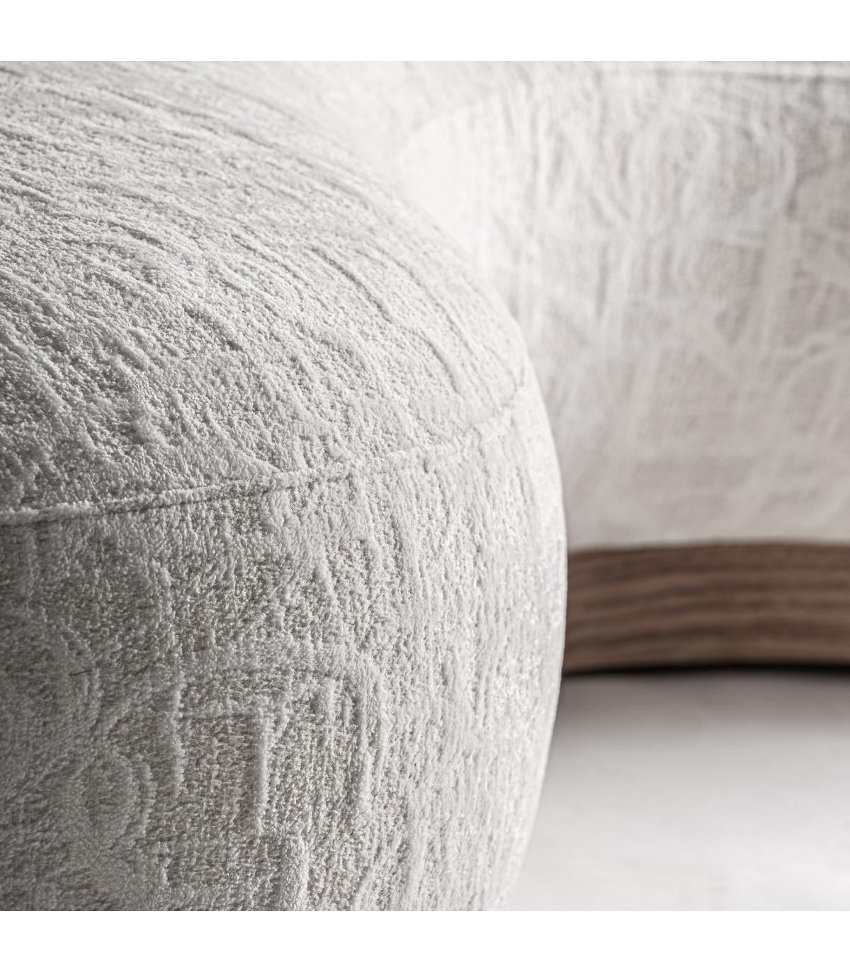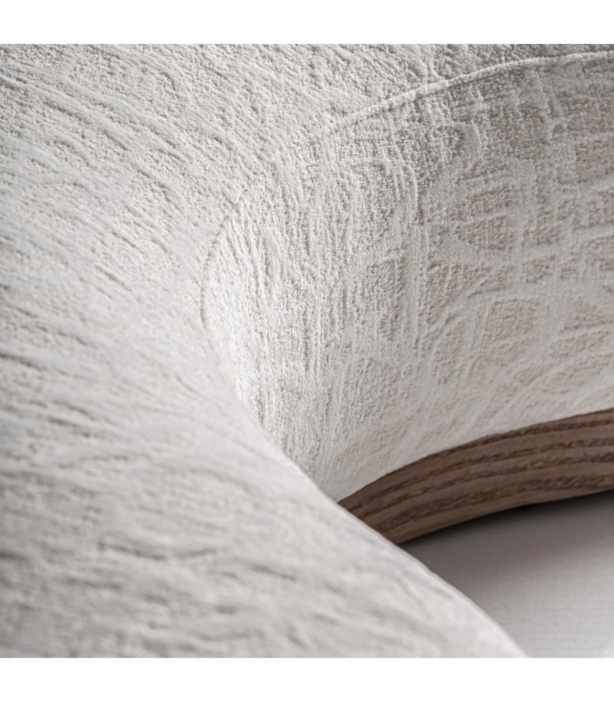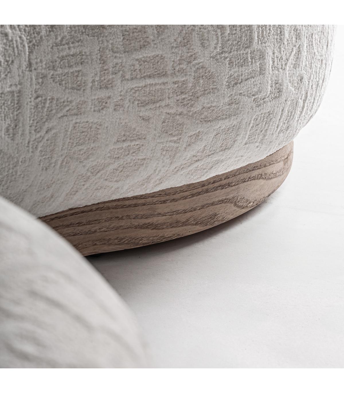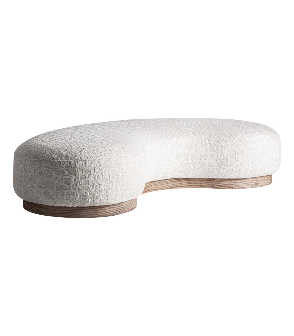 Sofá fabricado en poliéster en color blanco roto combinado con espuma en color marrón y madera de caucho.