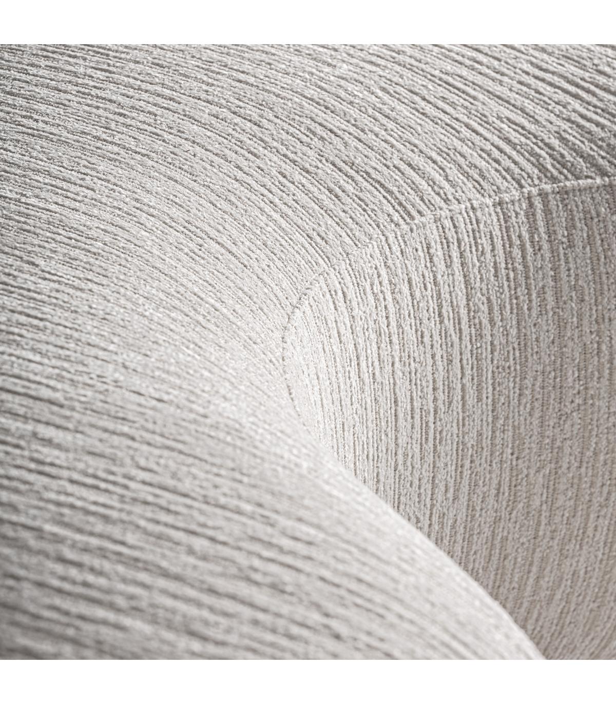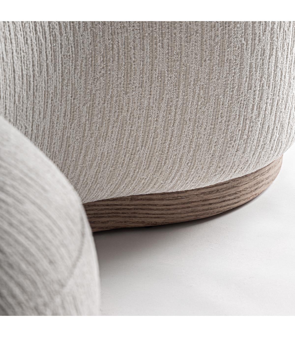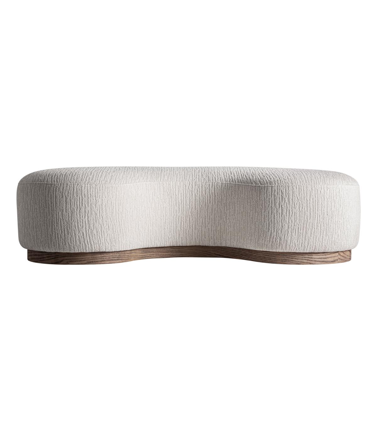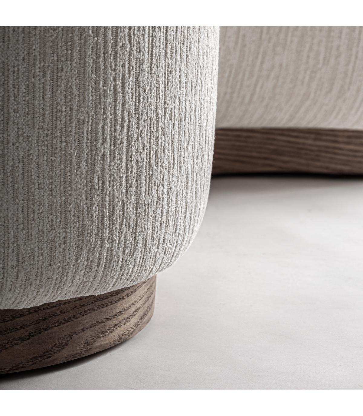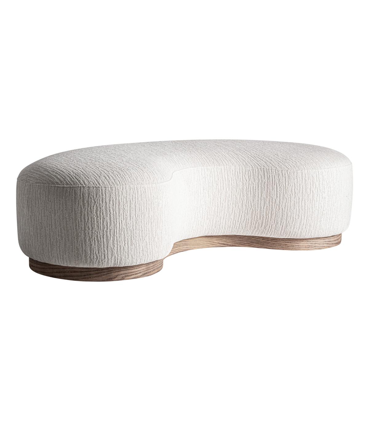Sofá fabricado en poliéster en color blanco roto combinado con espuma y madera de caucho en color marrón.