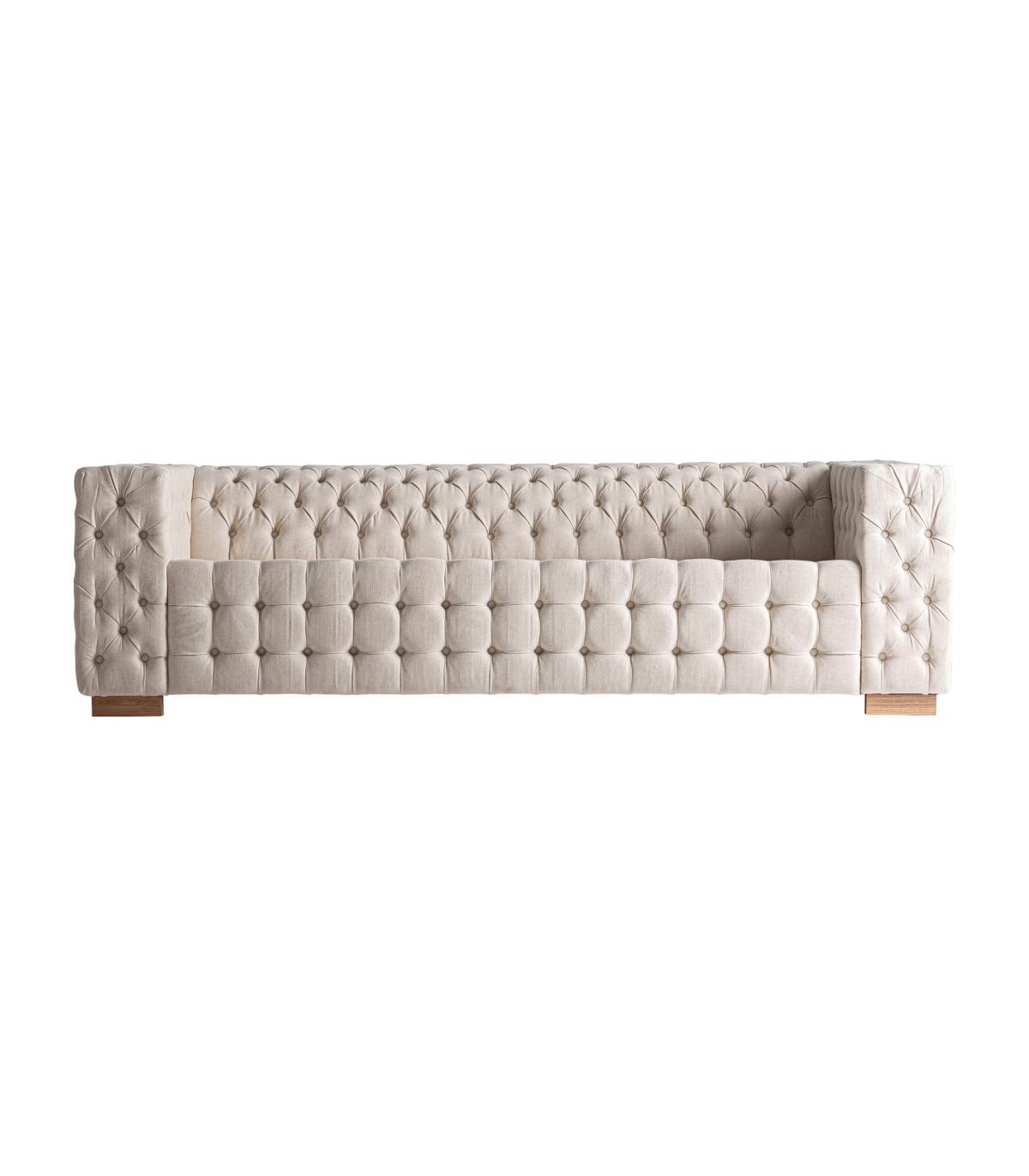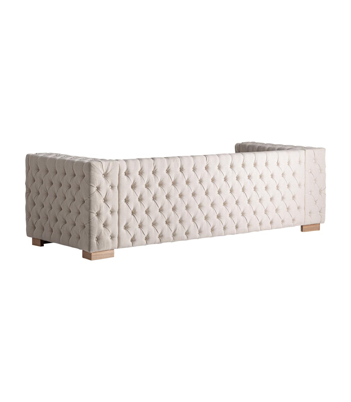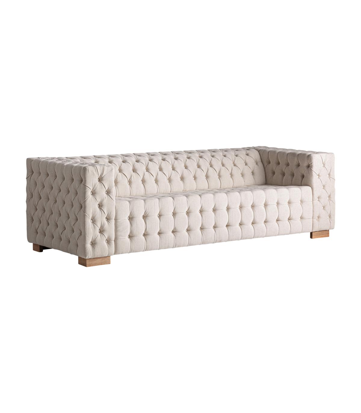 Sofá fabricado en madera de fresno en color marrón combinado con terciopelo en color beige.