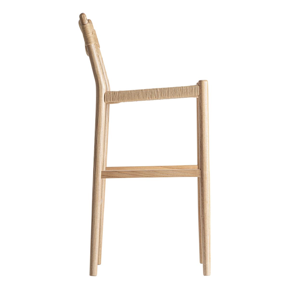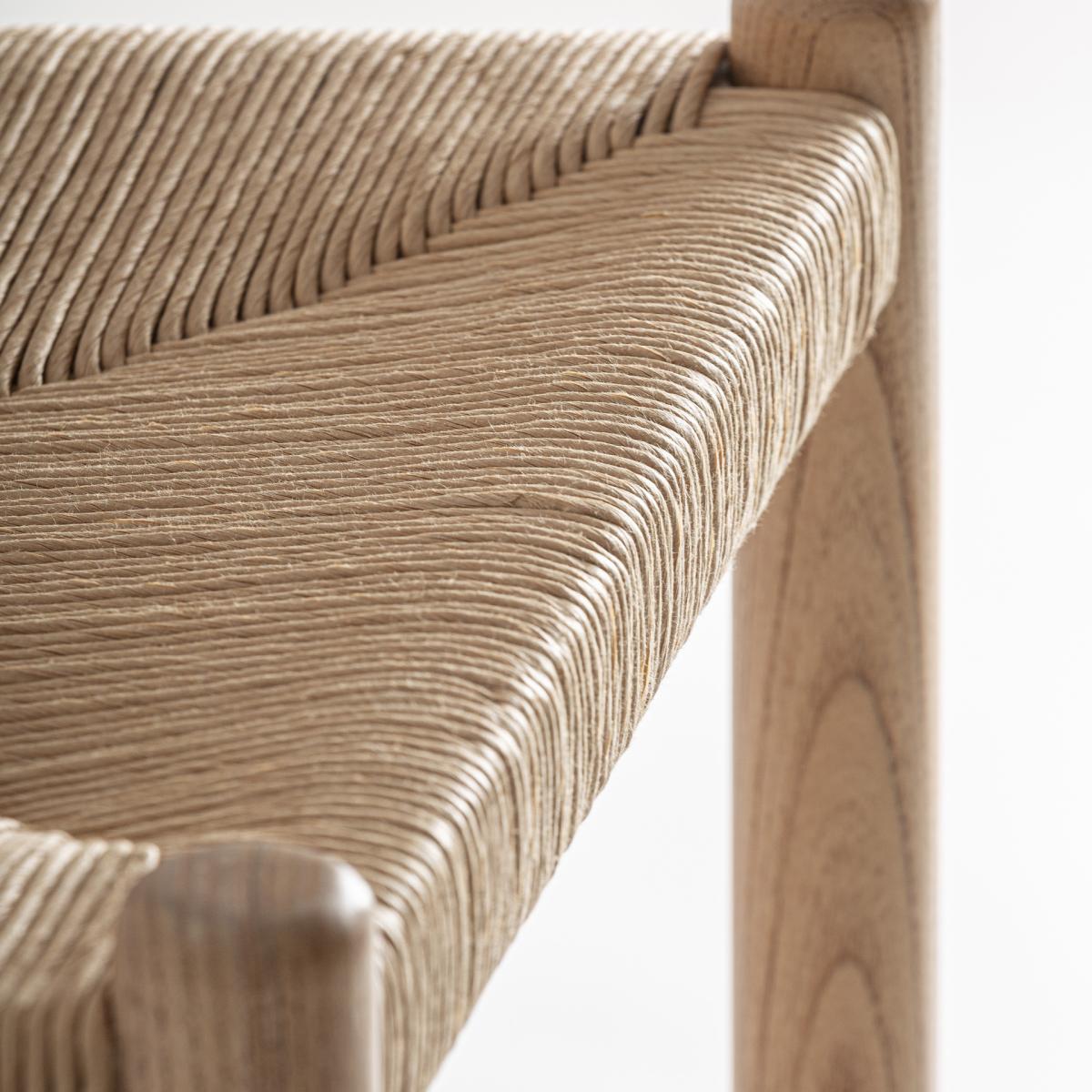 Taburete Jaleha de estilo contemporáneo fabricado en madera de olmo en color marrón claro combinado con fibra natural.