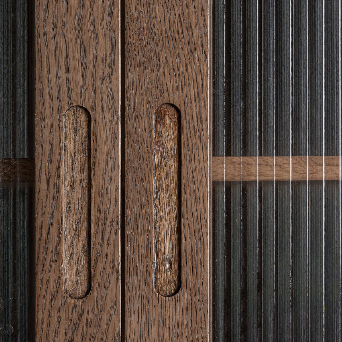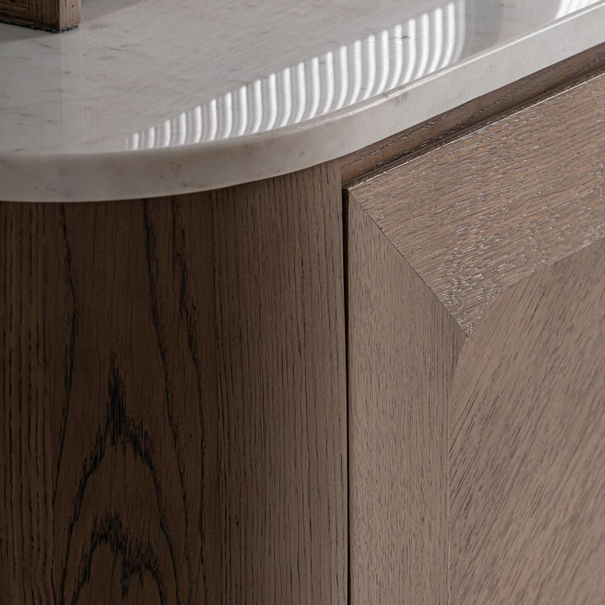 Mueble bar fabricado en madera roble en color marrón combinado con mármol en color blanco y cristal en color transparente.