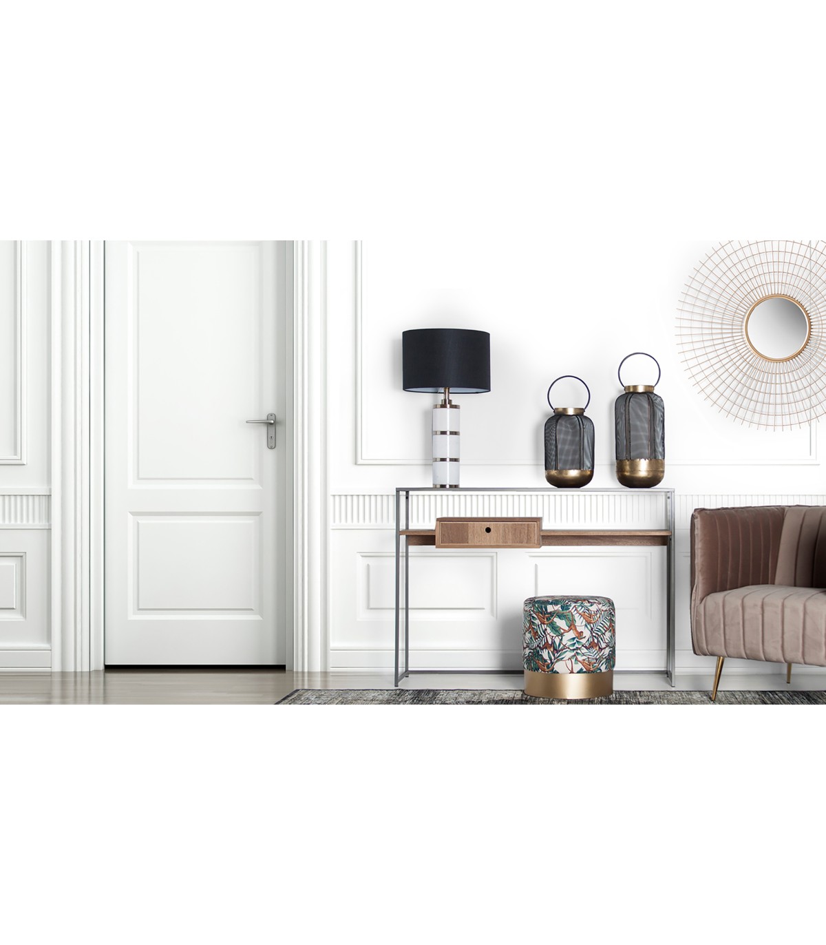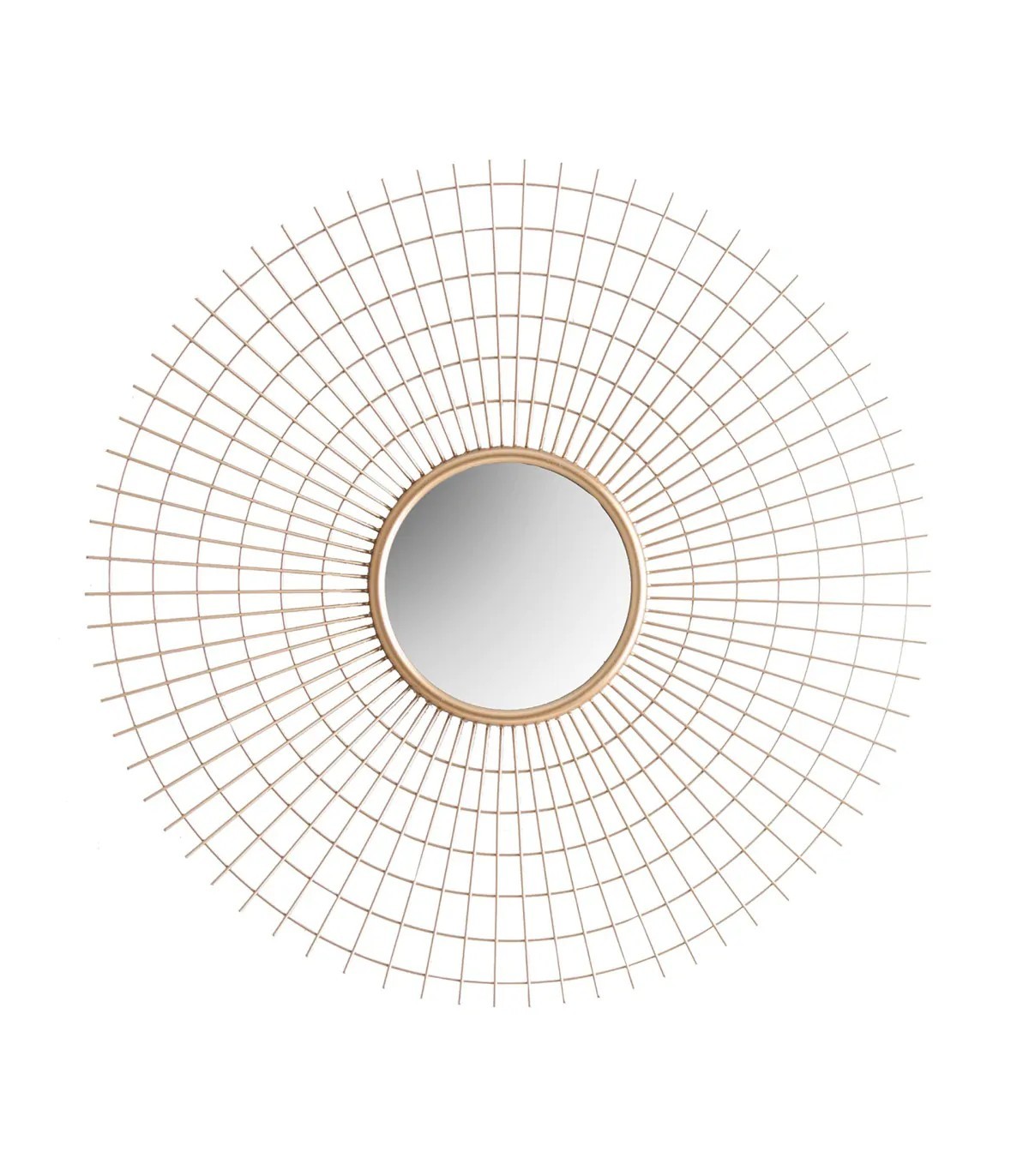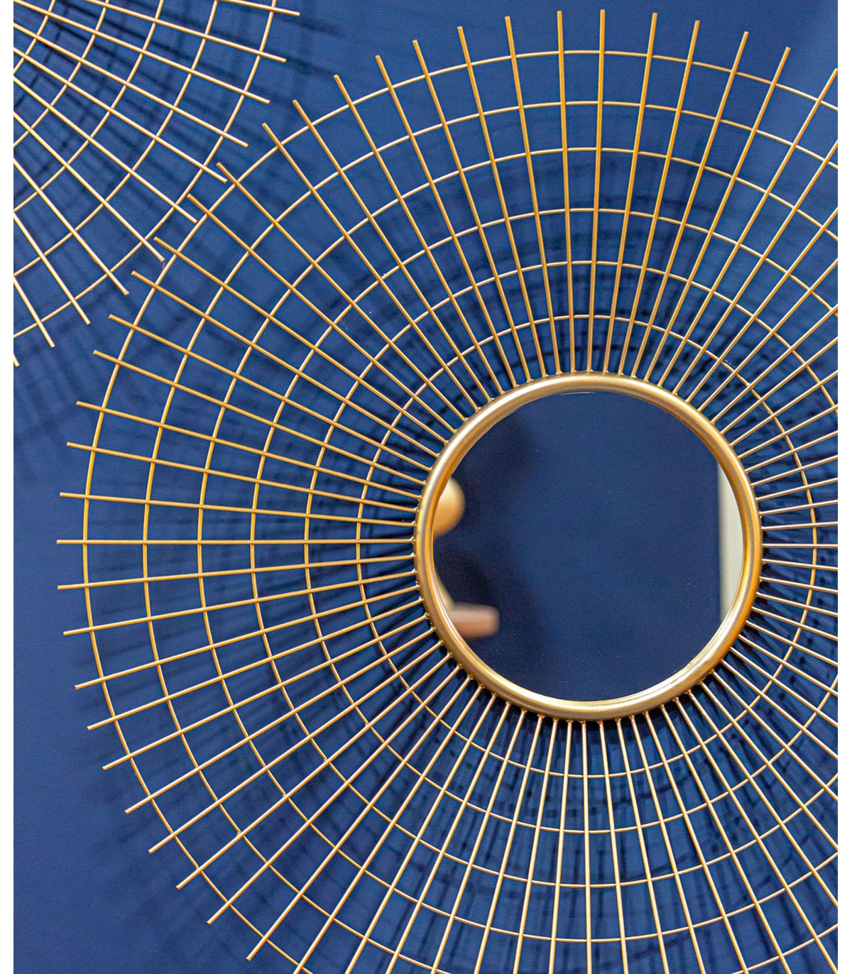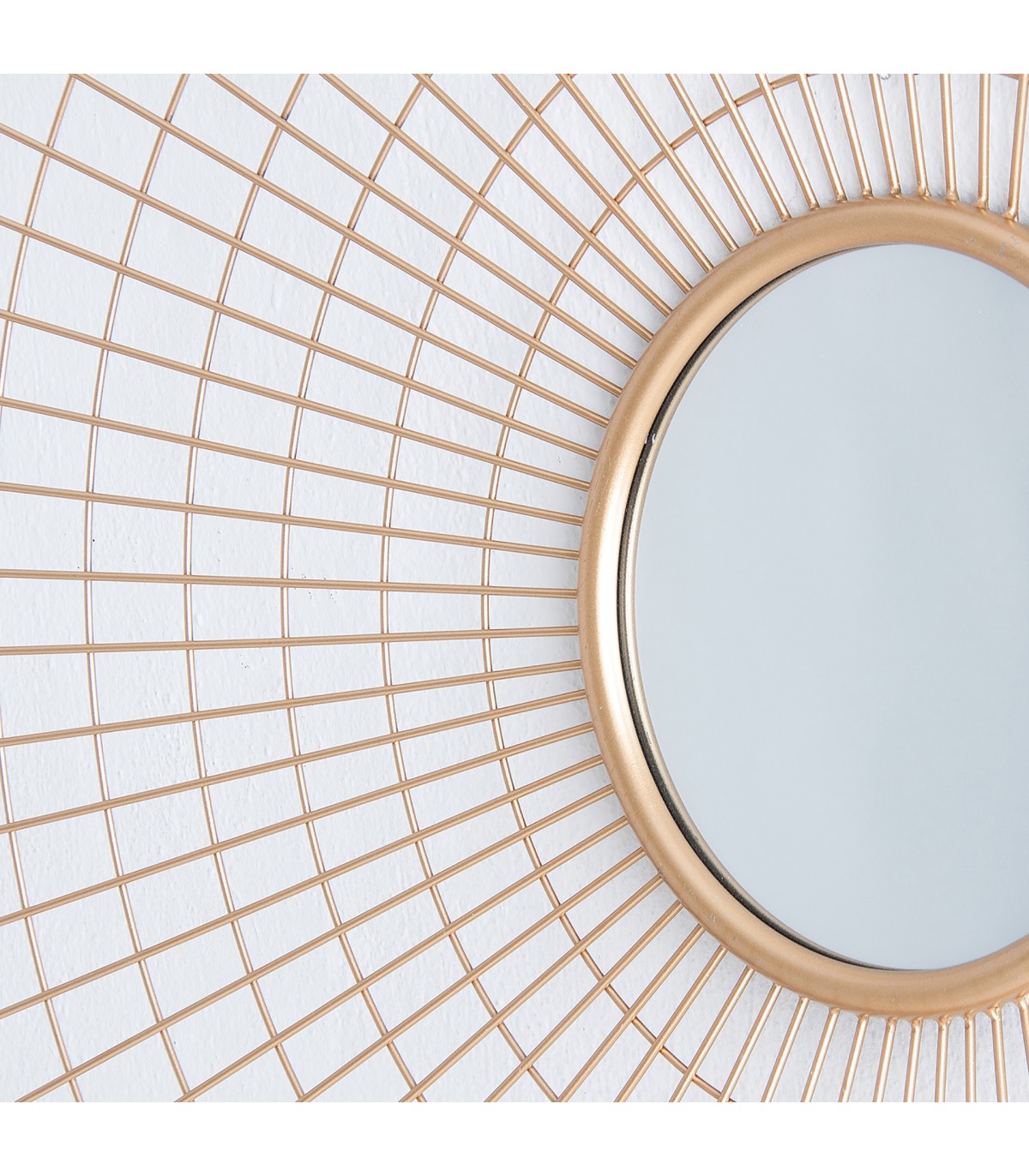 Espejo redondo fidele, en color oro, de estilo art deco. Fabricado en hierro, combinado con espejo y madera dm.