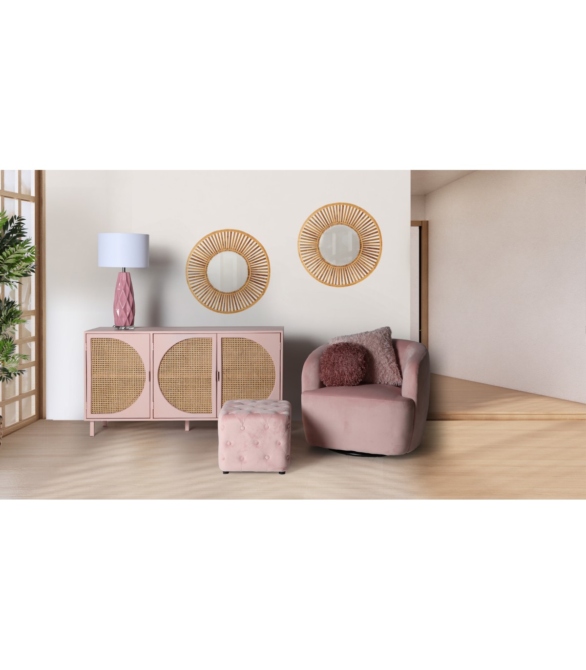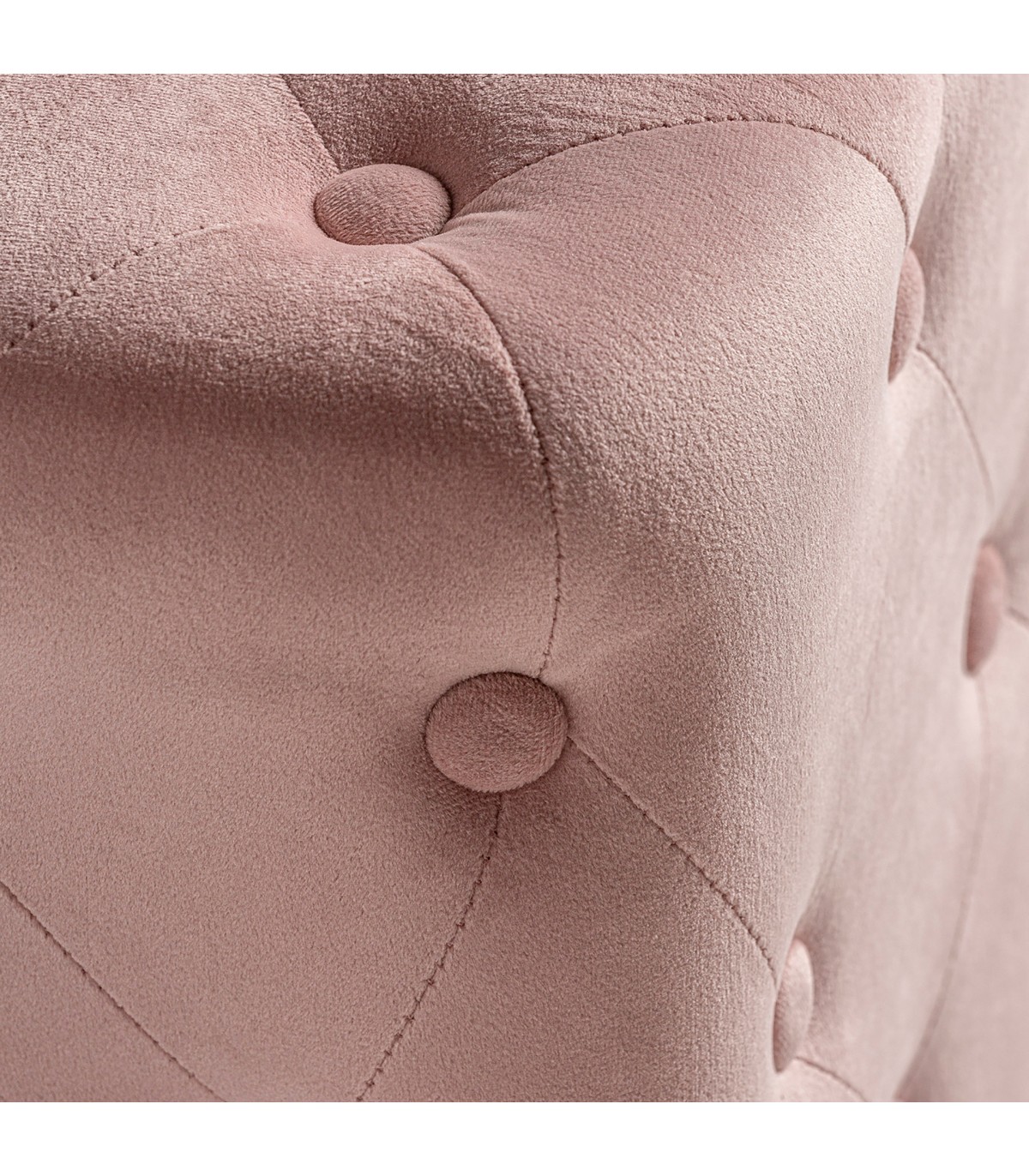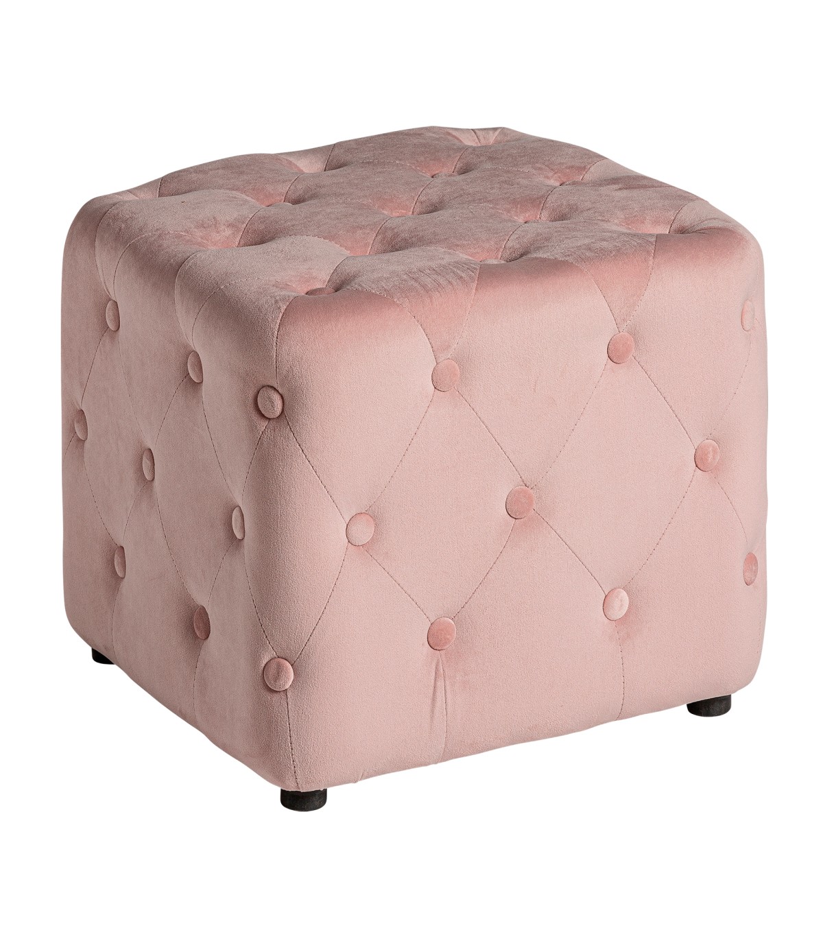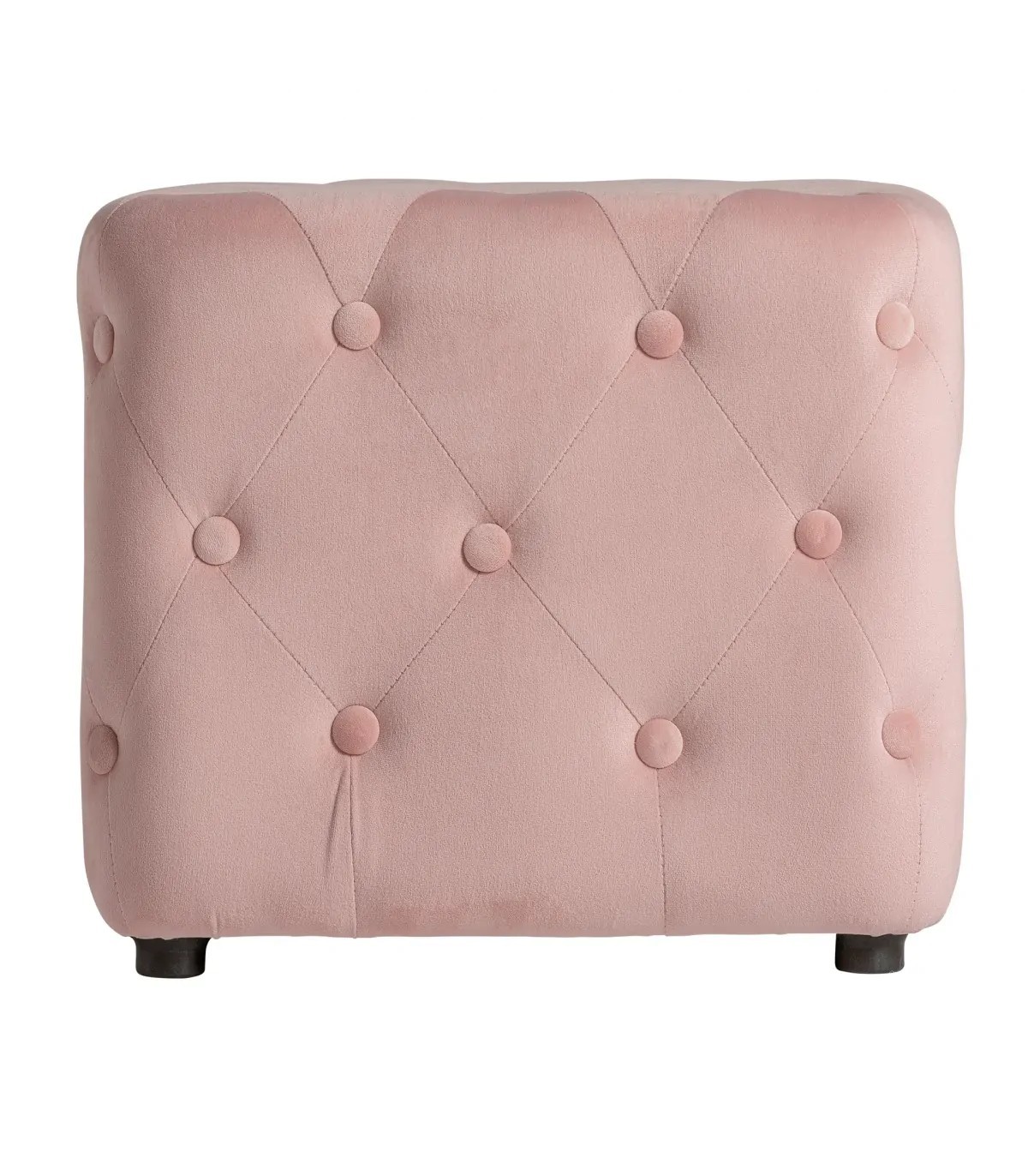 Reposapiés capitoné bougue, en color rosa palo, de estilo art deco. Fabricado en poliéster, combinado con madera de pino y madera dm. Espuma.