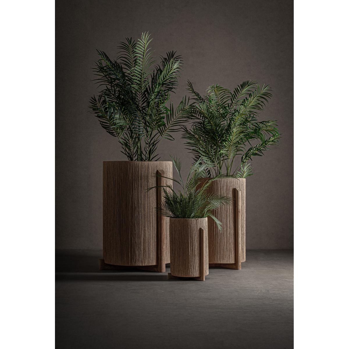 Macetero jacquard de estilo contemporáneo. Fabricado en madera de mango en color marrón combinado con rafia en color marrón claro.