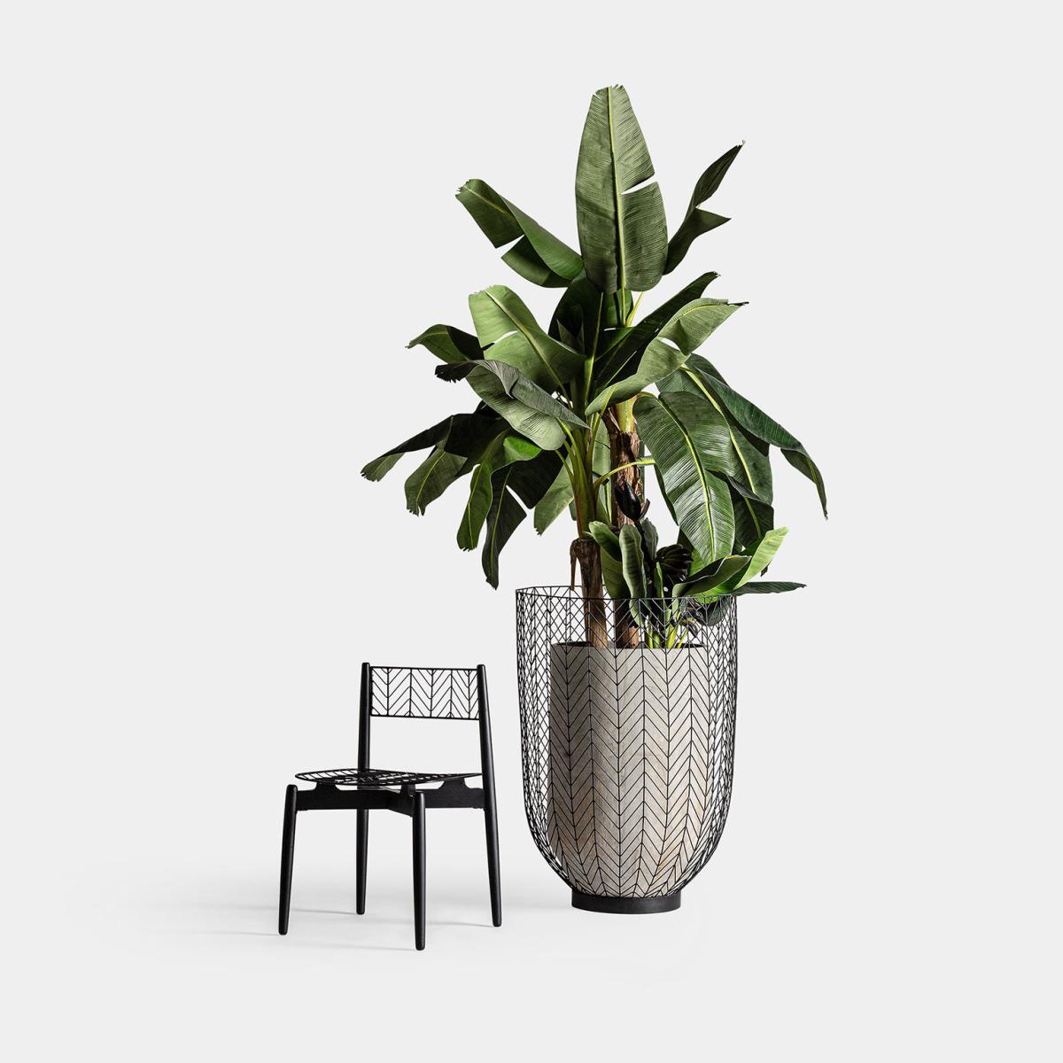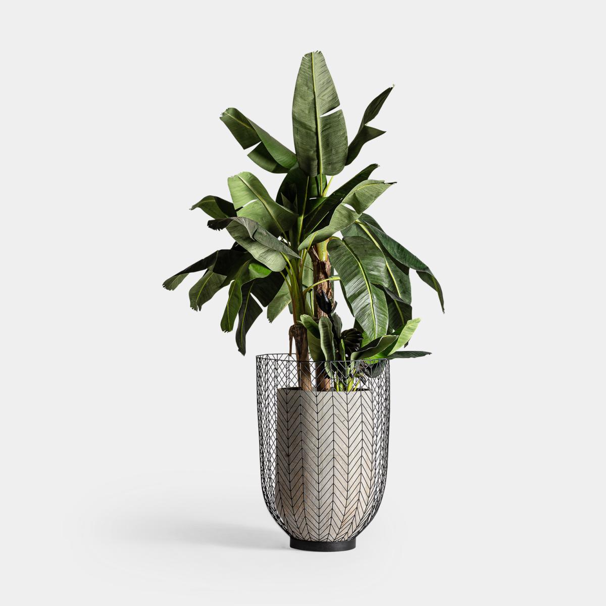Macetero j 2 plissé metal de estilo art deco fabricado en cemento en color gris combinado con hierro en color negro.