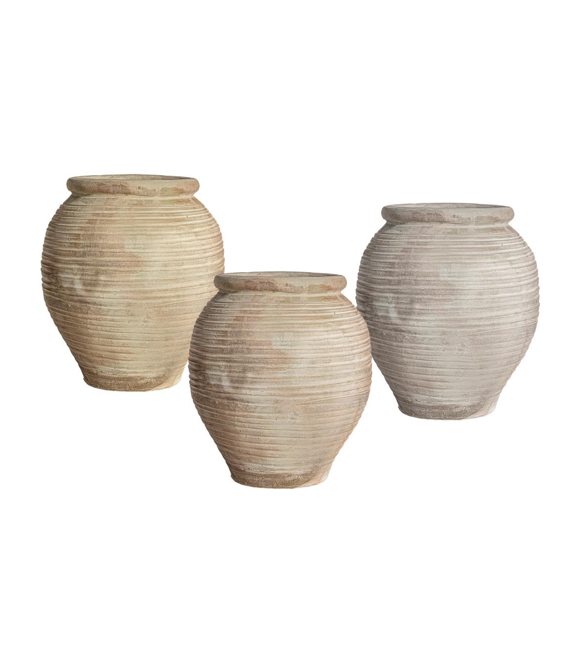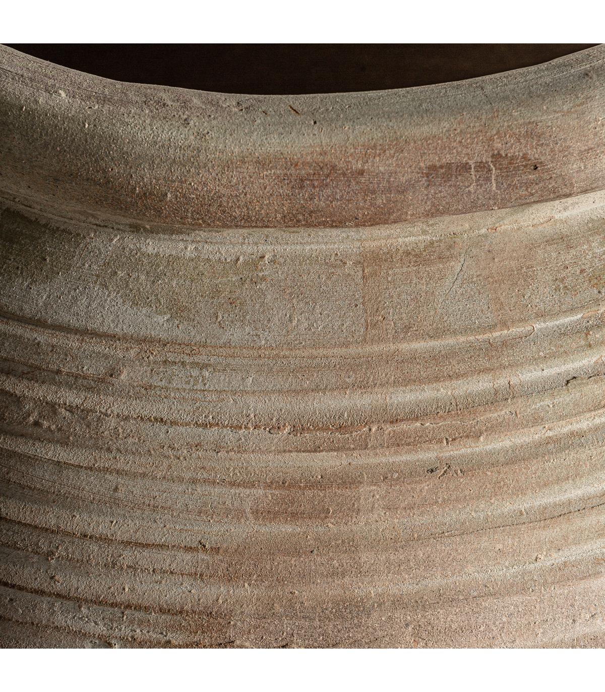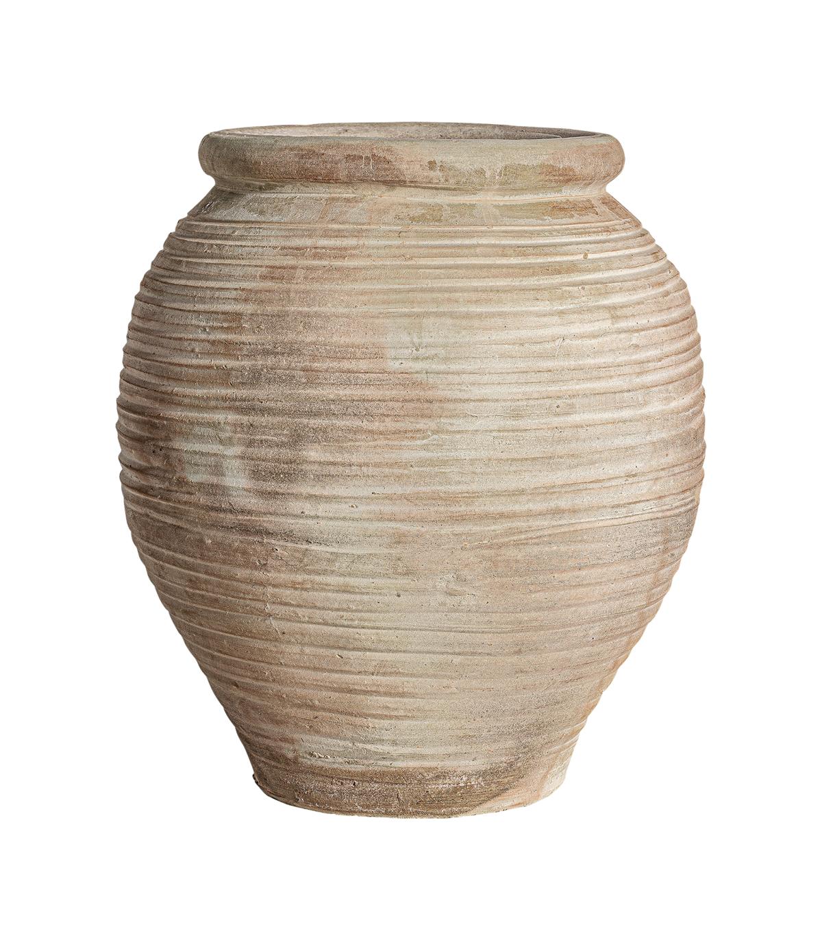 Tinaja kansara de estilo vintage fabricado en arcilla en color beige con acabado envejecido.