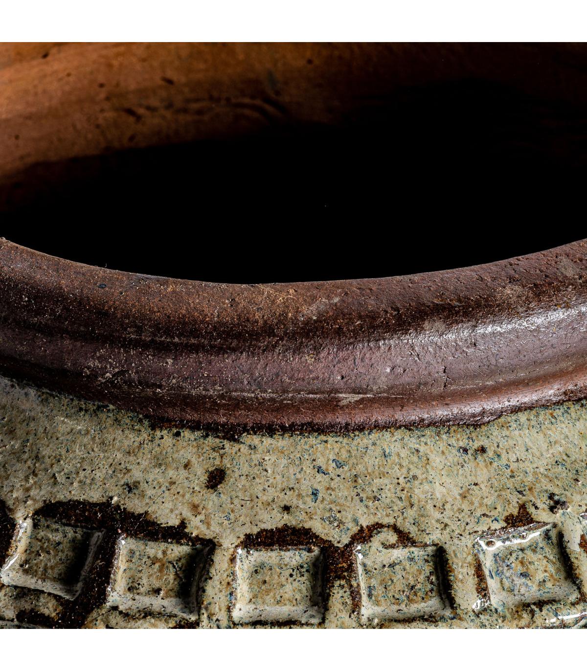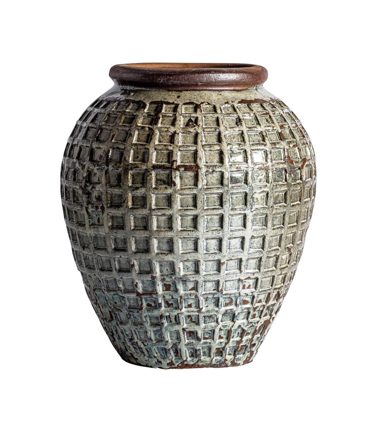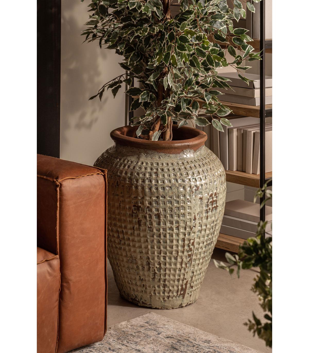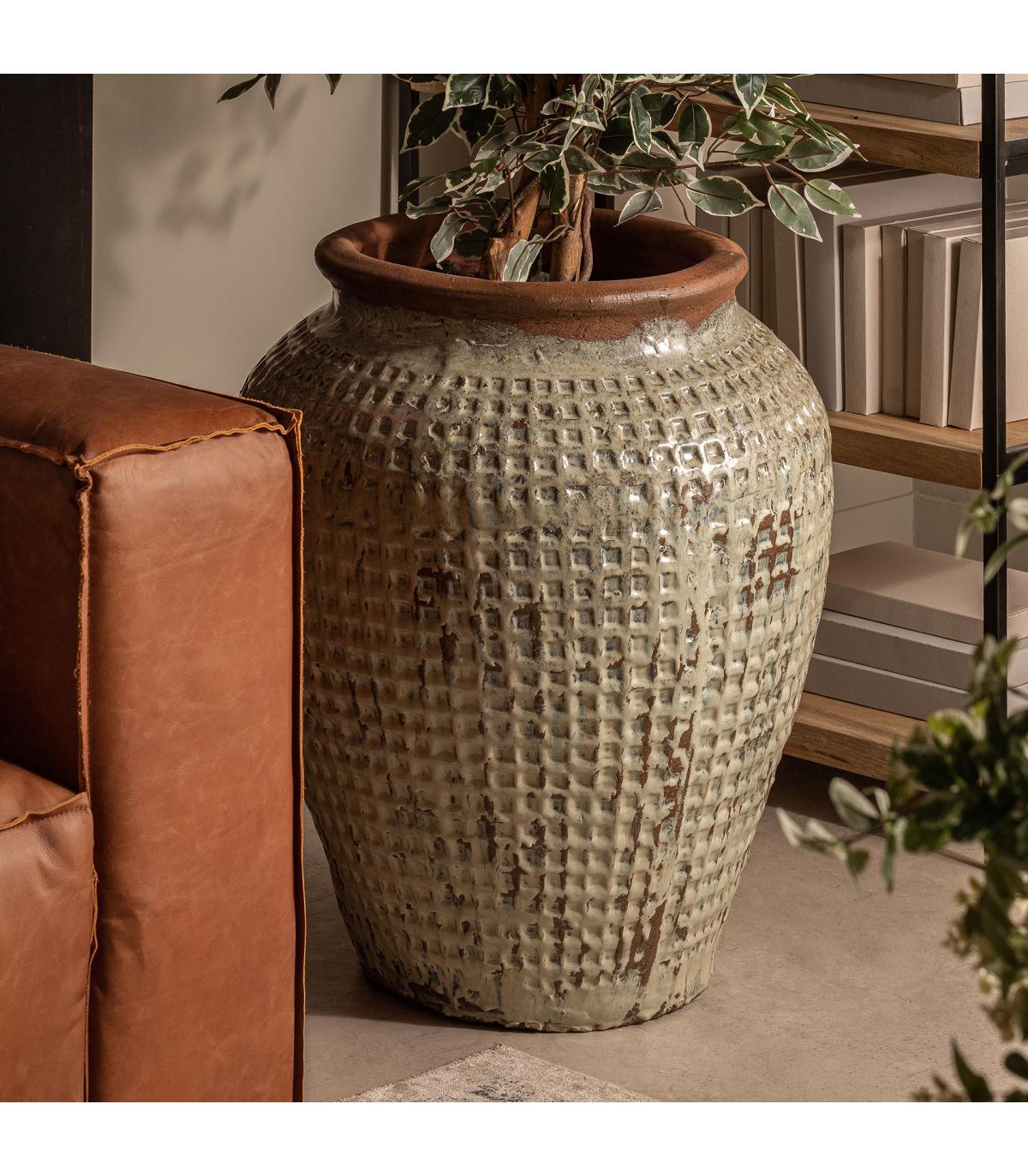 Tinaja blegy de estilo clásico fabricado en cerámica en color tonos en verde con acabado envejecido.