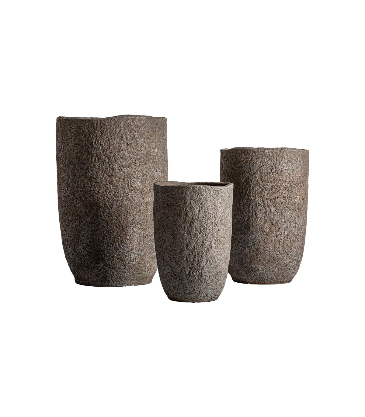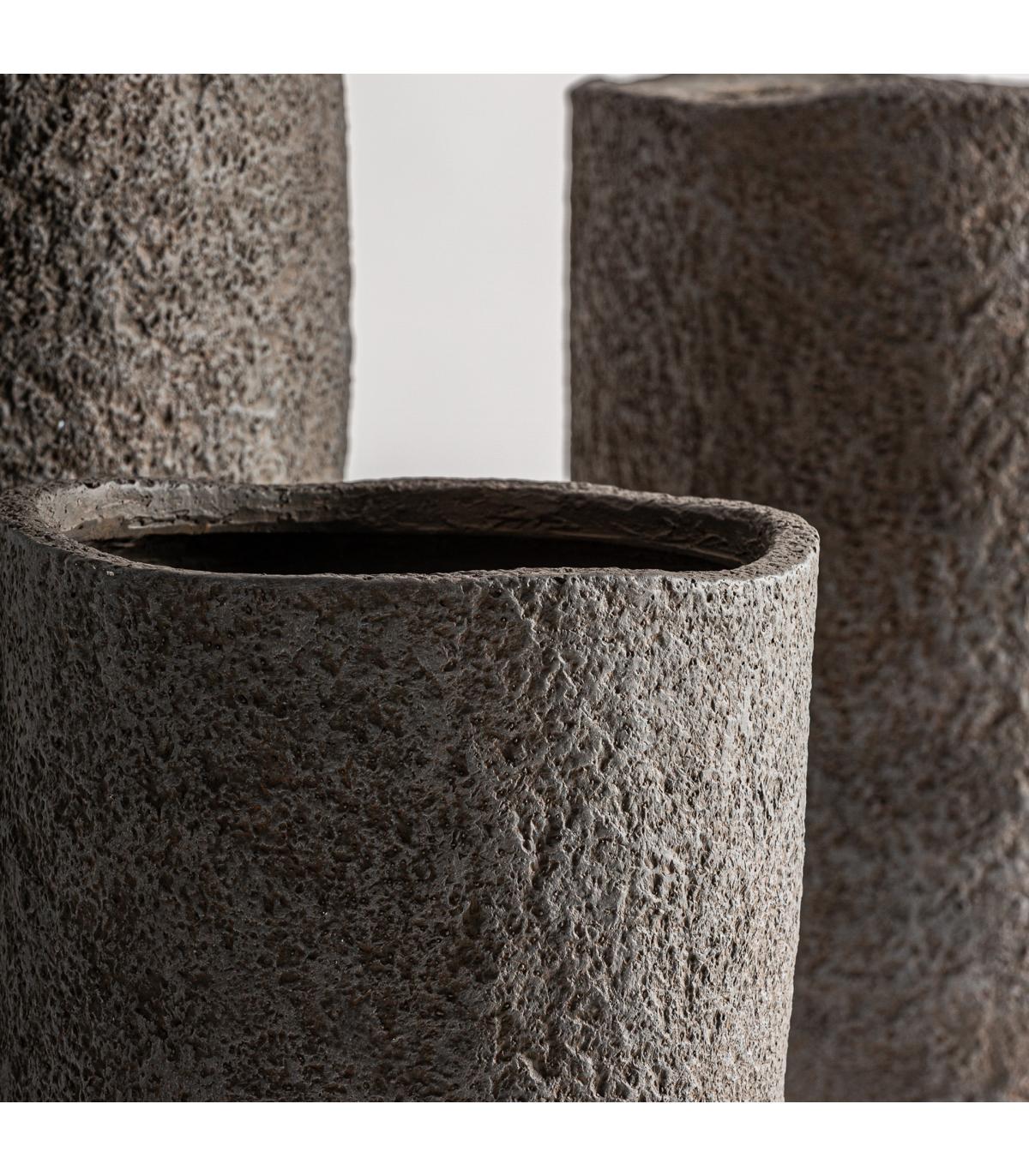 Macetero j/3 Roka de estilo minimalista, fabricado en cerámica en color gris con acabado rugoso. Producto apilable.