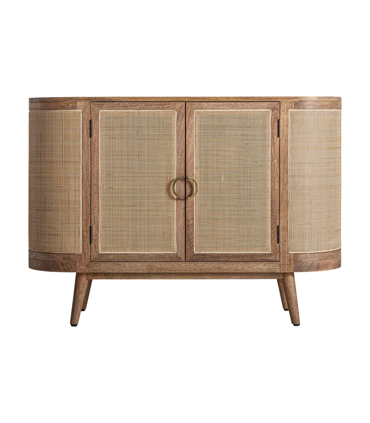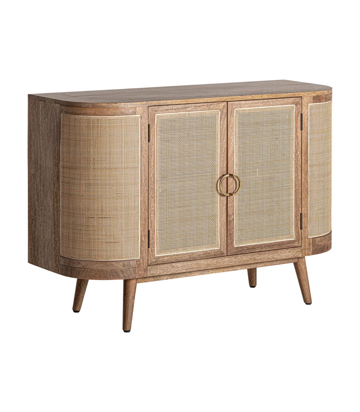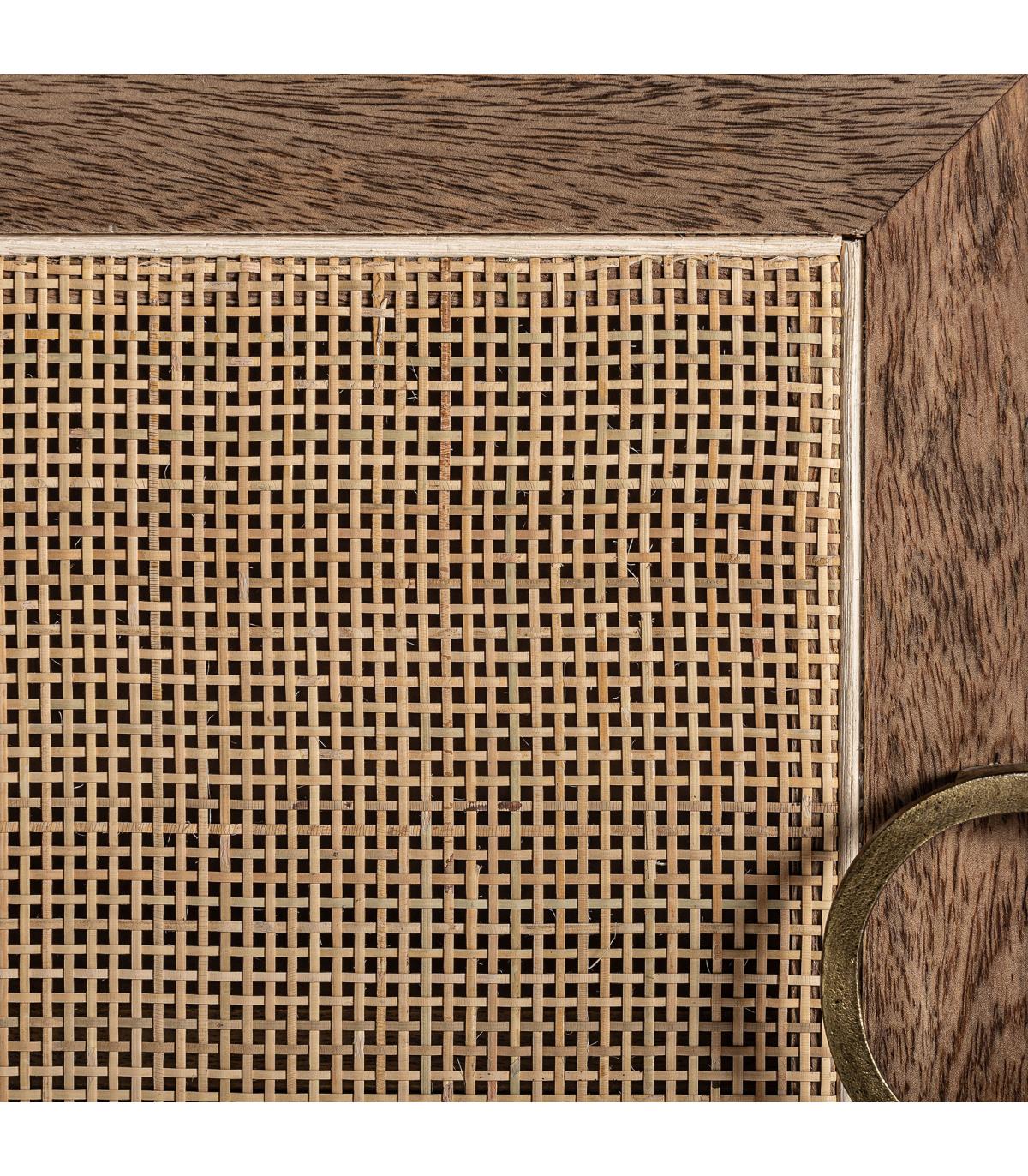 Aparador beckley de estilo nórdico fabricado en madera de mango en color marrón y mimbre en color marrón claro.