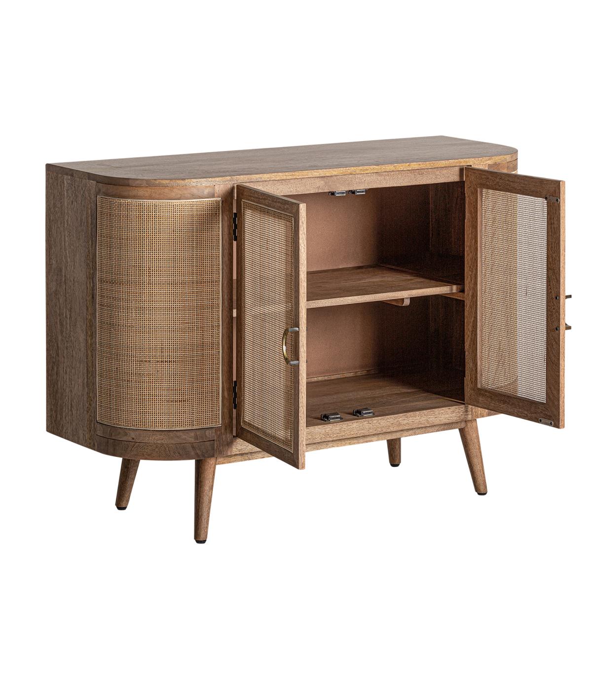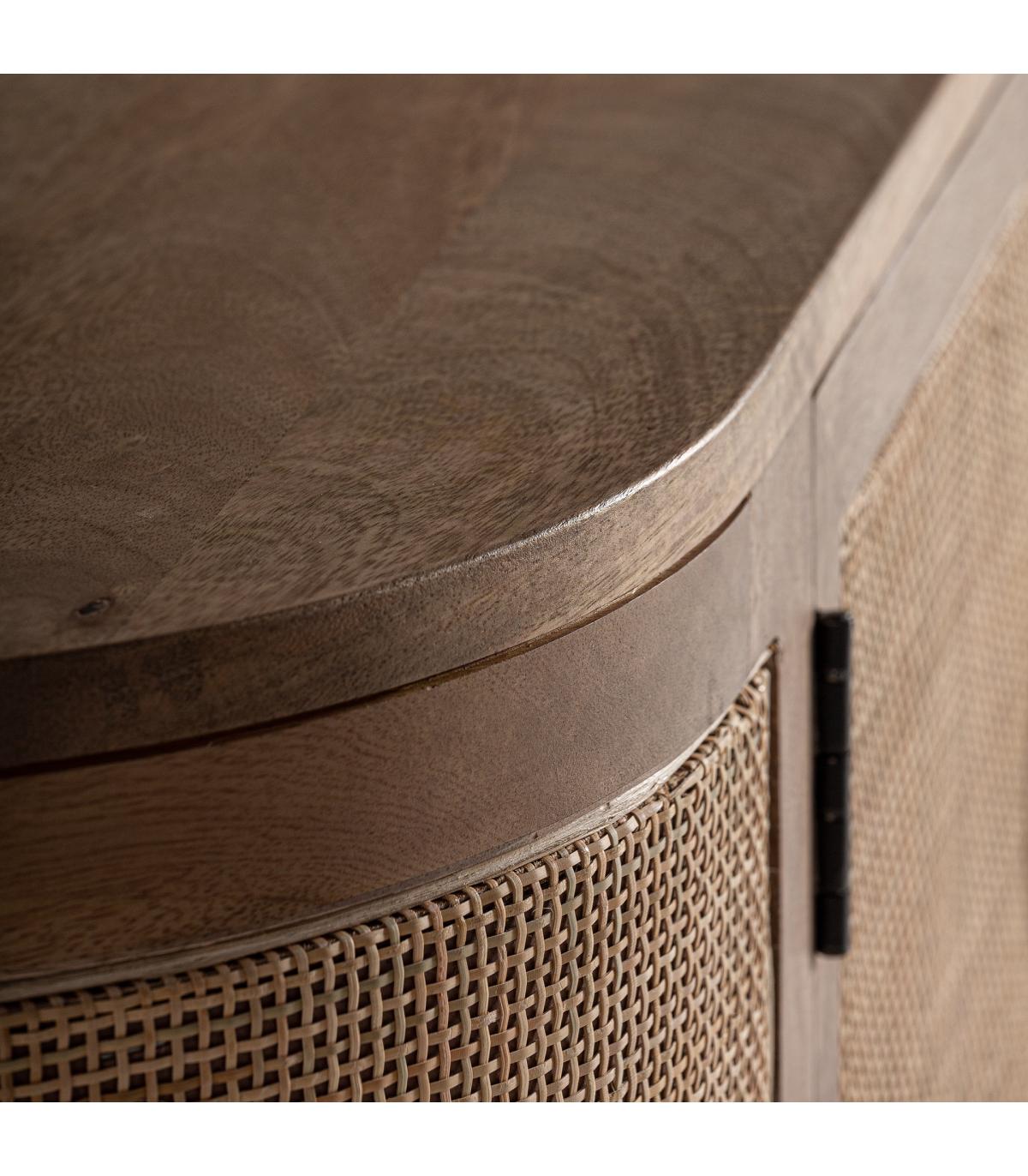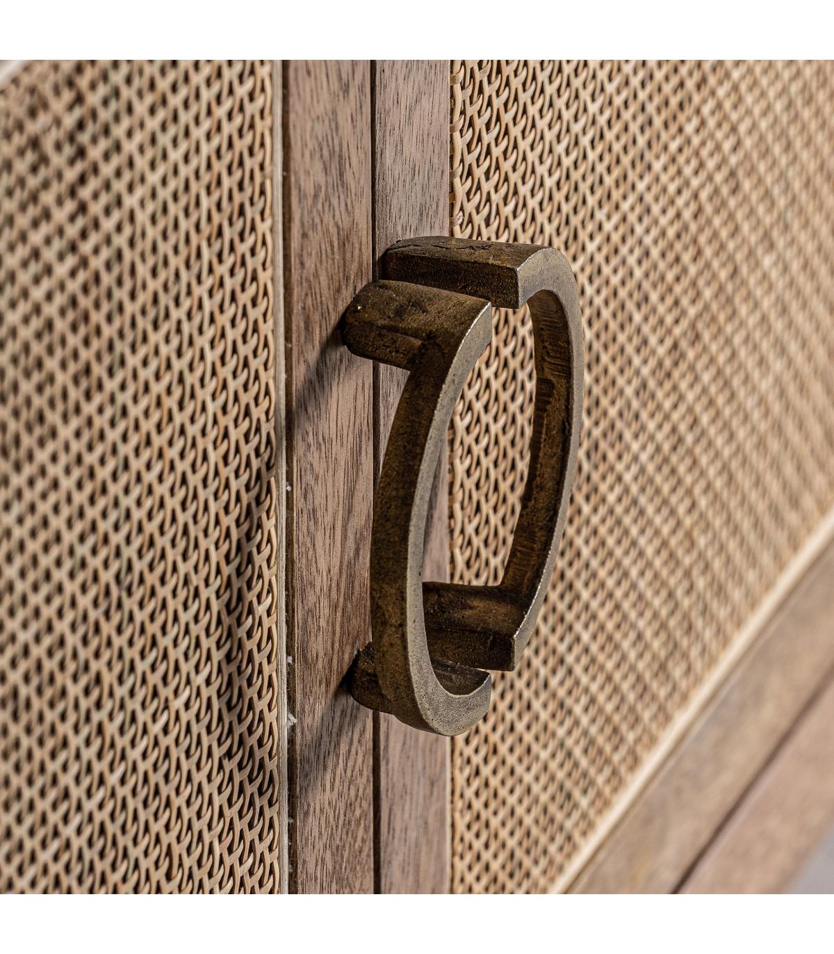 Aparador beckley de estilo nórdico fabricado en madera de mango en color marrón y mimbre en color marrón claro.