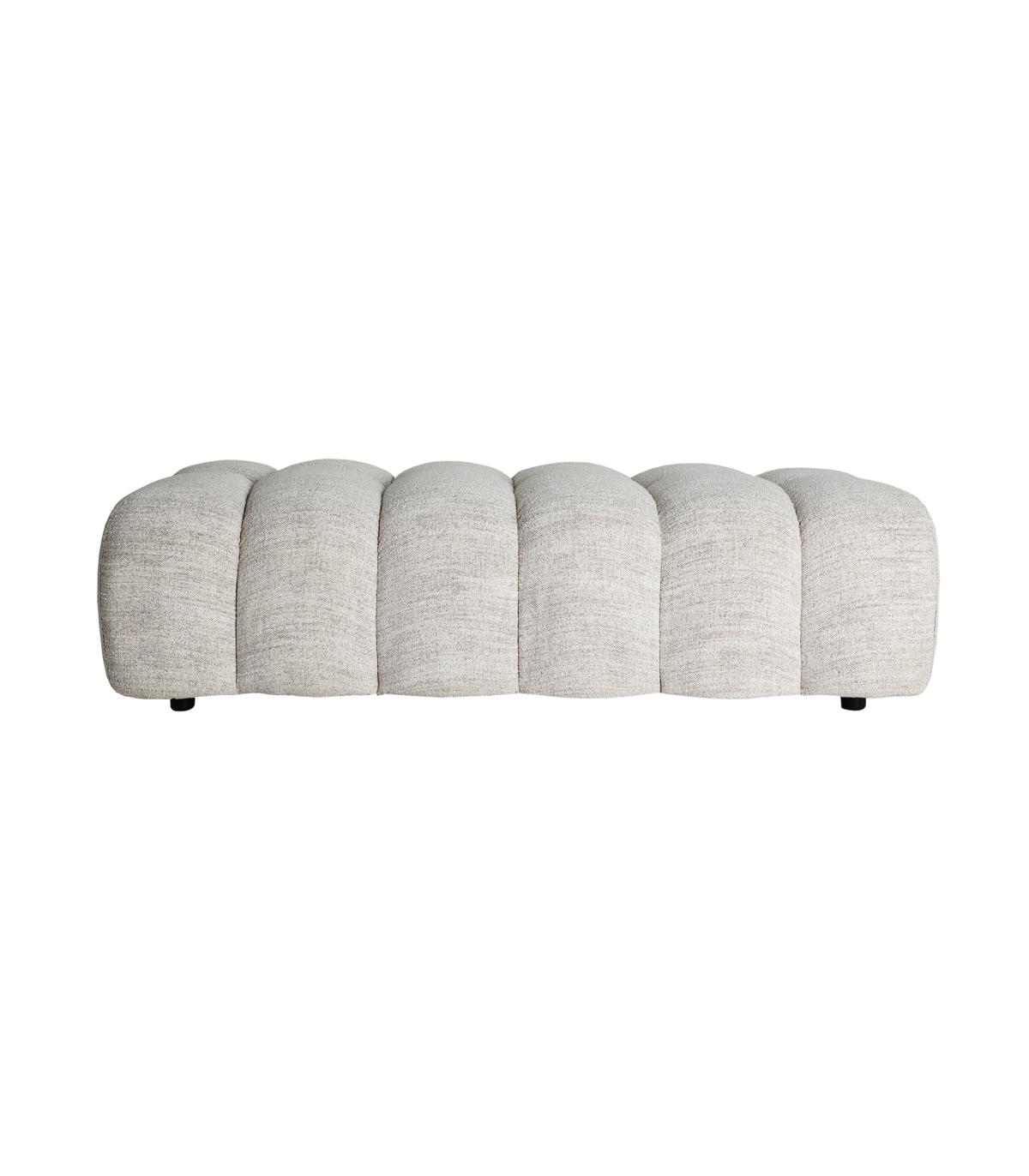 Pie de cama Sedrun de estilo contemporáneo, fabricado en poliéster en color beige, combinado con madera dm.