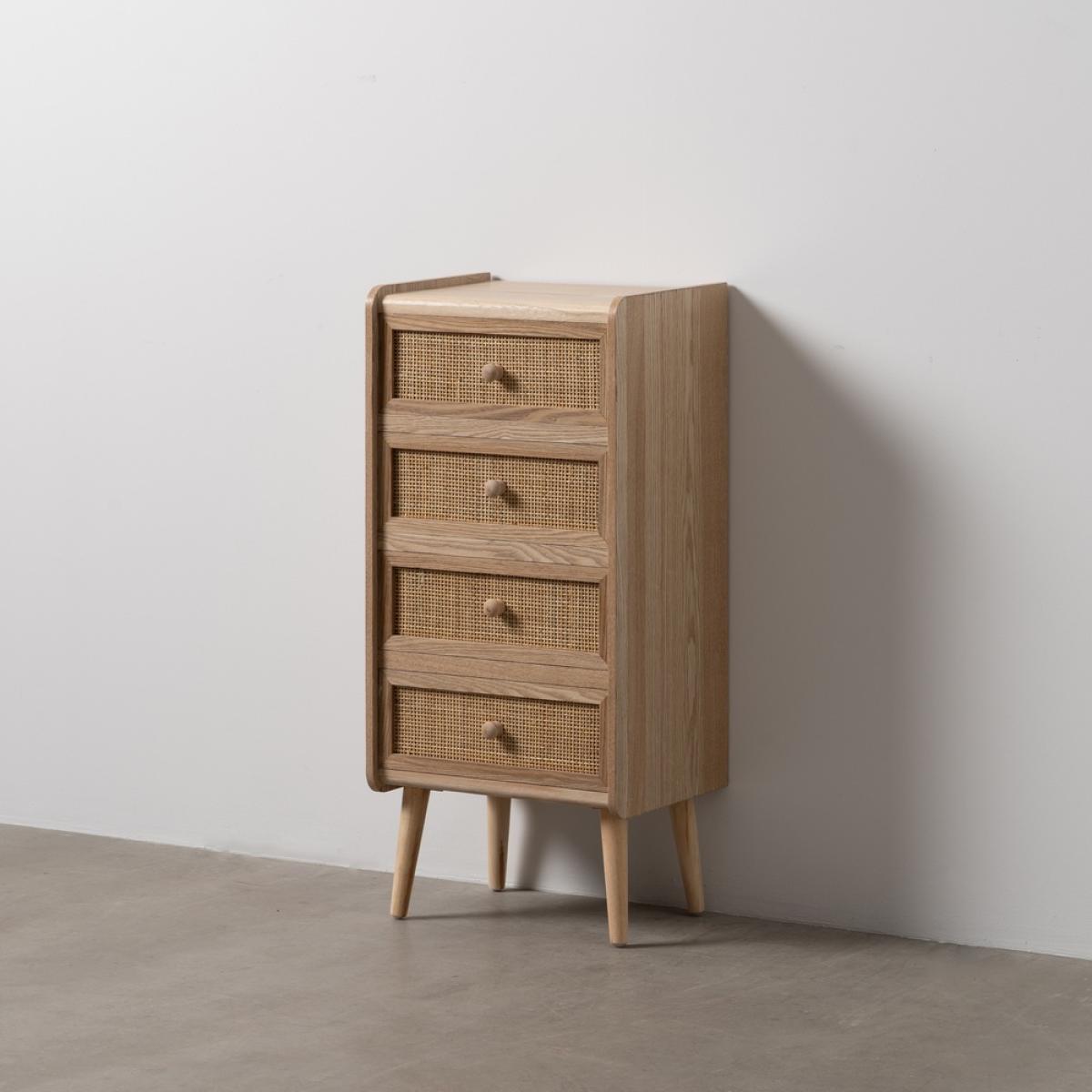 SINFONIER NATURAL MADERA PAULONIA/DM 40 X 30 X 87 CM Material 4 cajones: DM y ratán. Medidas cajones: 37.5x14,5cm. Peso soportado en cada cajón: 8kgs. Material de la estructura: DM y madera de Paulonia. Material tiradores: Madera de pino. Altura de las patas:19,5 cm.