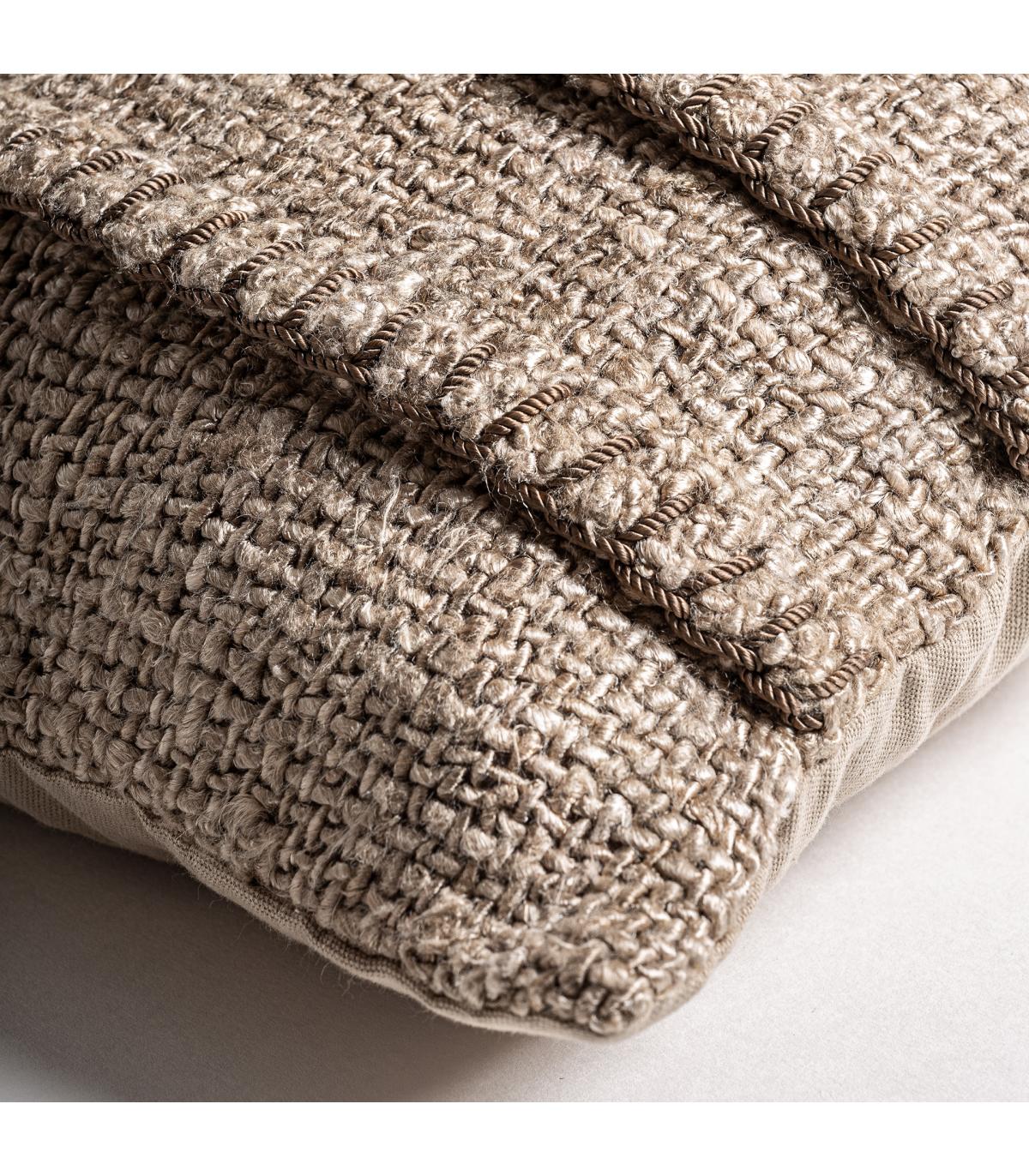 Cojín azai de estilo clásico fabricado en algodón en color arena combinado con viscosa y guata sintética. Producto desenfundable.