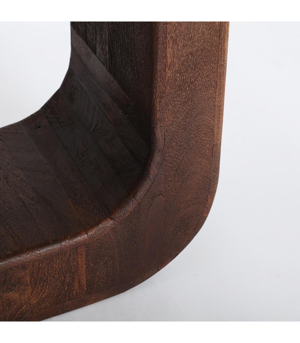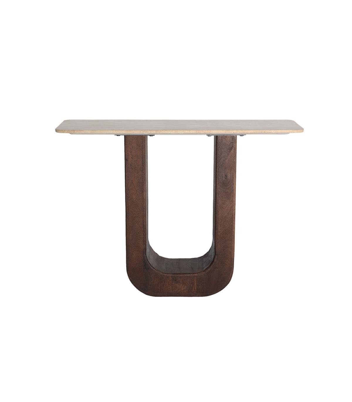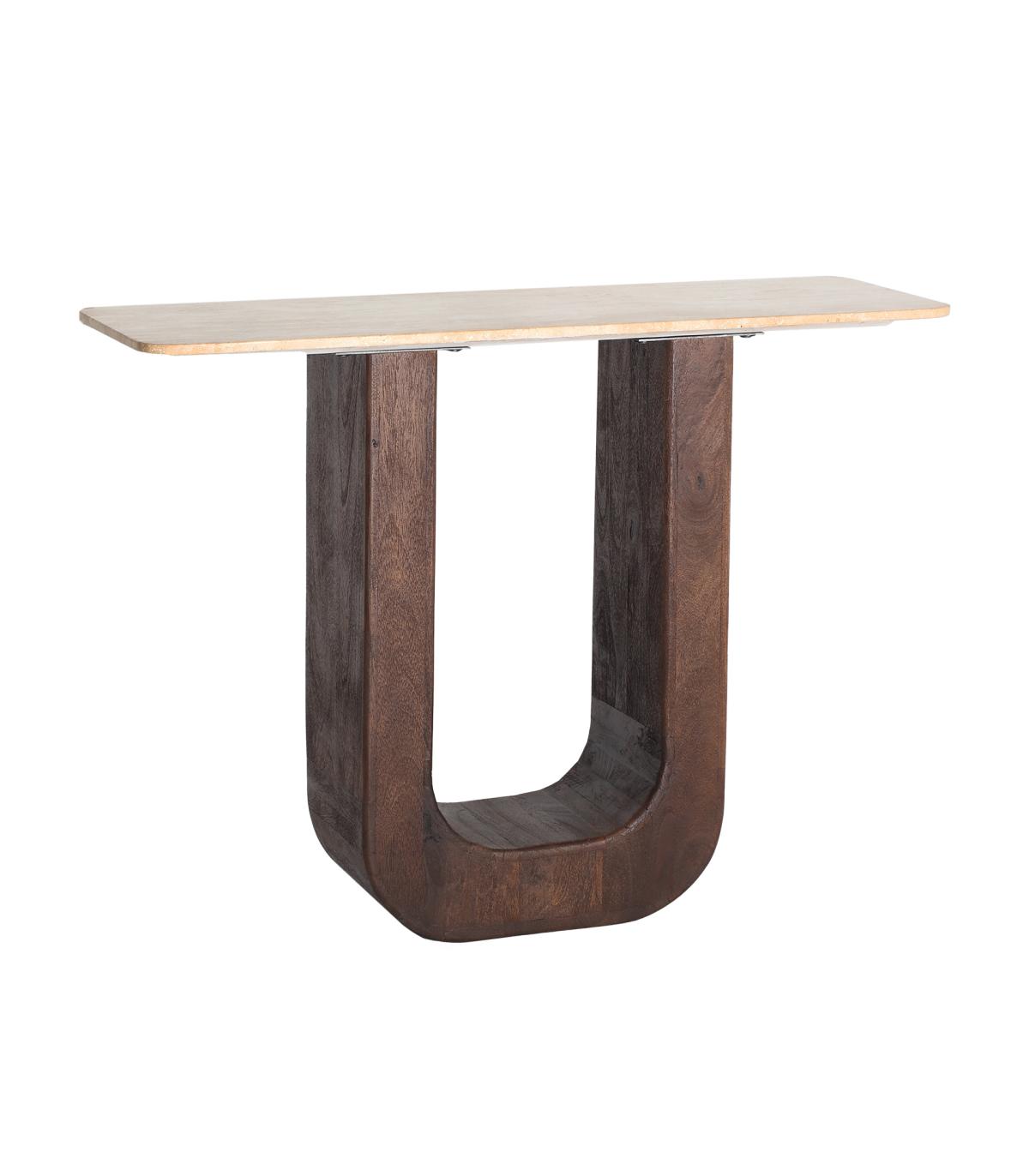 Consola Loop de estilo contemporáneo, fabricado en madera de mango en color marrón, combinado con mármol en color beige. Producto desmontable.