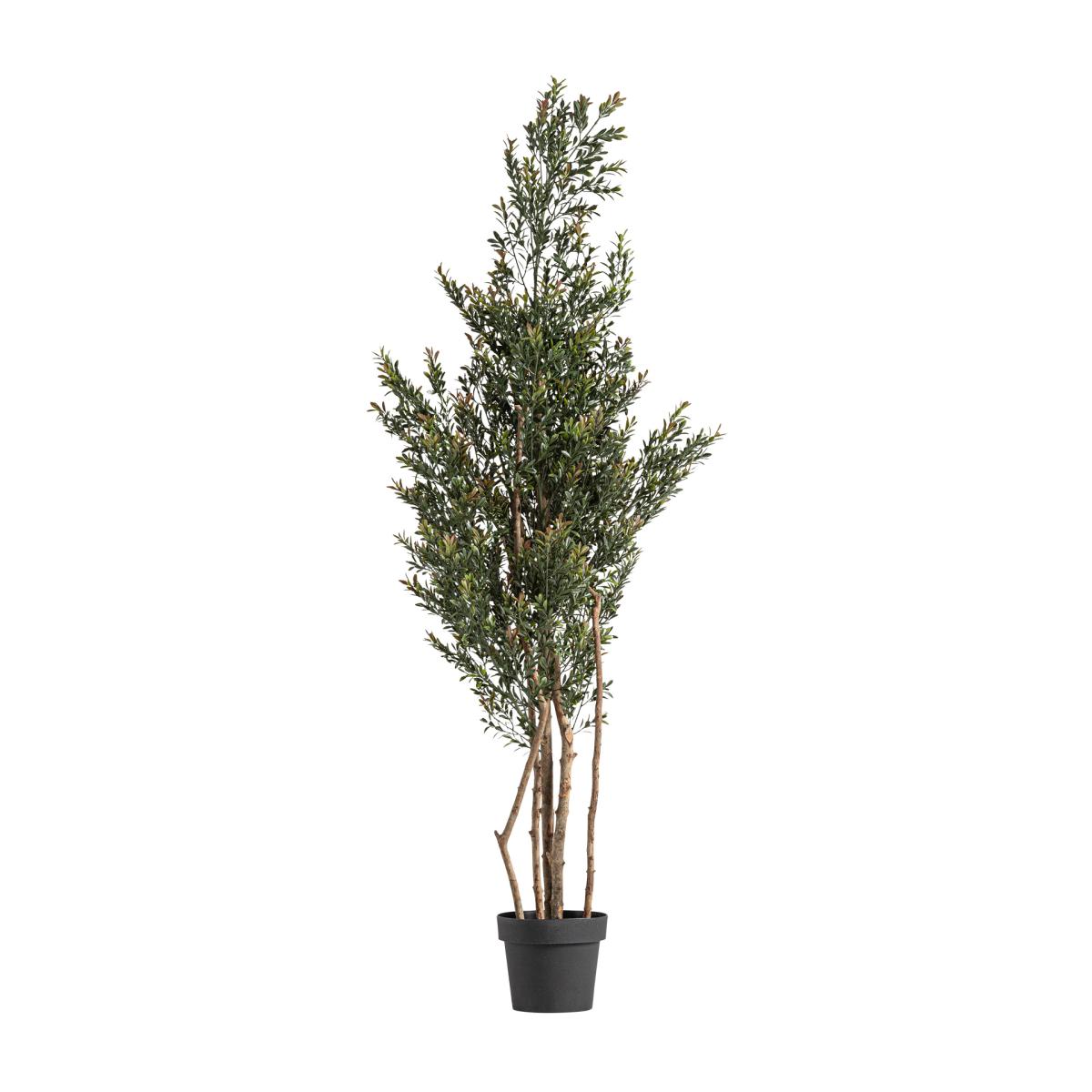 Planta Boj de estilo clásico fabricado en polietileno en color verde combinado con polipropileno en color negro y madera en color marrón.
