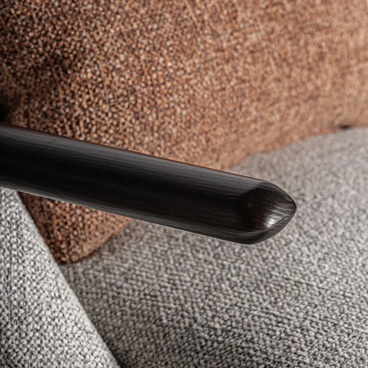 Sillón herzele de estilo contemporáneo fabricado en madera de pino en color marrón combinado con poliéster en color gris con acabado jaspeado y metal en color negro.