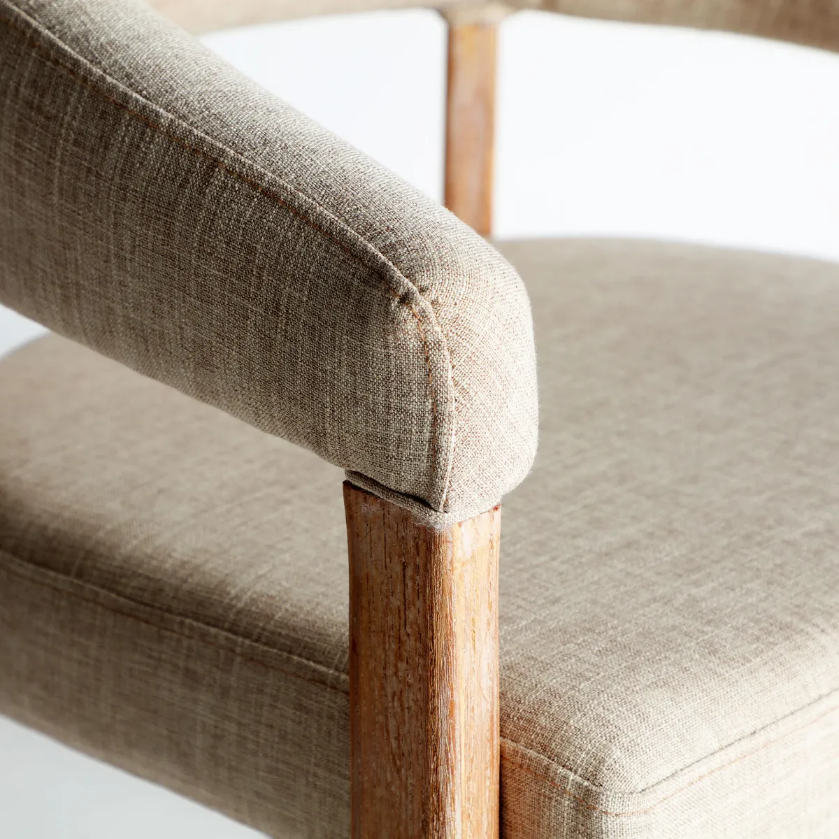 Silla Kai de estilo contemporáneo, fabricado en madera de olmo en color marrón claro, combinado con lino en color beige.