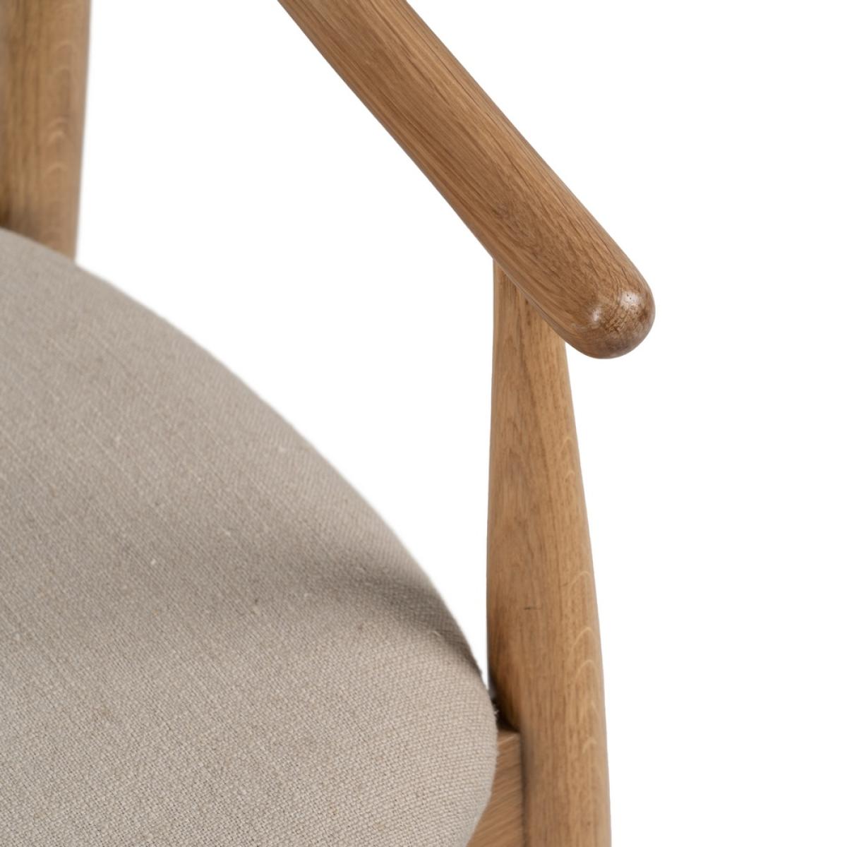 SILLA NATURAL TEJIDO-MADERA SALÓN 56,50 X 57 X 76,50 CM Estructura madera de roble. Altura del asiento:46cm. Altura de las patas:37cm Altura del respaldo:35cm. Distancia entre las patas:50cm Altura de los brazos desde el asiento:24,5cm. Composición cojines: Lino, acrílico, viscosa y poliéster. Densidad:30kg/m3 Relleno: Esponja. No apilable. No requiere montaje. Cumple con la normativa UNE-EN 12520:2015