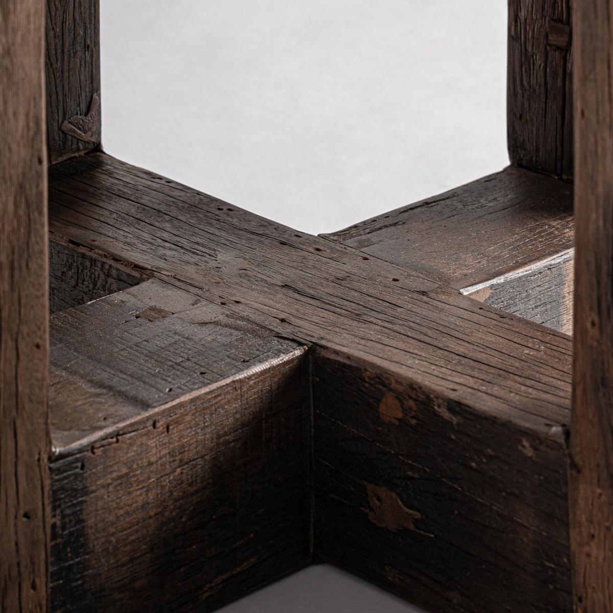 Mesa auxiliar fabricado en madera recuperada en color marrón.
