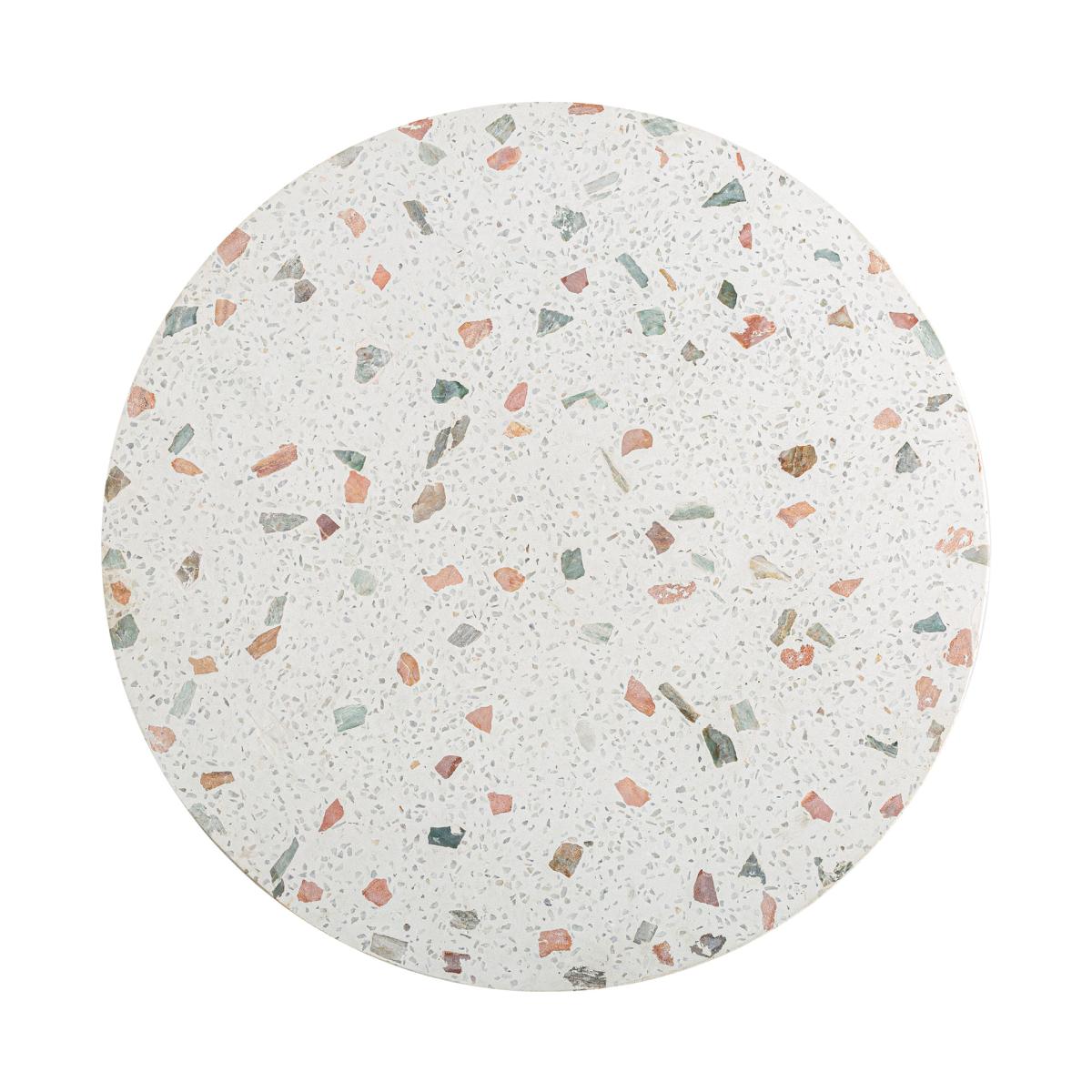 Mesa auxiliar Lautrec de estilo nórdico, fabricado en terrazo en color blanco, combinado con madera de mango en color marrón. Producto desmontable.