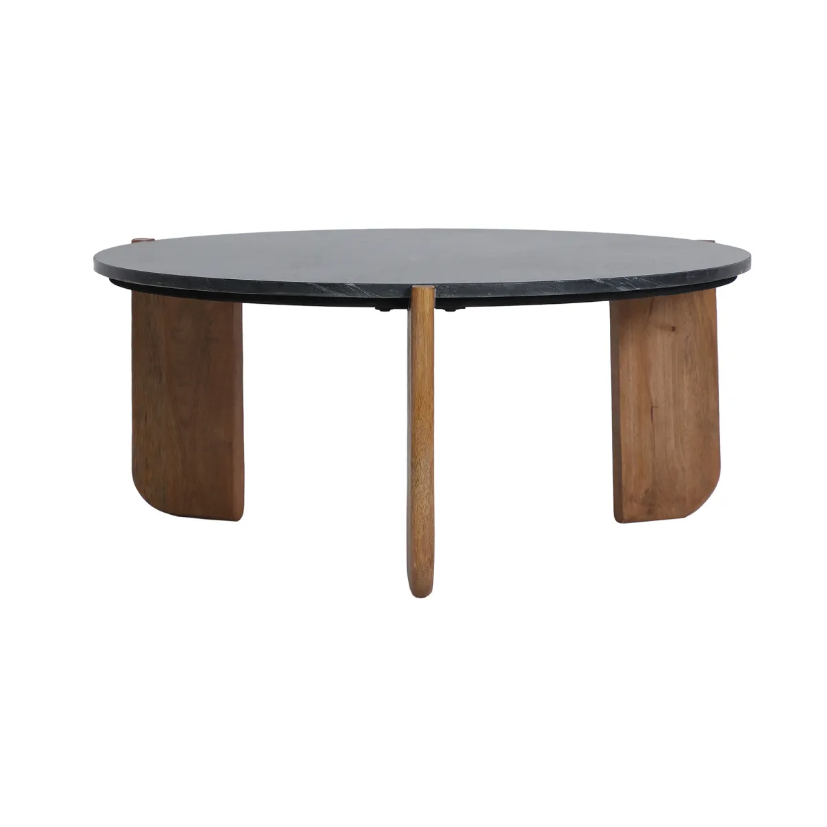 Mesa de centro Valigny de estilo contemporáneo, fabricado en mármol en color negro con acabado veteado, combinado con madera de mango en color marrón. Producto desmontable.
