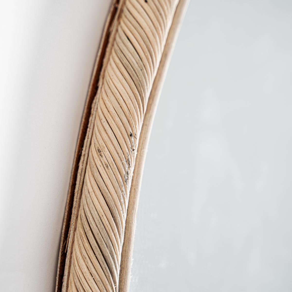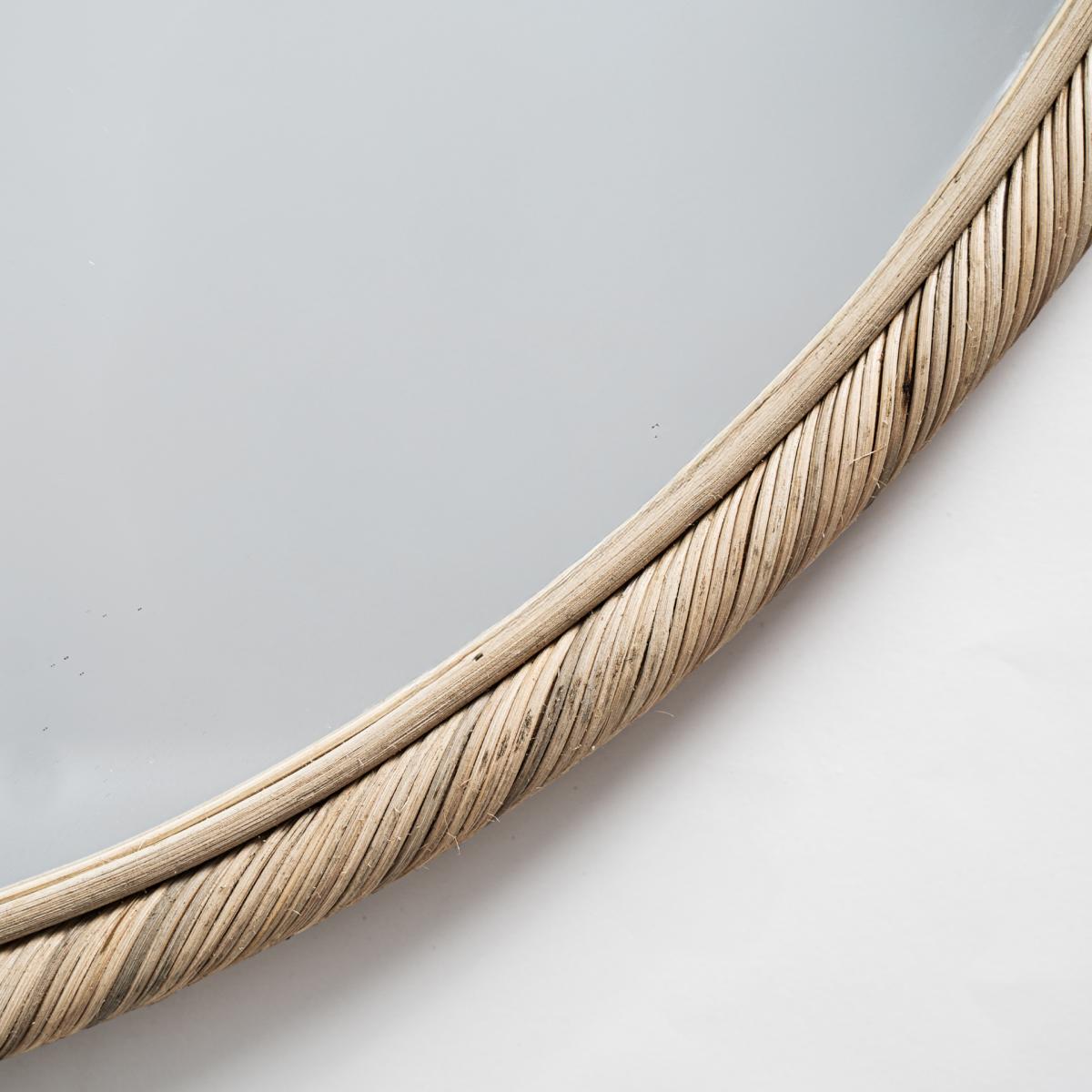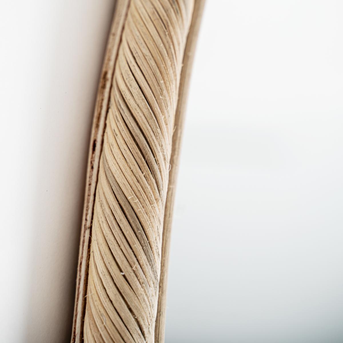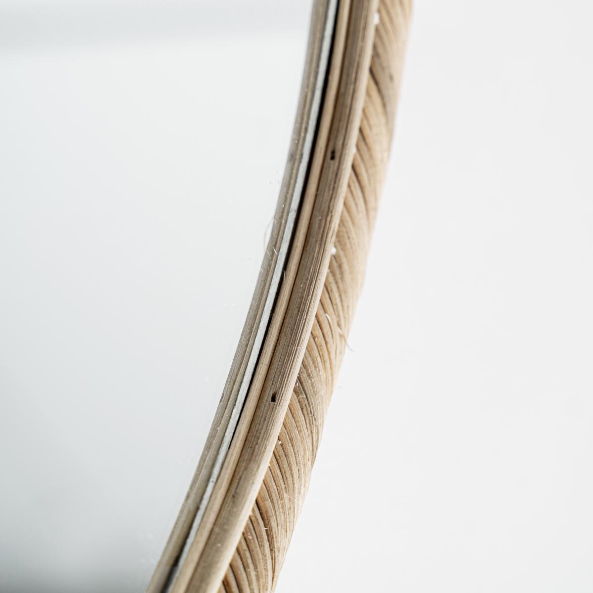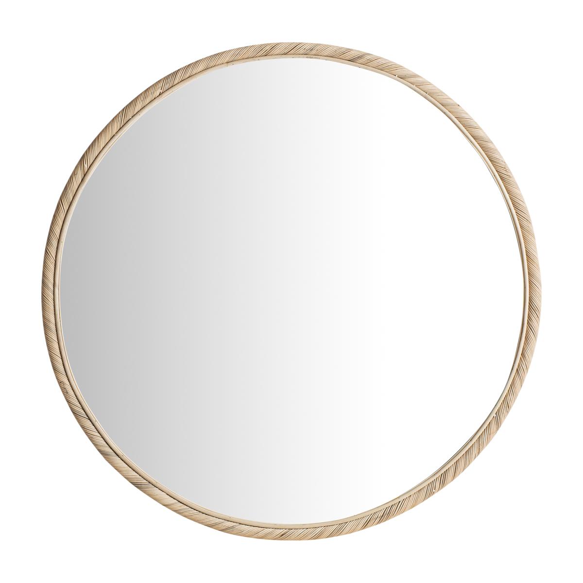 Espejo fabricado en ratán en color marrón claro.