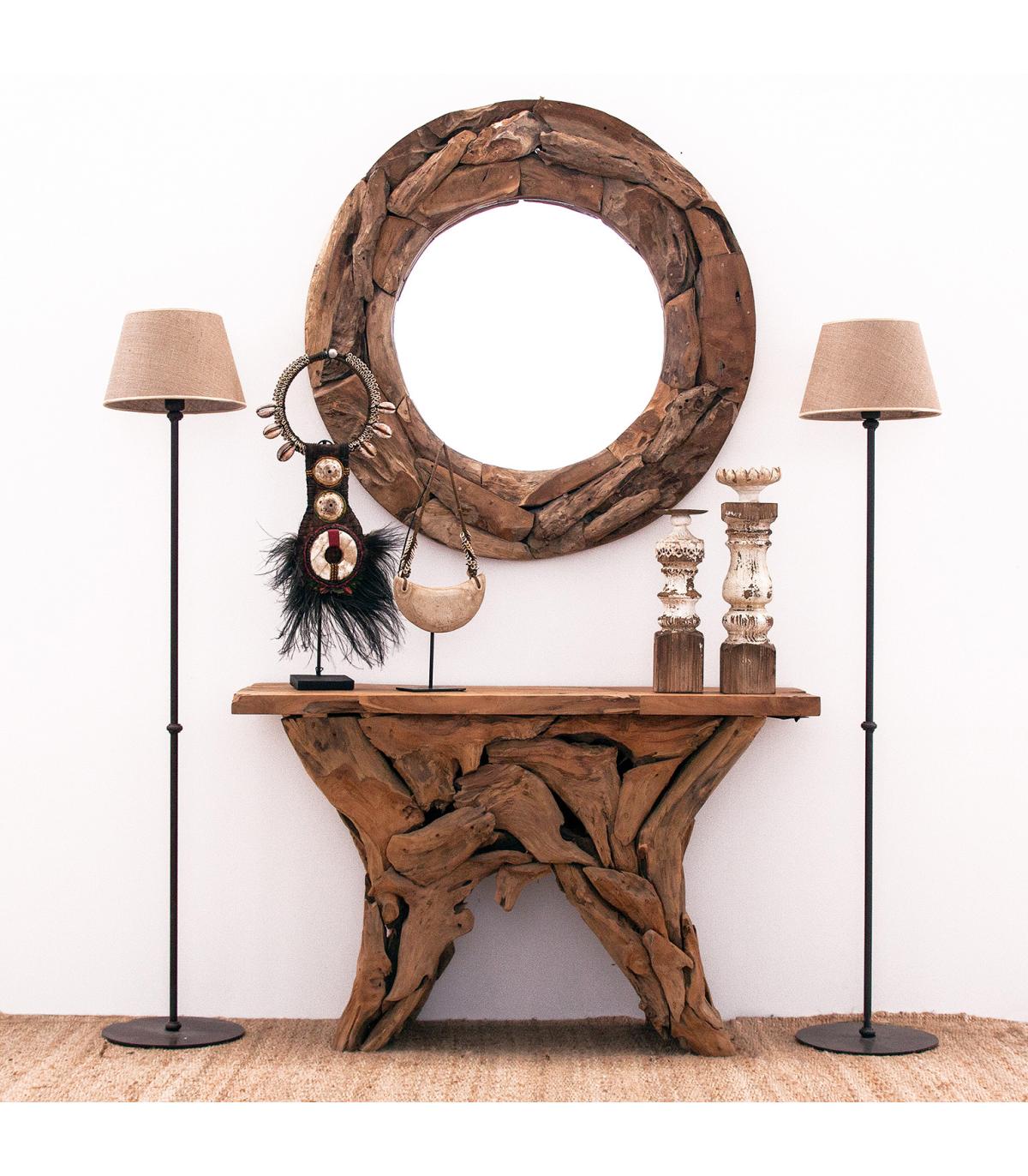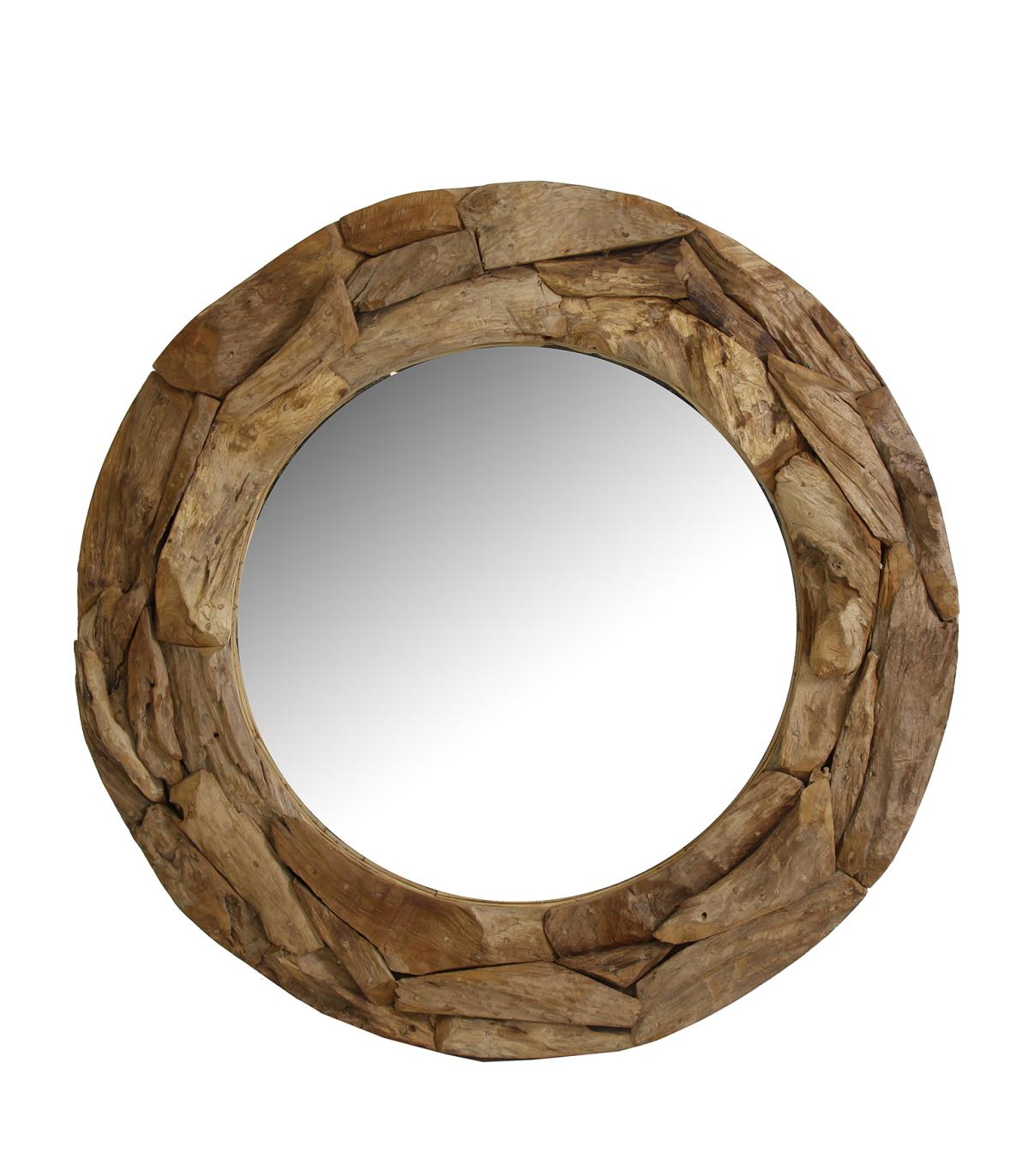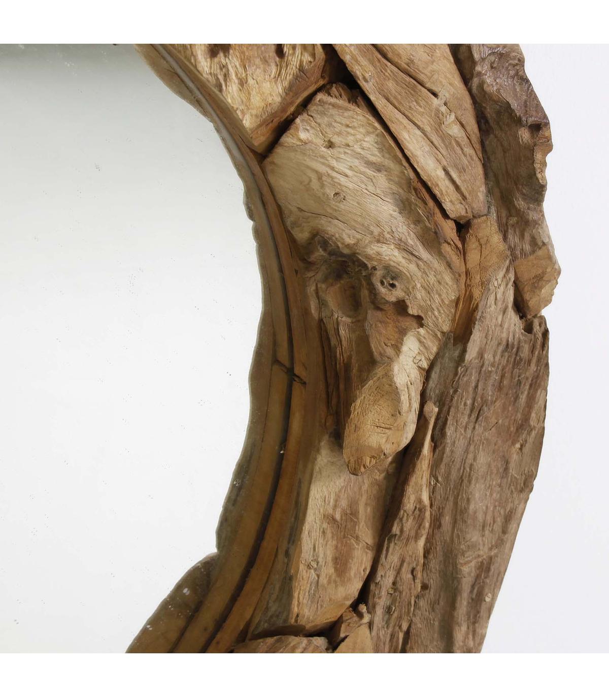 Espejo Tsumeb de estilo étnico fabricado en madera de teka en color marrón con acabado envejecido combinado con espejo.