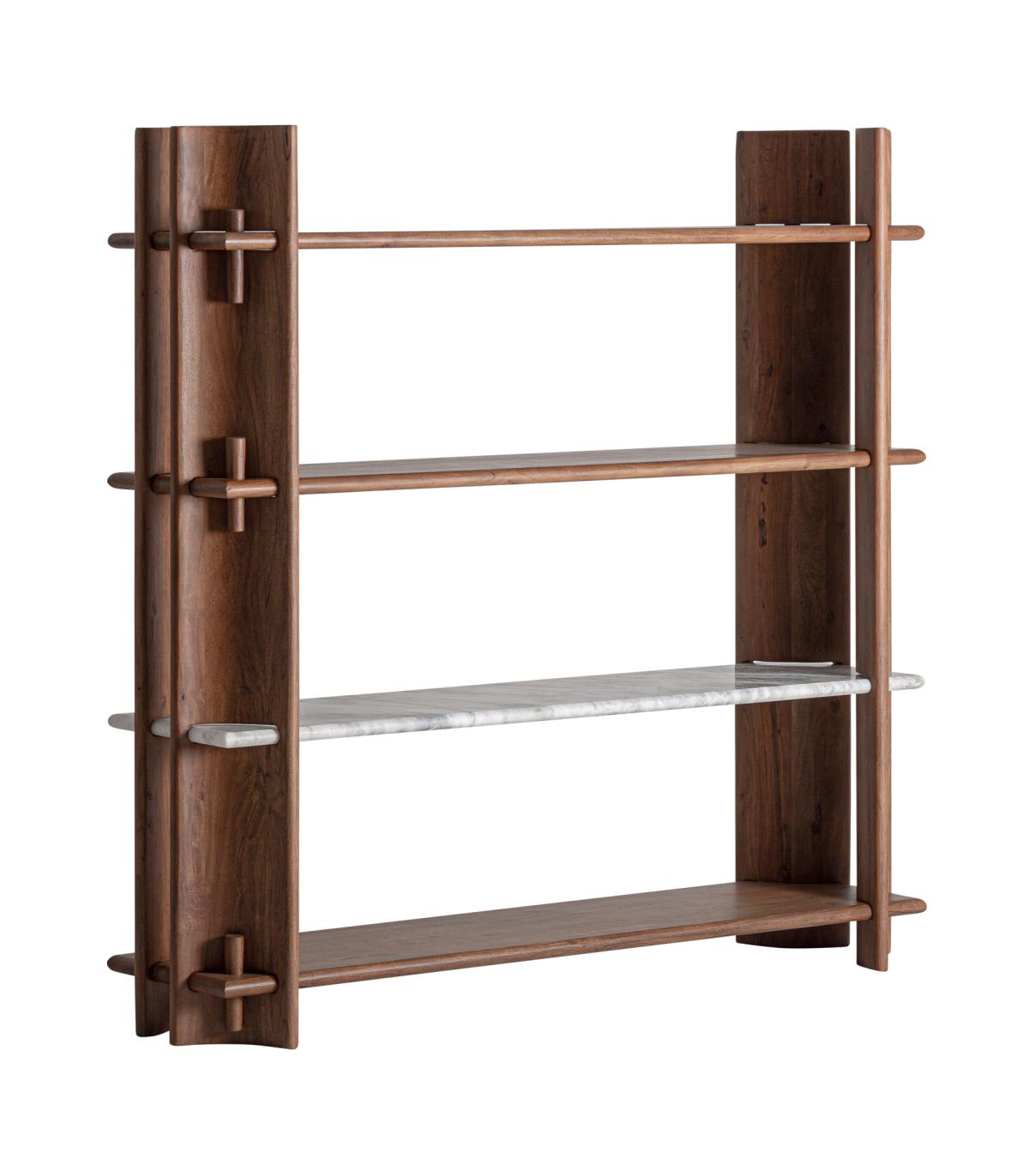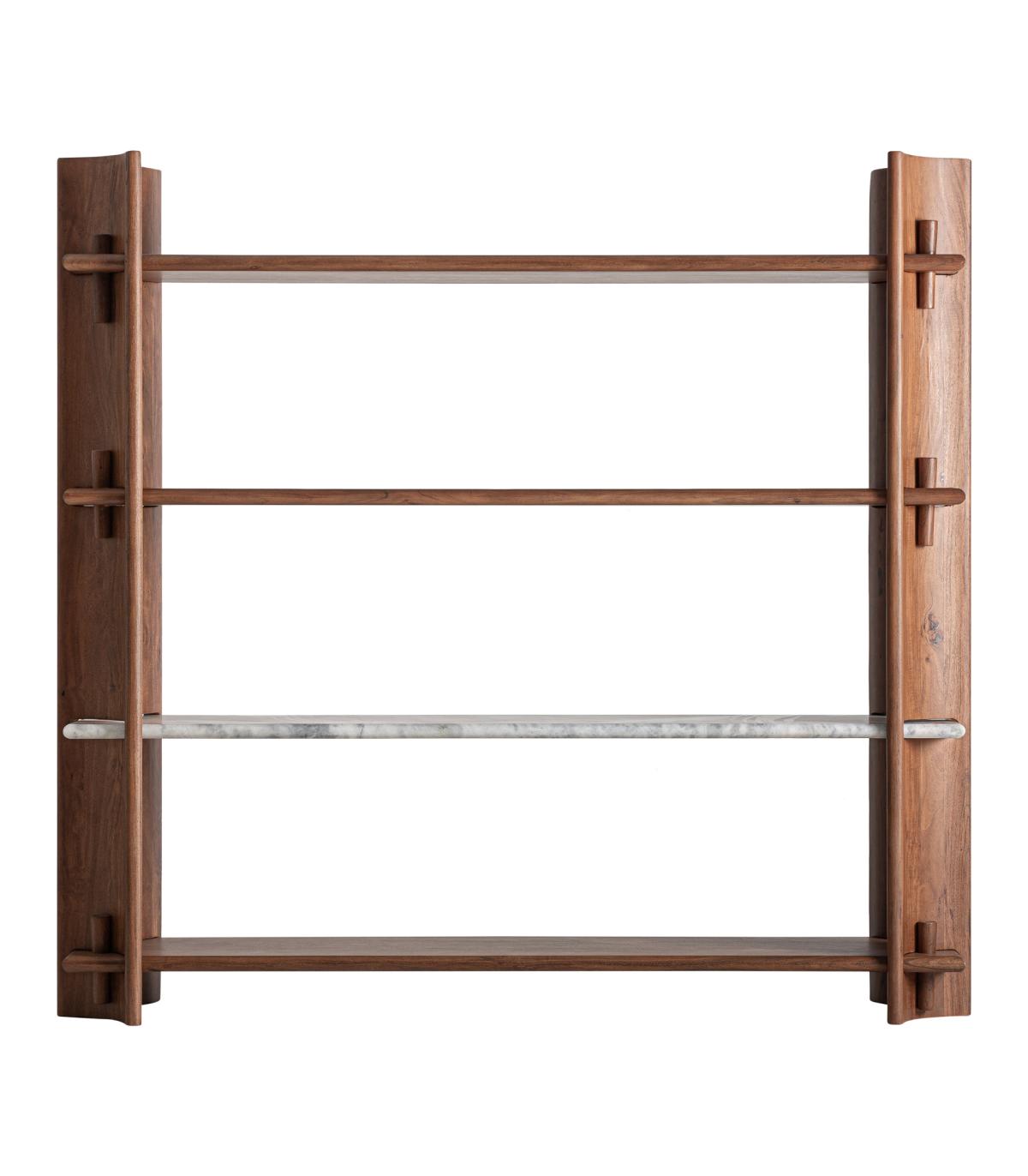 Estanteria fabricado en madera de acacia en color marrón combinado con mármol en color blanco.