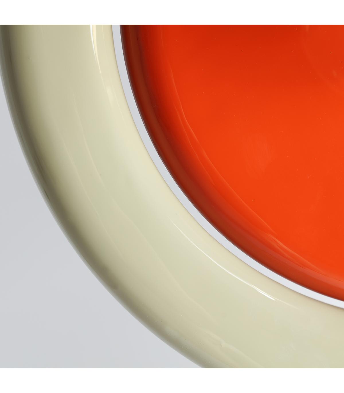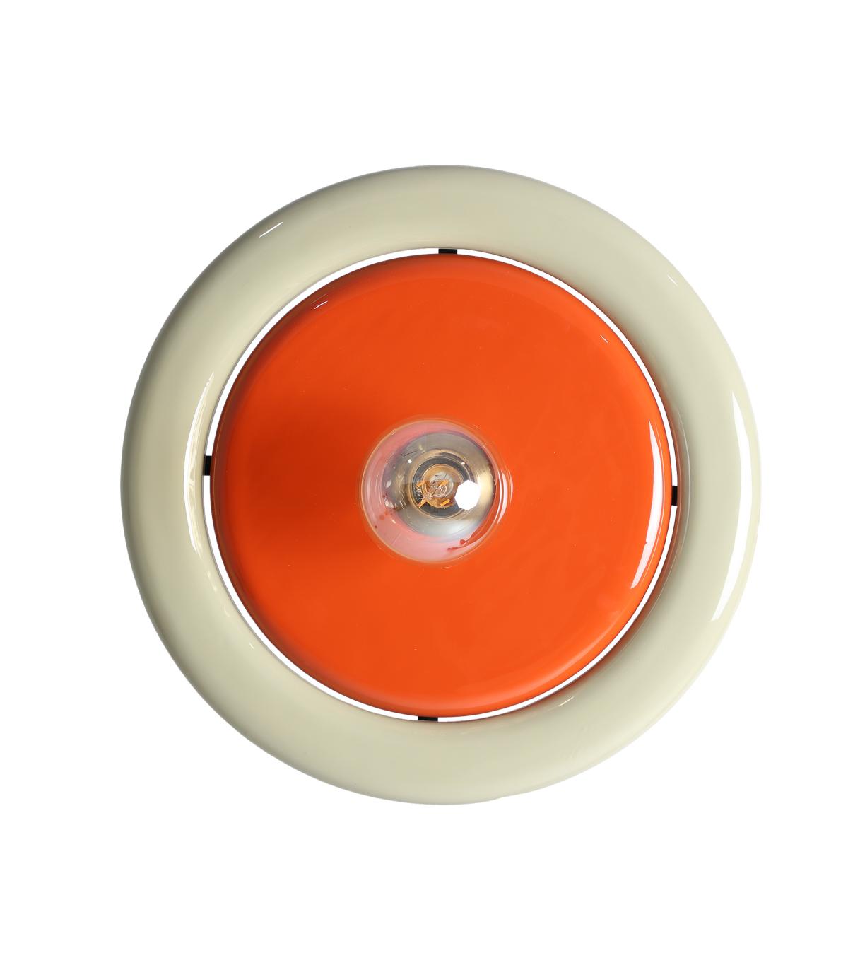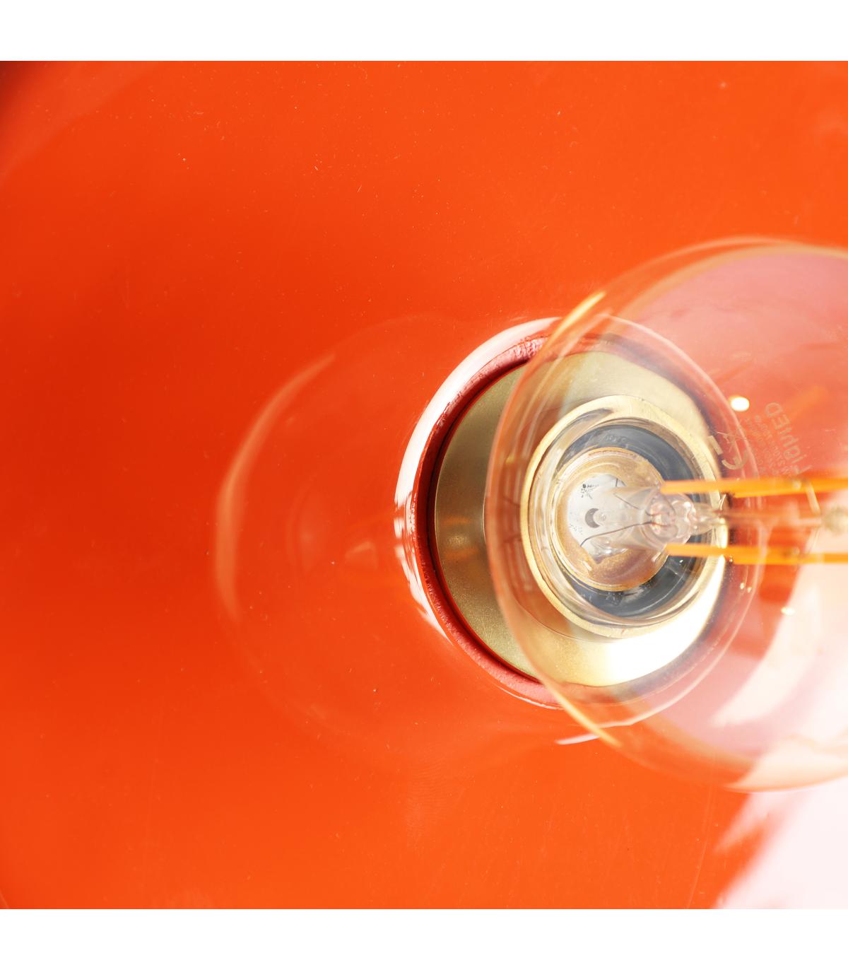 Aplique Cekle de estilo contemporáneo, fabricado en madera de mango en color naranja con acabado lacado, combinado con hierro en color crema con acabado brillo y aluminio en color dorado.