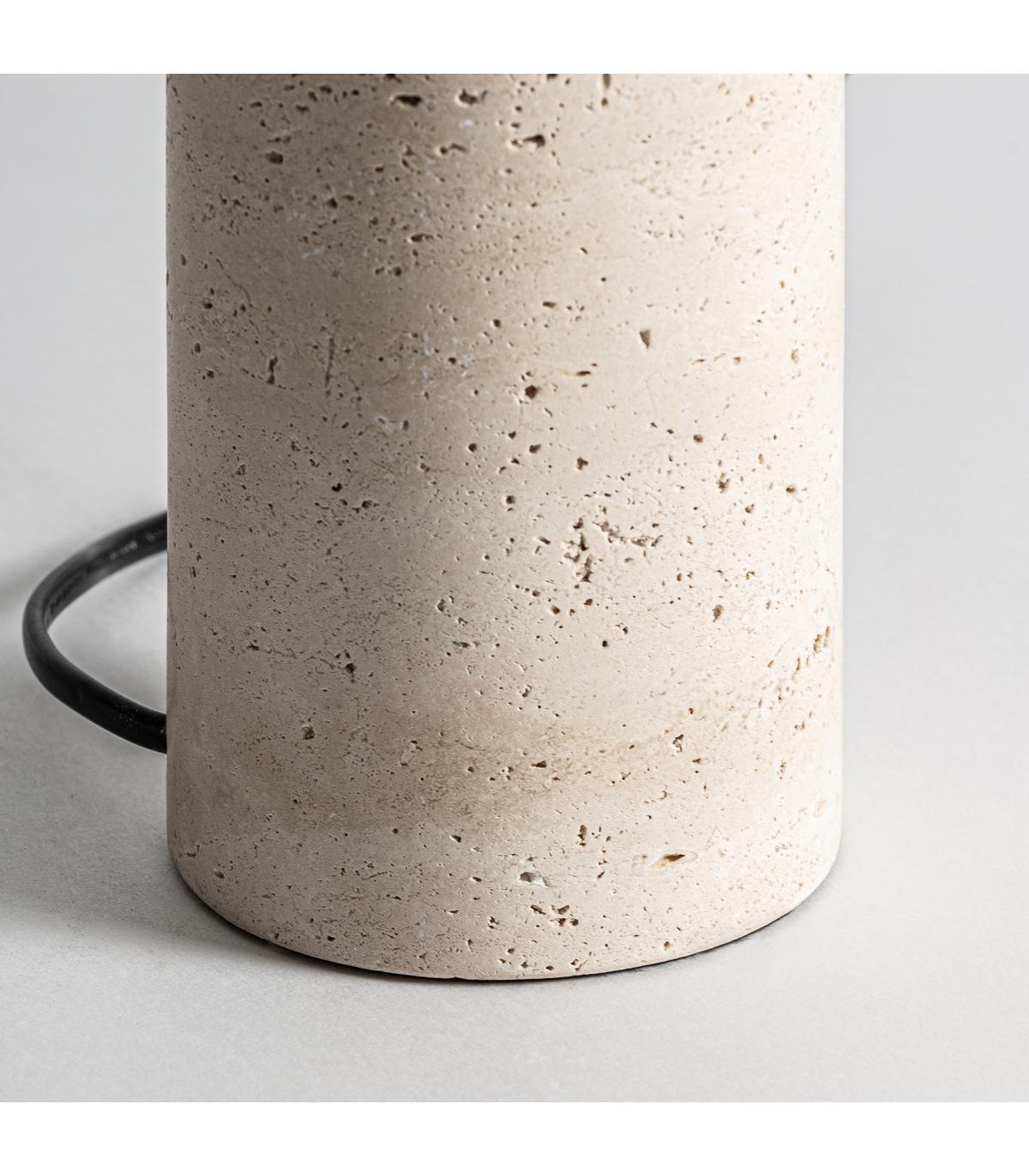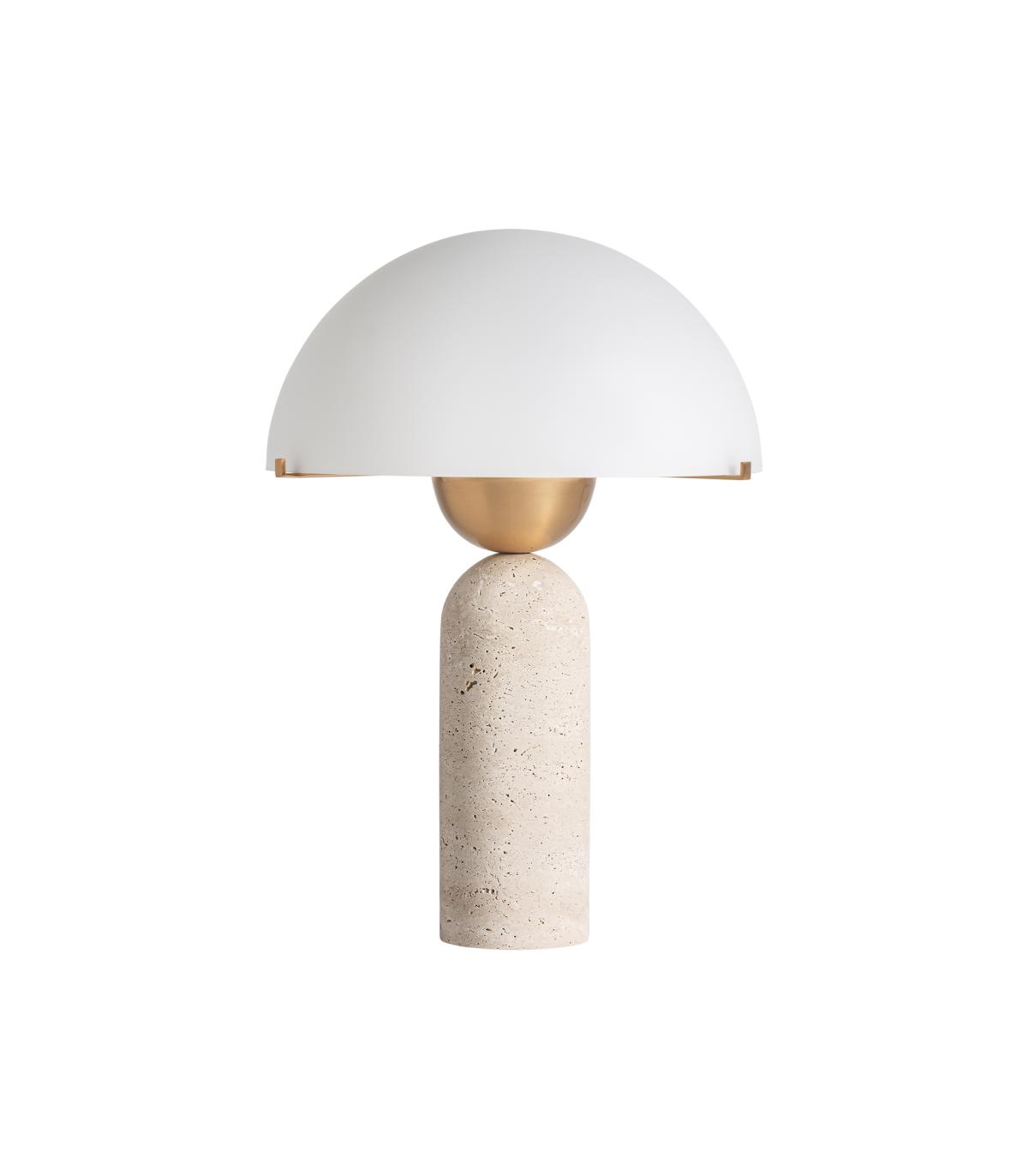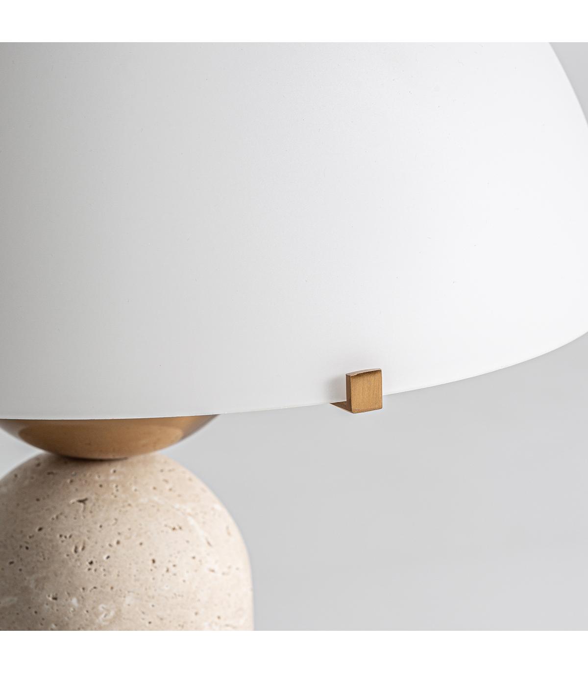 Lámpara de sobremesa de estilo art deco fabricado en mármol en color beige combinado con hierro en color oro con acabado bronce y cristal en color blanco. Producto desmontable.