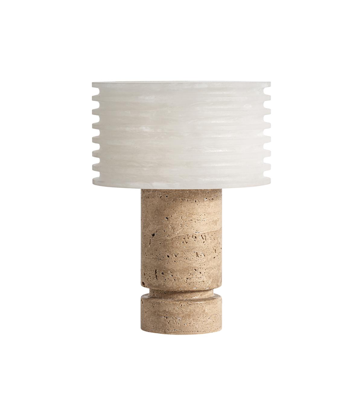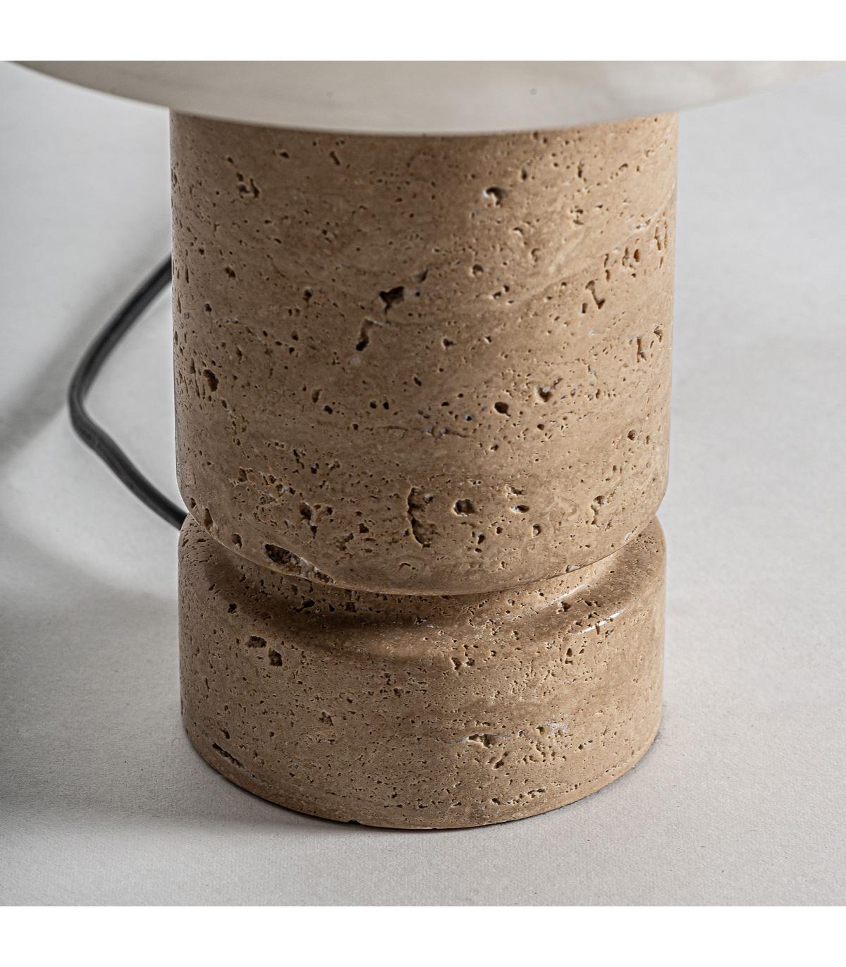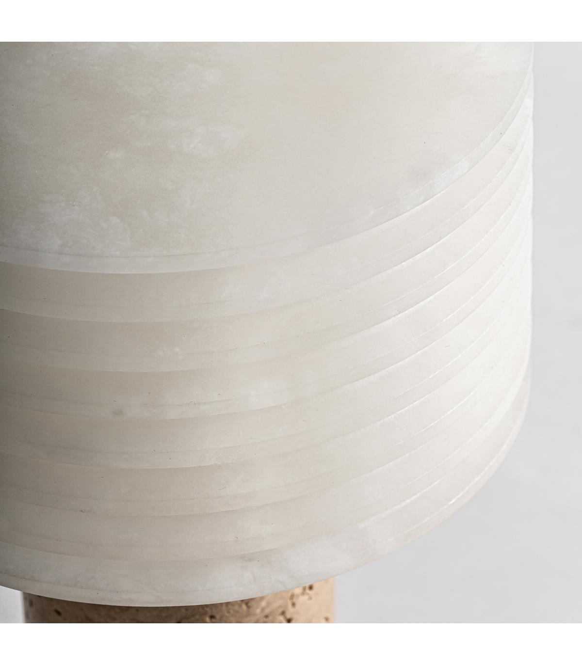 Lámpara de sobremesa de estilo art deco fabricado en cerámica en color blanco combinado con mármol en color beige y bronce. Producto desmontable.